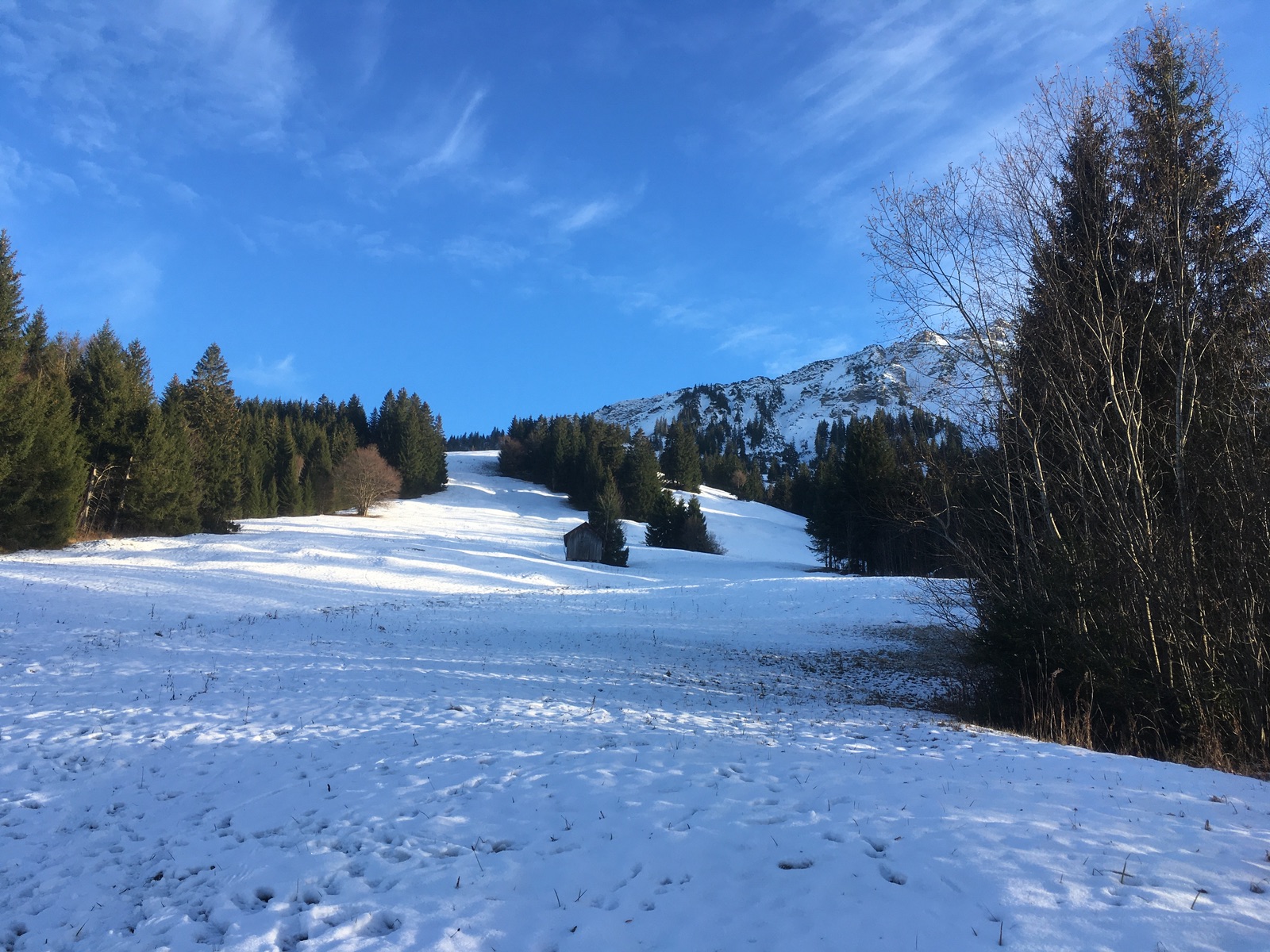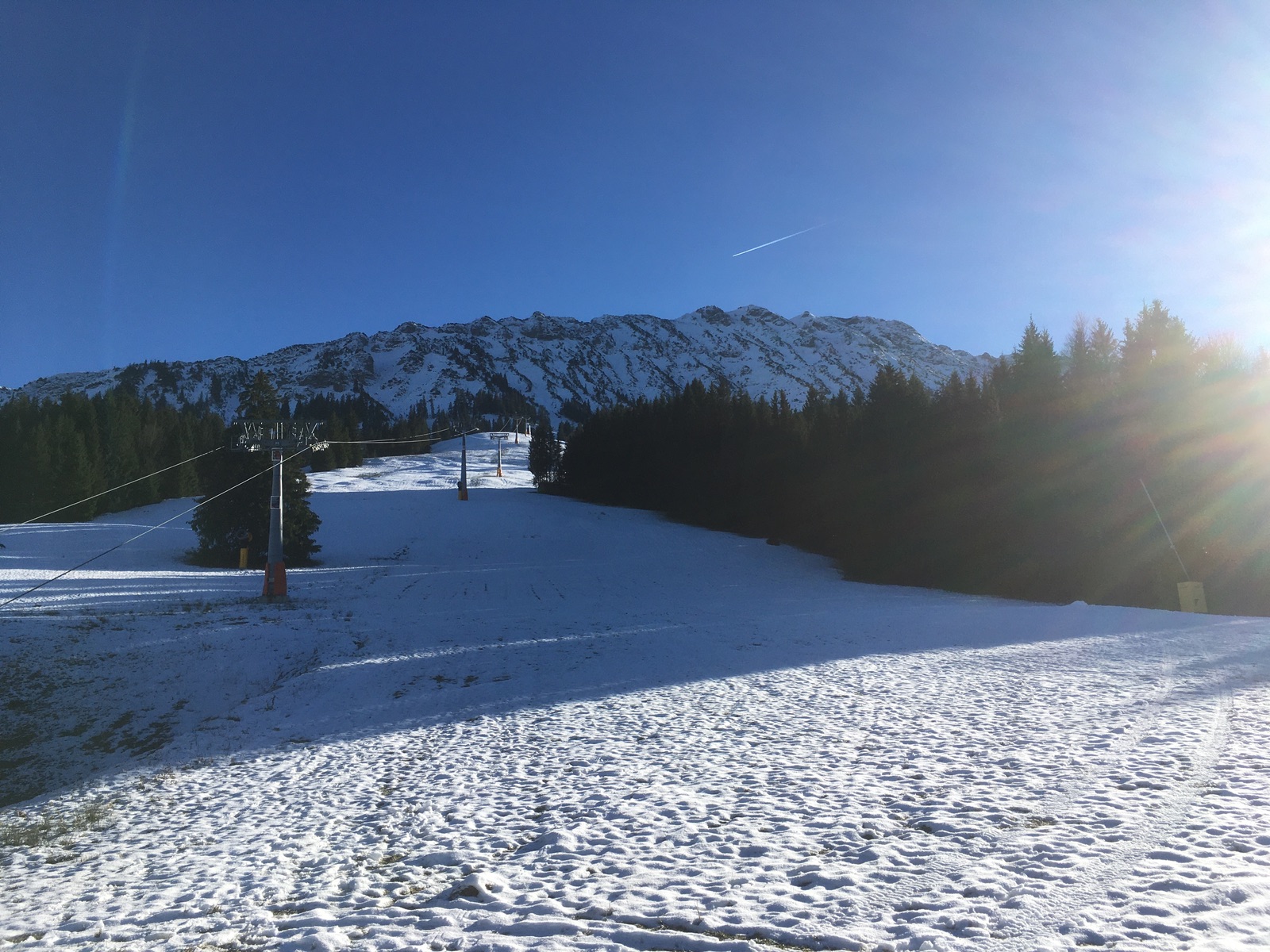 Dann bin ich auf die Schattenseite gewechselt und bin drei Mal beim Grenzwieslift aufgestiegen und die verschiedenen Routen abgefahren - die Wahl dieses eher kurzen Hangs hatte den Hintergrund, dass dort im Wesentlichen noch nicht beschneit worden war, ansonsten aber schon. Und dann gibt es regelmäßig den unschönen "Schneekanonen-Bruchharsch". Es hat im Gebiet aber eher wenig Schnee (siehe auch Fotos) - da hatte es in Ehrwald mehr und nach den Berichten im Spitzingseegebiet deutlich mehr.