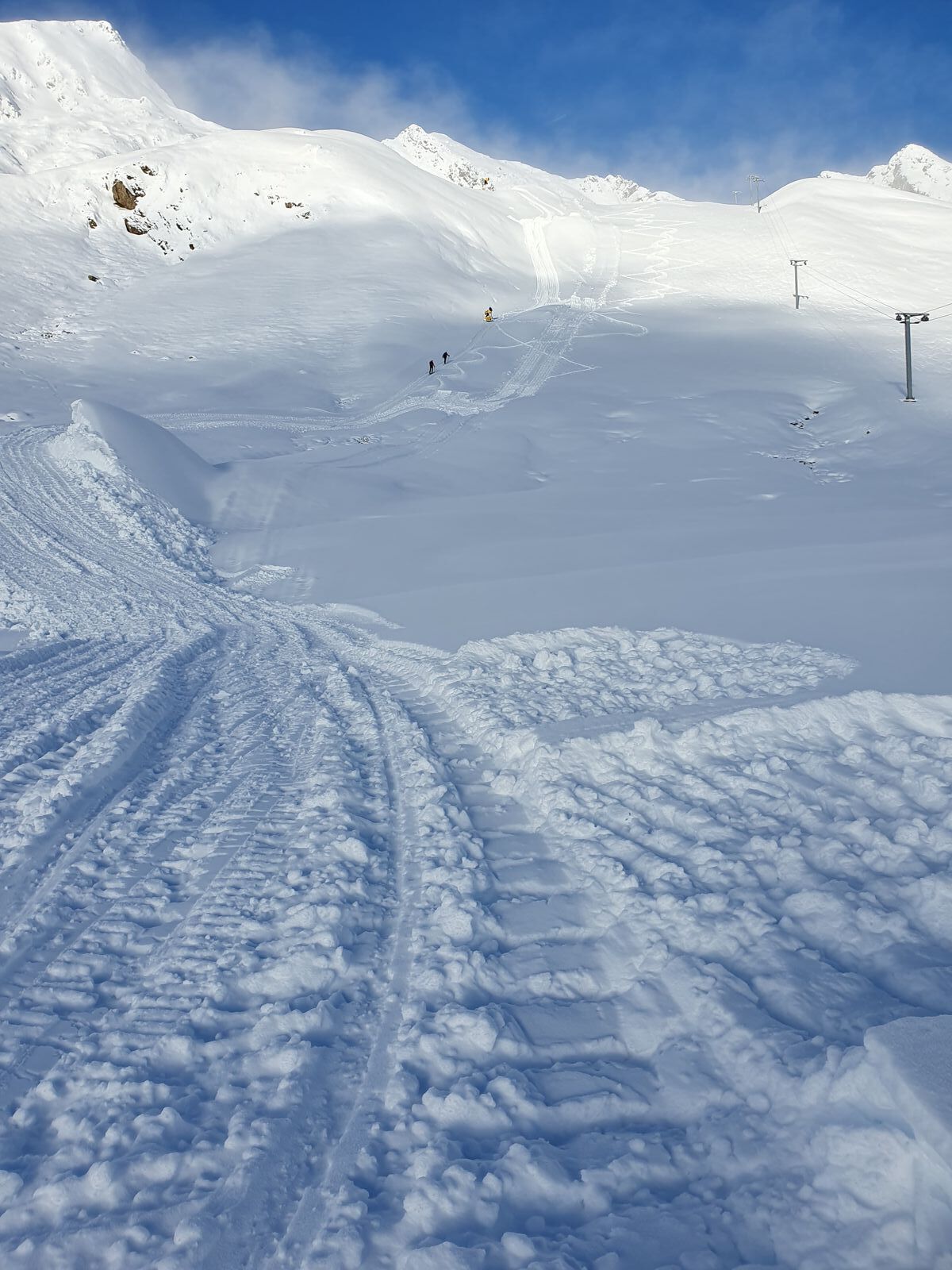 Das Personal ist gerade sehr fleissig und hat schon einiges frisch gewalzt, z.T. auch durch Pistenraupen dicke harte Bollen, die man aber umfahren kann.