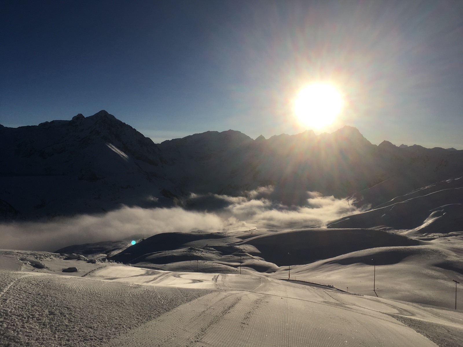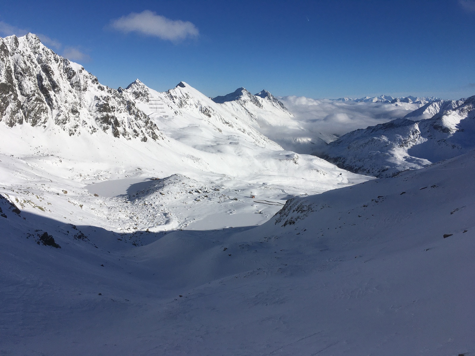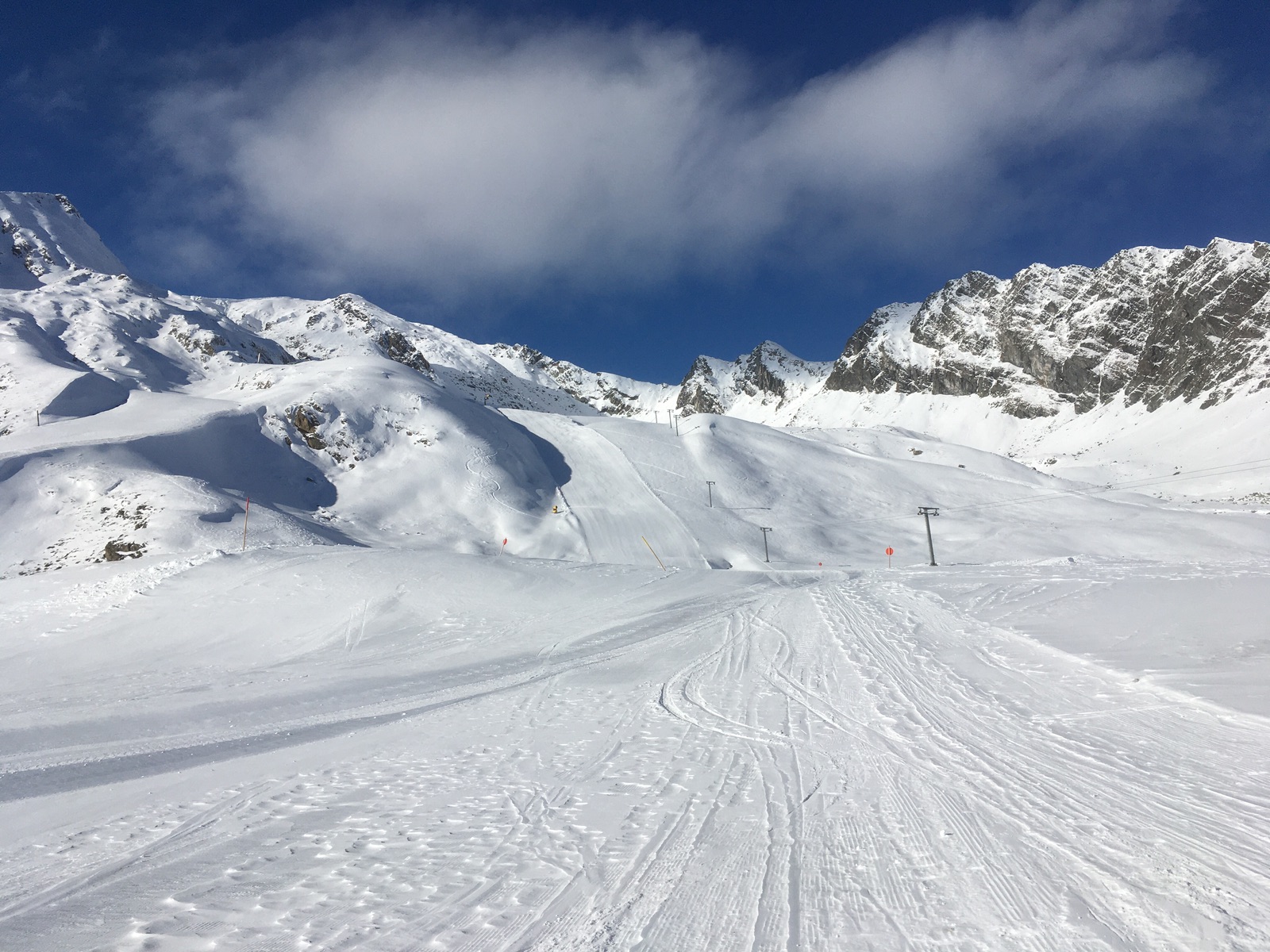 Verhältnisse: Piste top, ist überwiegend auch schon präpariert, also kein "Knollenfahren" wie zuletzt. Im freien Gelände hat es hingegen immer noch nur sehr wenig Schnee. Zur Grieskogelscharte geht, wobei ich trotz sehr vorsichtiger Abfahrt zwei Mal Steinkontakt hatte. Wer es machen will: Unbedingt in der eingefahrenen Trasse bleiben, die vermeintlich verlockenden unberührten Meter bieten Steine und Windgangeln etc. Der Vordere Grieskogel wurde auch angespurt, die Abfahrt sah aber steinig aus. Pirchkogel das gleiche. Selbst mit alten Steinski würde ich von beiden Gipfel abraten, es droht ja auch immer eine Verletzung bei einem Sturz.