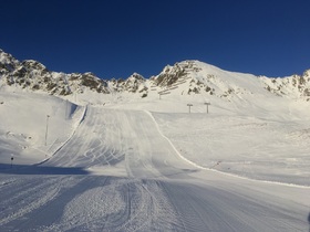 Verhältnisse: Piste top, ist überwiegend auch schon präpariert, also kein "Knollenfahren" wie zuletzt. Im freien Gelände hat es hingegen immer noch nur sehr wenig Schnee. Zur Grieskogelscharte geht, wobei ich trotz sehr vorsichtiger Abfahrt zwei Mal Steinkontakt hatte. Wer es machen will: Unbedingt in der eingefahrenen Trasse bleiben, die vermeintlich verlockenden unberührten Meter bieten Steine und Windgangeln etc. Der Vordere Grieskogel wurde auch angespurt, die Abfahrt sah aber steinig aus. Pirchkogel das gleiche. Selbst mit alten Steinski würde ich von beiden Gipfel abraten, es droht ja auch immer eine Verletzung bei einem Sturz.