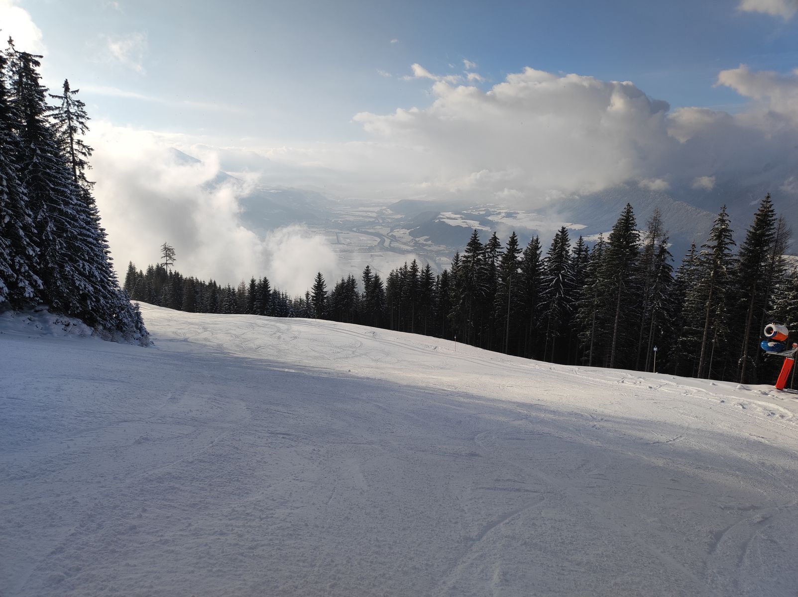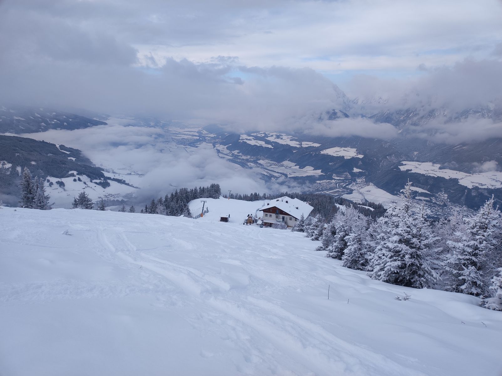 Das Skigebiet am Kellerjoch hat schon früher als geplant aufgemacht und daher sind die Pisten sehr gut hergerichtet. Für den Aufstieg gibt es aber die Möglichkeit, statt der Pisten die Rodelbahn zu benutzen, was zwar etwas länger dauert, aber dafür mehr Skitouren-Feeling vermittelt als in der Karawane mit den anderen die Piste hochzulaufen. Die letzten 150 Höhenmeter oberhalb des Hecherhauses gehören nicht zum Skigebiet. Hier liegt aber genug Schnee, um im freien Gelände aufzusteigen.