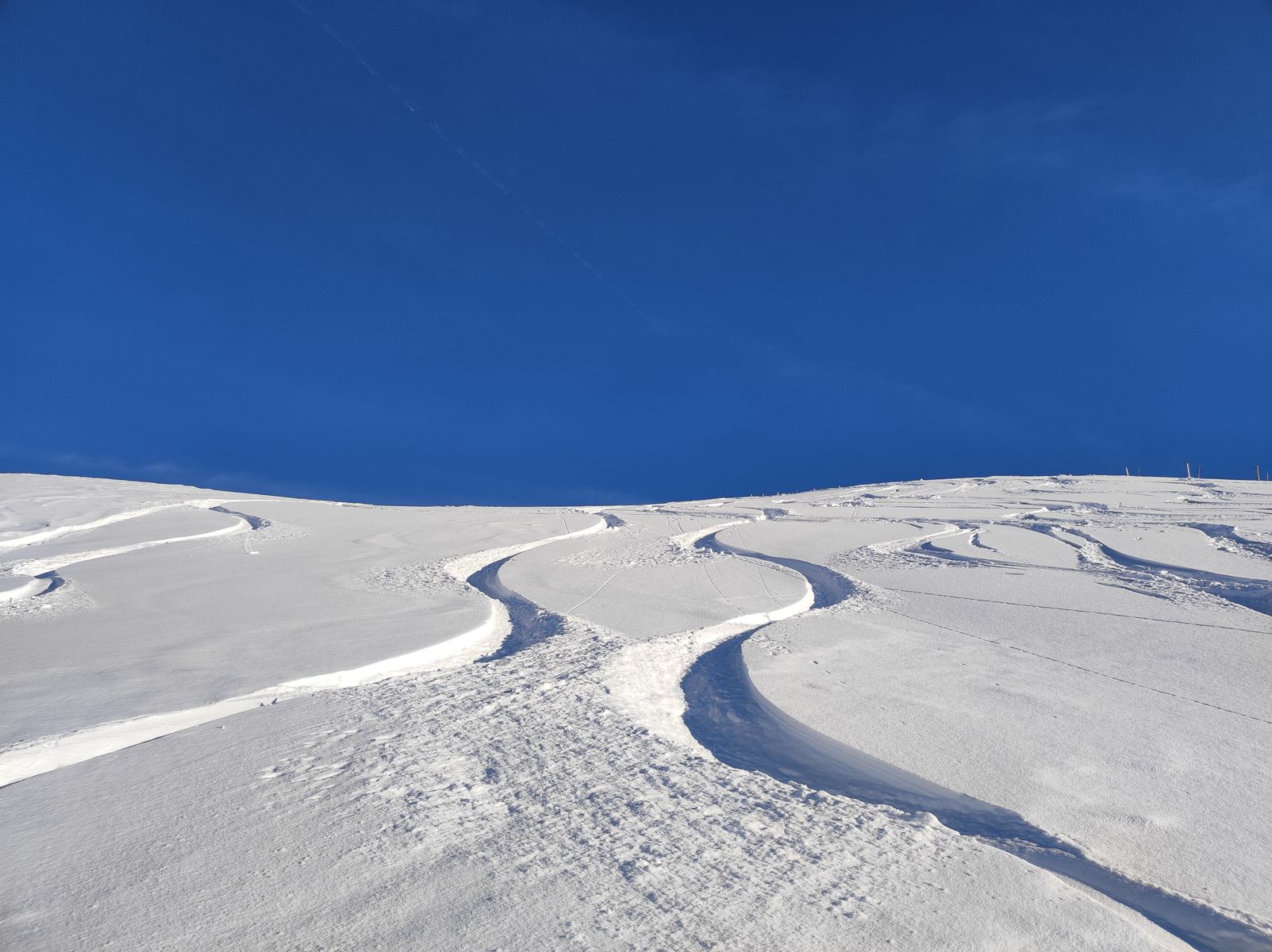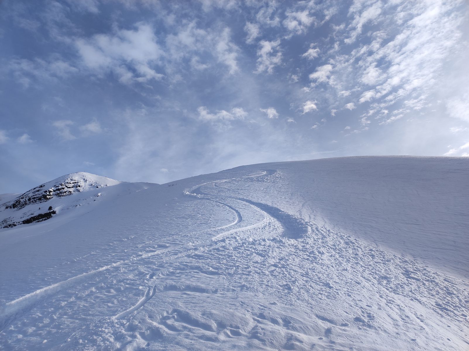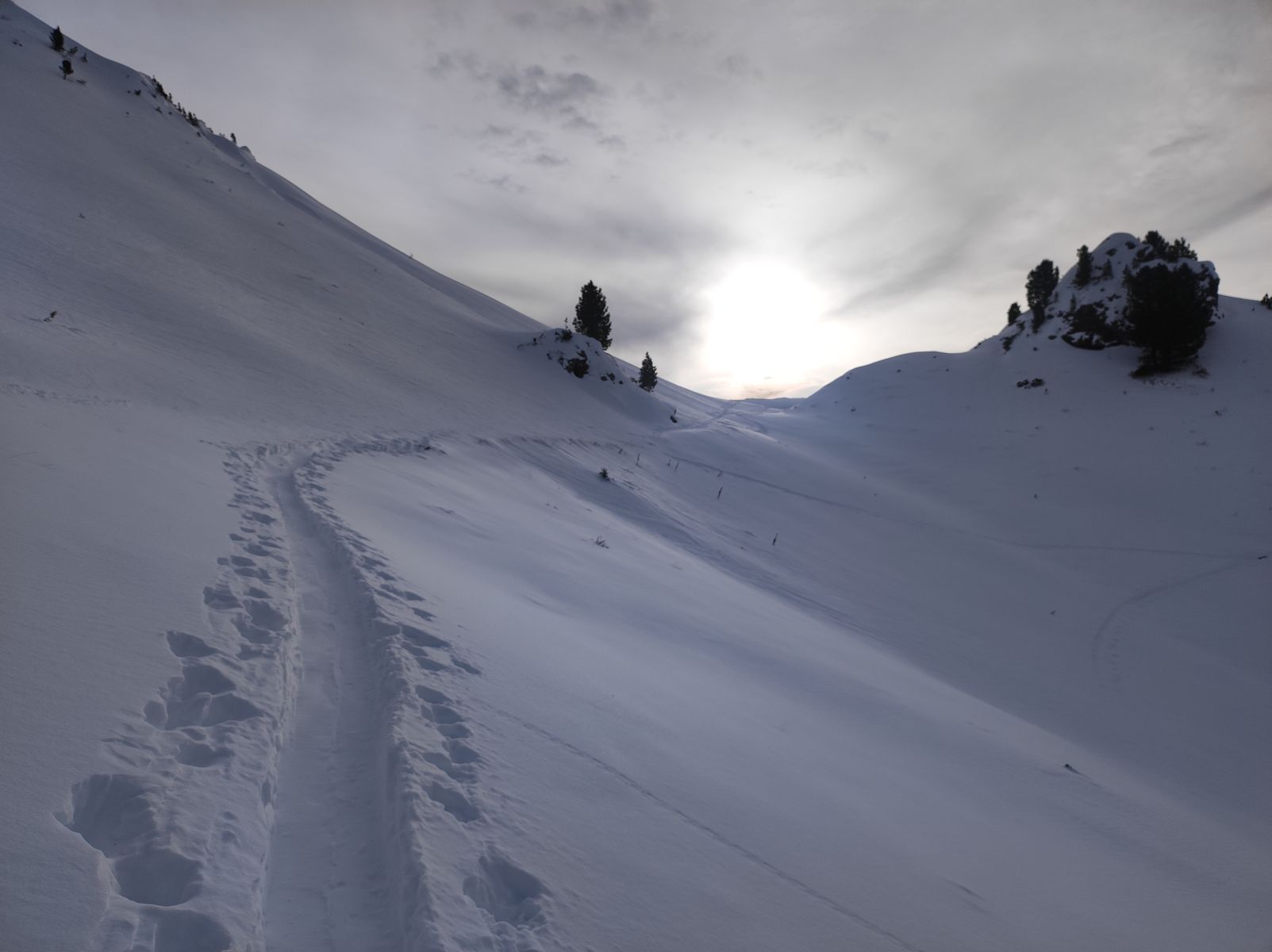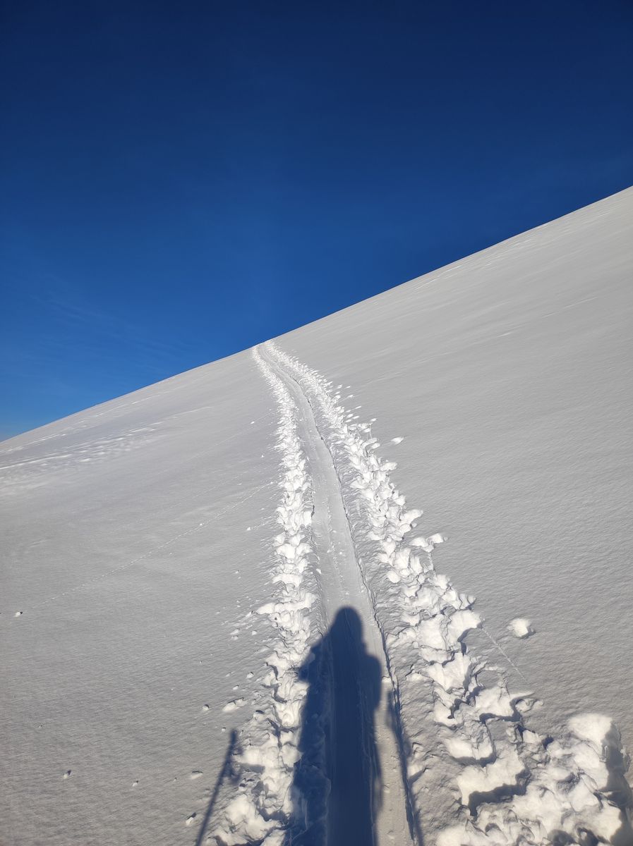 Die Tourenbedingungen sind wirklich gut; es hat im freien Gelände im Mittel um die 50cm Schnee, in Mulden deutlich mehr. Da die letzten Tage sonnig und kalt waren, hat sich der Pulver bisher gut gehalten, aber morgen soll es deutlich wärmer werden.