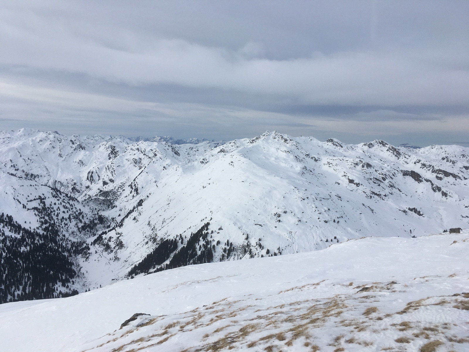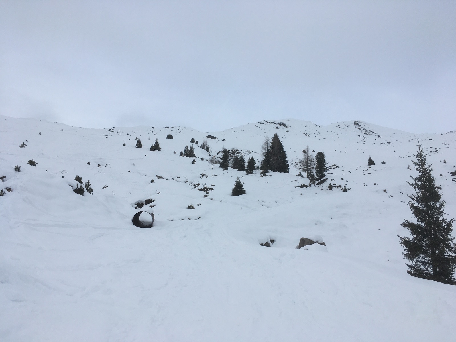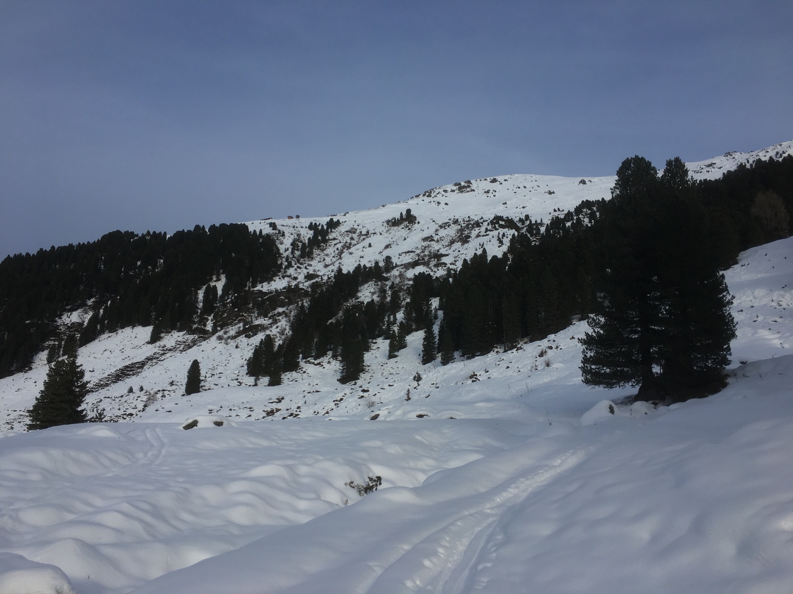 Unten geht es dann über den Almweg zur Salzachhütte (derzeit geschlossen, evtl Betrieb über Weihnachten) und dann den teilweise leider recht flachen Forstweg (kurz sogar mal etwas bergauf) zur alten Gerlosstraße - anschupfen notwendig. Zuletzt entlang der Straße (mit den alten Skiern, da sind ein paar weitere Kratzer nicht schlimm) bis zum Hotel Ronach ohne Abschnallen.