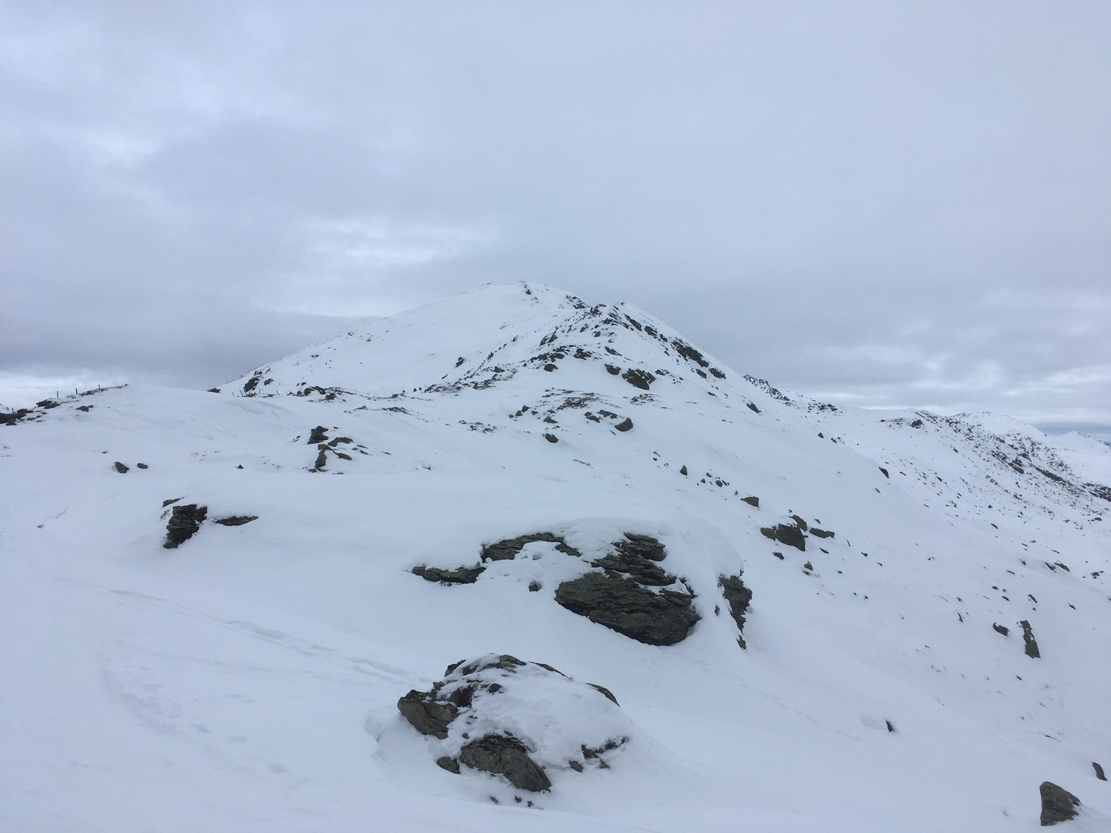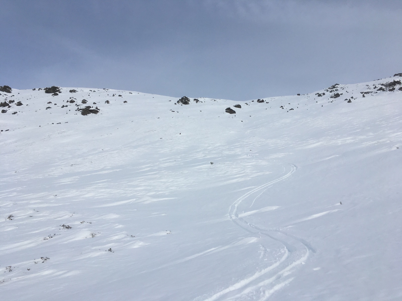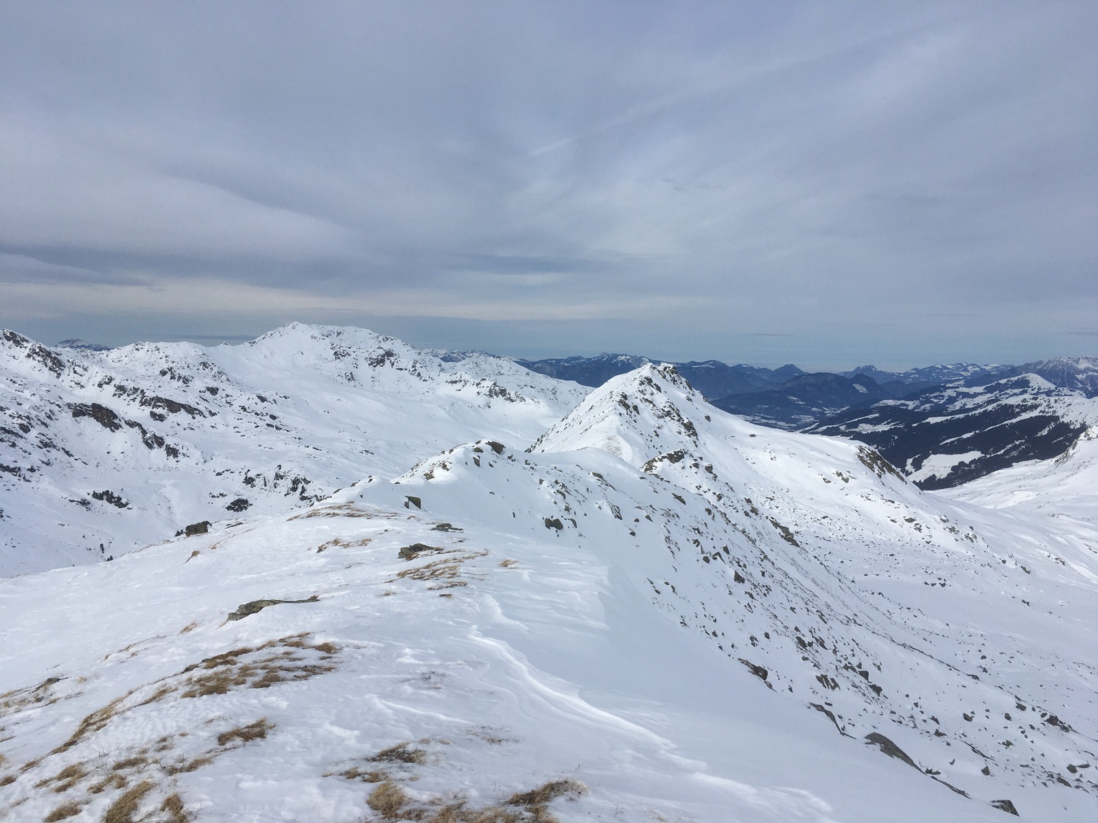 Vom Ronachgeier ging es dann noch weiter über den Grat / Kamm, teilweise etwas schneearm, zum Baumgartgeier. Unterwegs beachtliche Schneeverwehungen. Als ich dann am Nachmittag am Baumgartgeier war, hatte sich die zuvor konturenfreie Sicht deutlich gebessert und die Sonne kam heraus. Damit wurde auch die Abfahrt im sehr feuchten Schnee besser. Ich entschied mich optimistisch für die steile Direktabfahrt nach Westen ins Salzachtal und wurde dafür oben - für die derzeitigen Verhältnisse - auch belohnt. Die Steilstufe zwischen ca. 2.050 m und 1.850 m ging dann auch irgendwie, jedenfalls mit alten Skiern weder Ski- noch Naturmassaker. Ideal war meine Linie aber nicht.