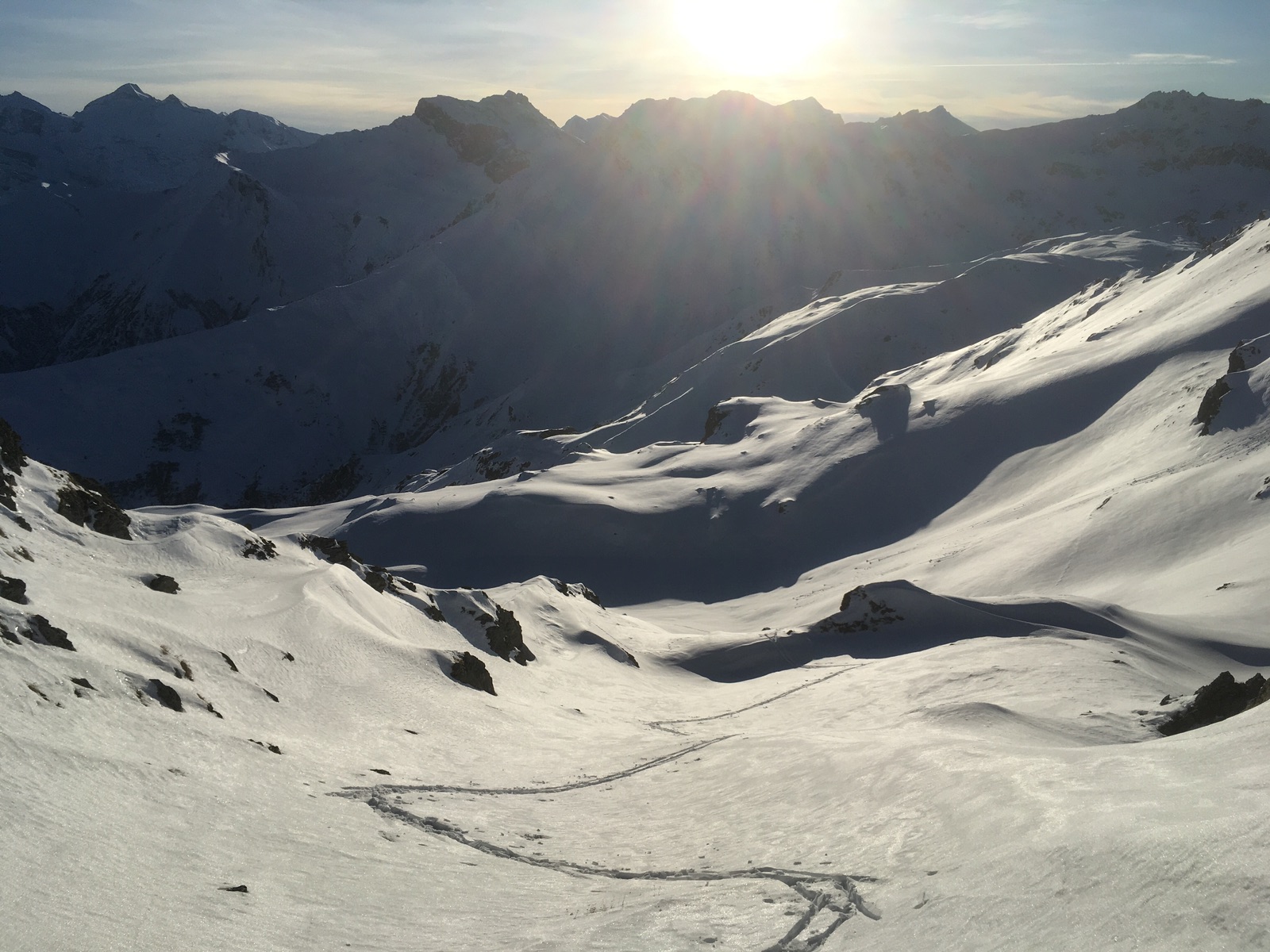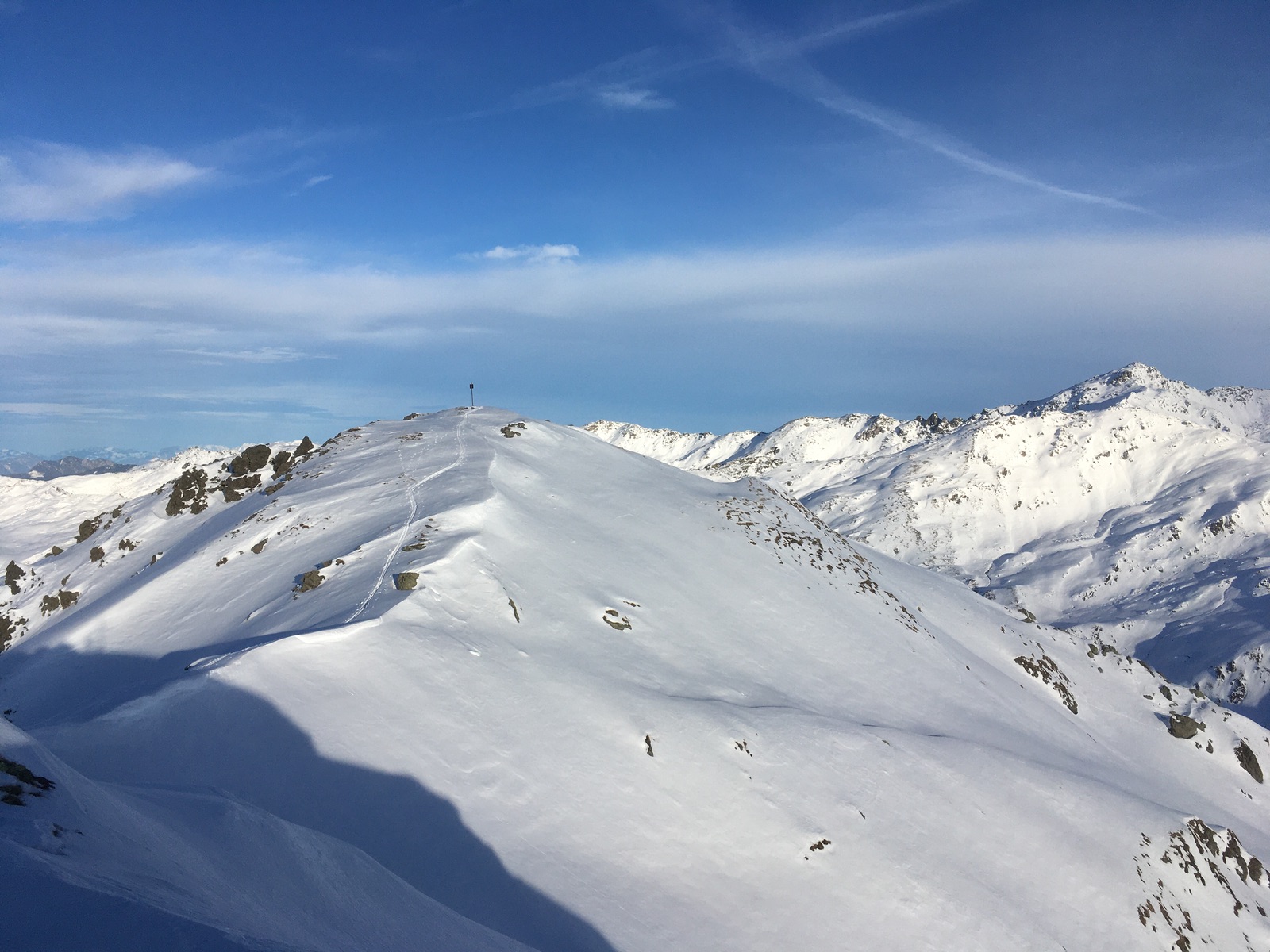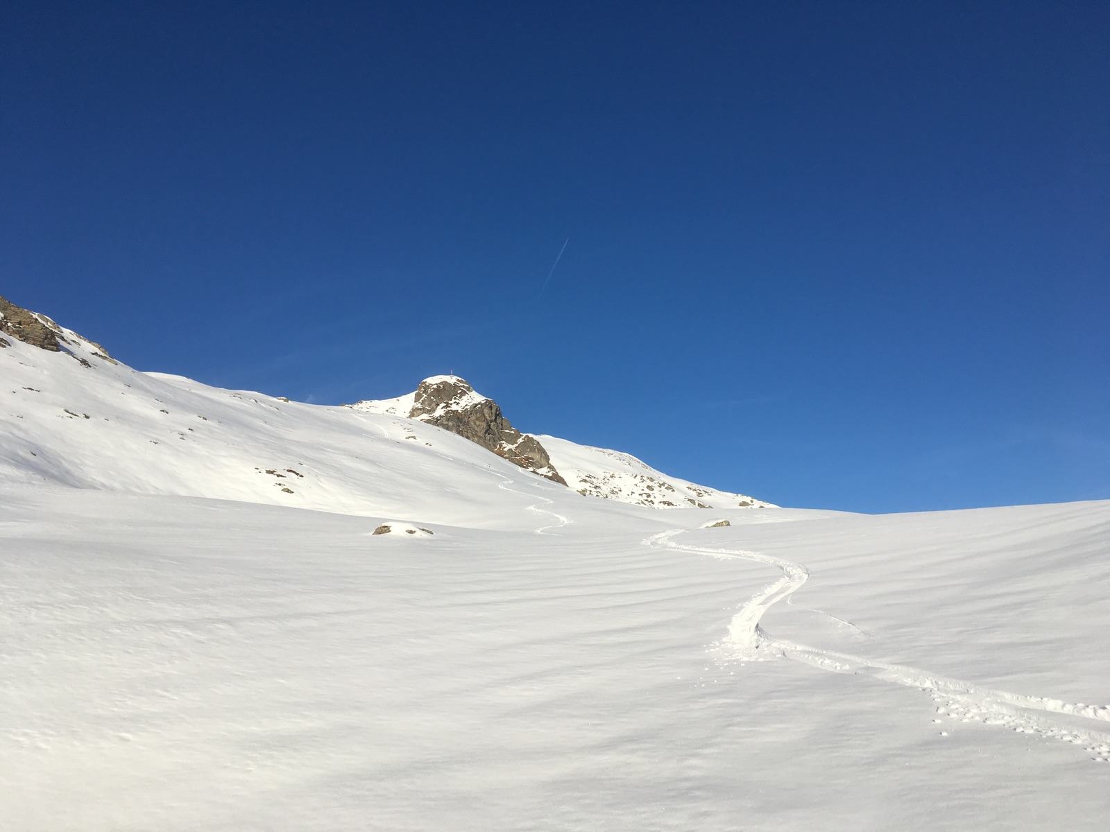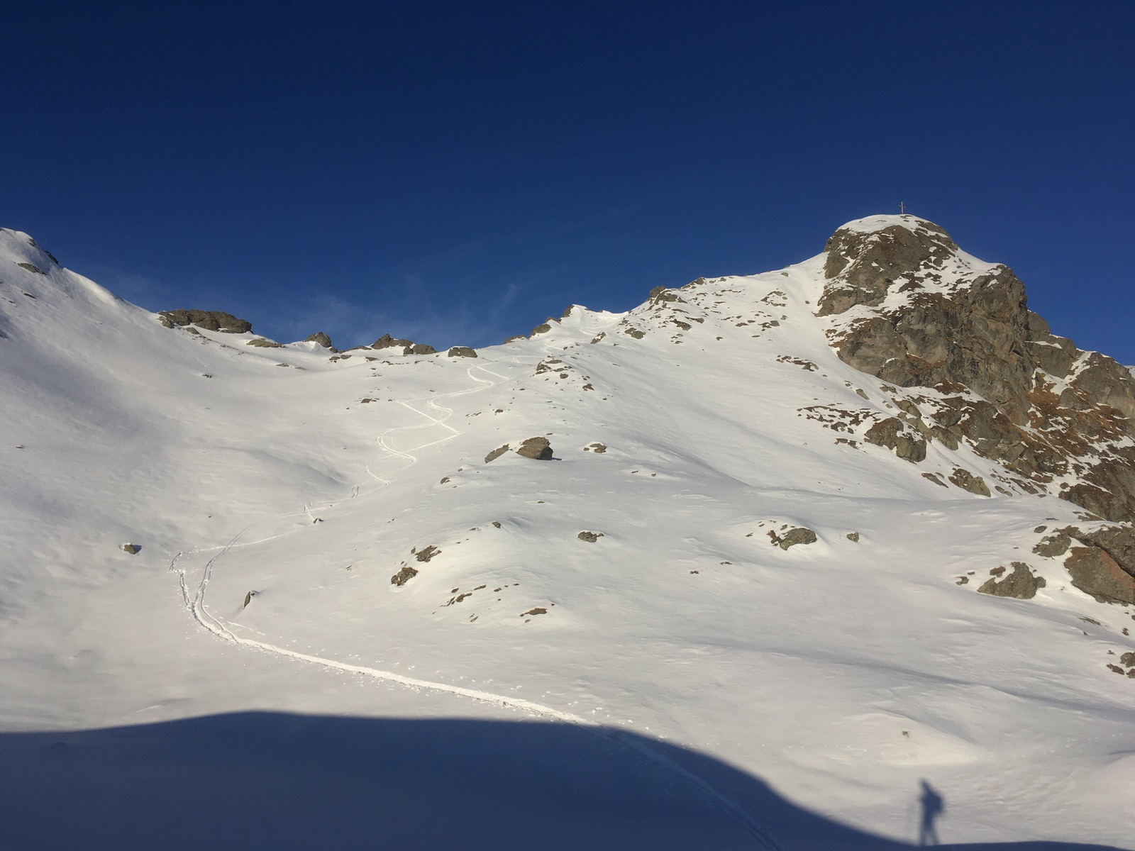 Sieht wunderbar aus und wäre auch tolles Skigelände, aber Vorsicht bei der Abfahrt angesichts nur dünn eingeschneiter Felsen: