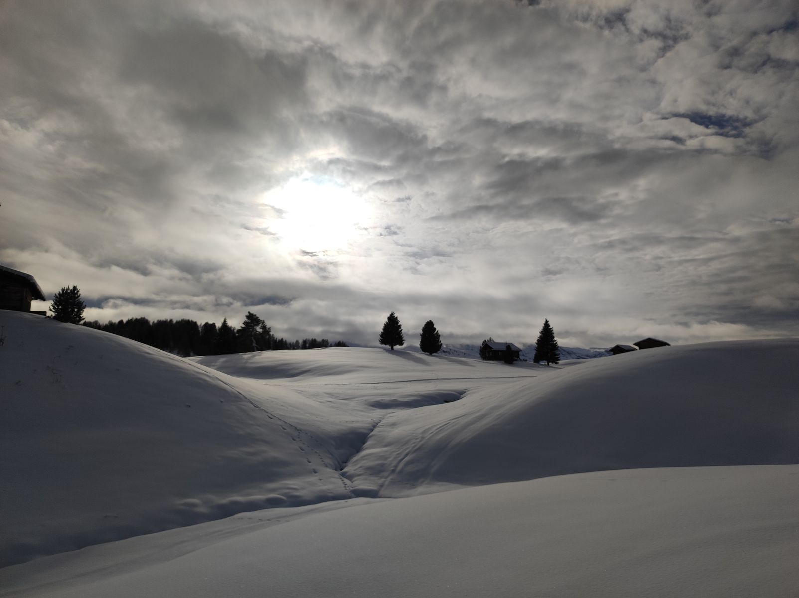 Zum Schnee: Die Erwärmung war auf der Alpensüdseite bei weitem nicht so markant wie bei uns daheim im Norden. Kein Tauwetter; südseitig ist der Schnee aber aufgrund der Sonneneinstrahlung harschig, wohingegen nordexponiert immer noch Pulver (wenn auch mittlerweile kompakter und gesetzt) zu finden ist.