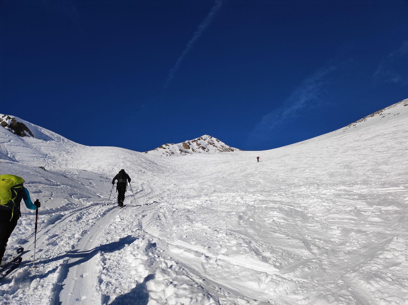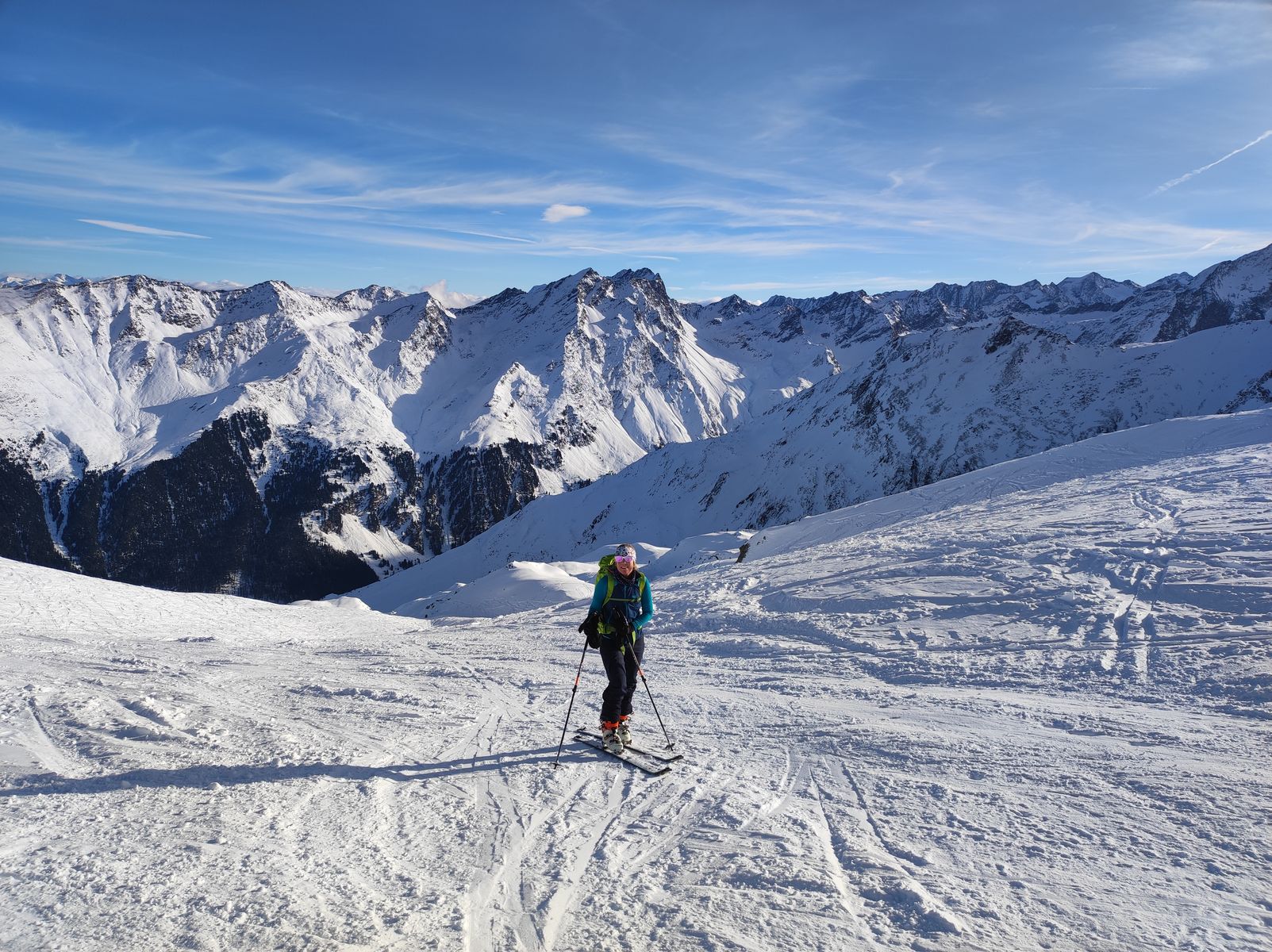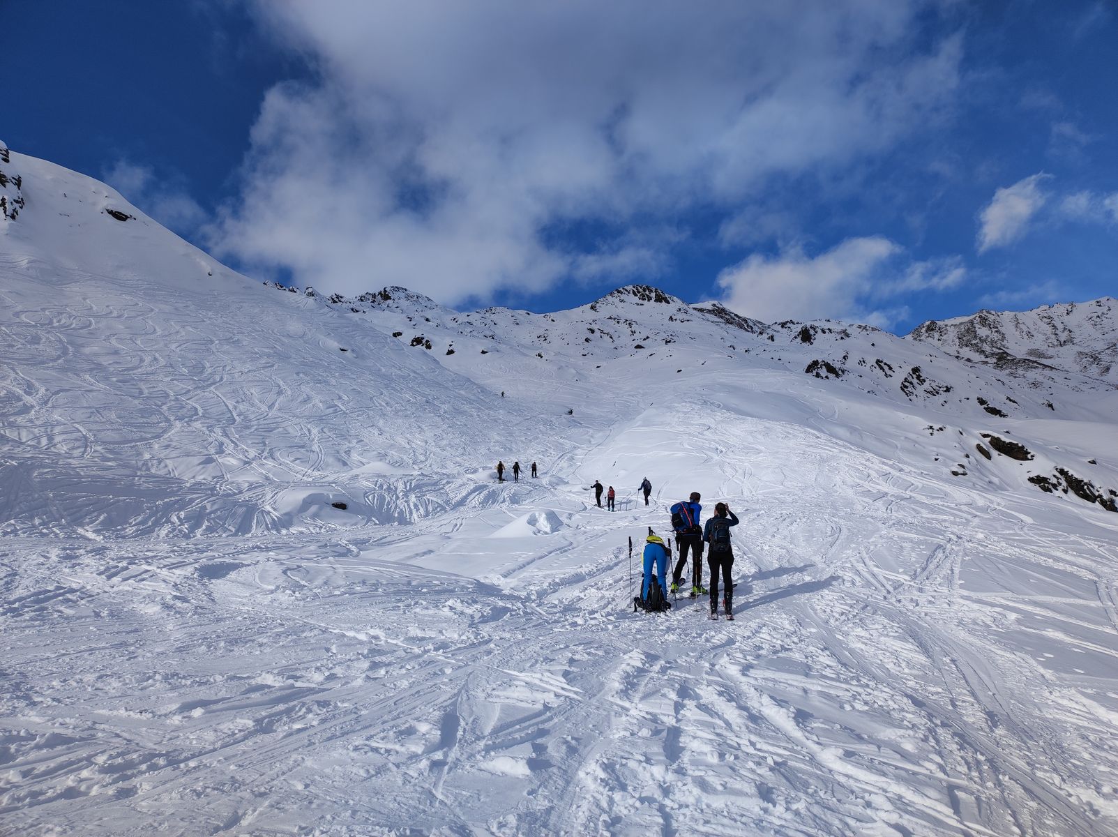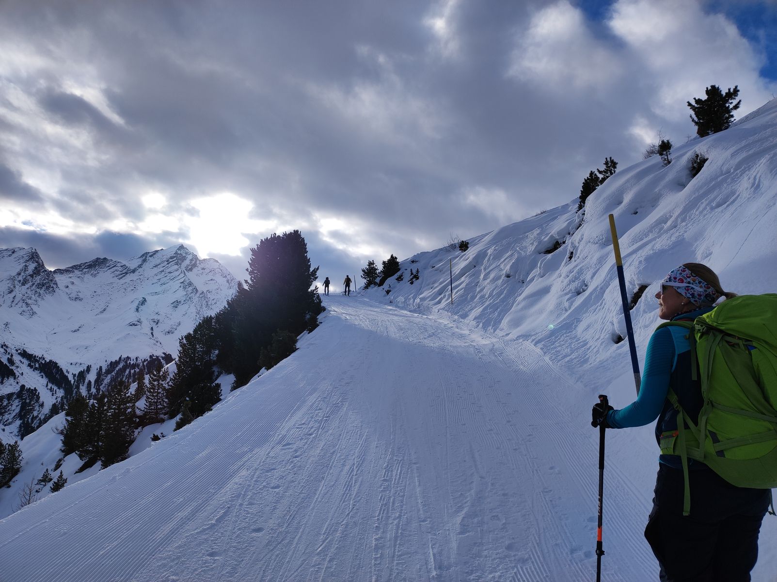 Wir haben heute die Tour auf die Lampsenspitze über die klassische Route von Praxmar aus gemacht. Dank der präparierten Rodelbahn bis zur Kogl-Alm geht es rauf und runter gut durch den Waldgürtel. In der Abfahrt ist die Rodelbahn durch den Zirbenwald für mich zurzeit sogar der beste Teil der Tour, weil es oben einfach dünn mit Schnee ist. Weicht man in die verlockenden, heute noch pulvrigen Hänge neben der pistenartig ausgefahrenen Hauptroute aus, dauert es nicht lange bis man einen Stein erwischt. Wir sind zum Glück ohne größere Schäden durchgekommen.