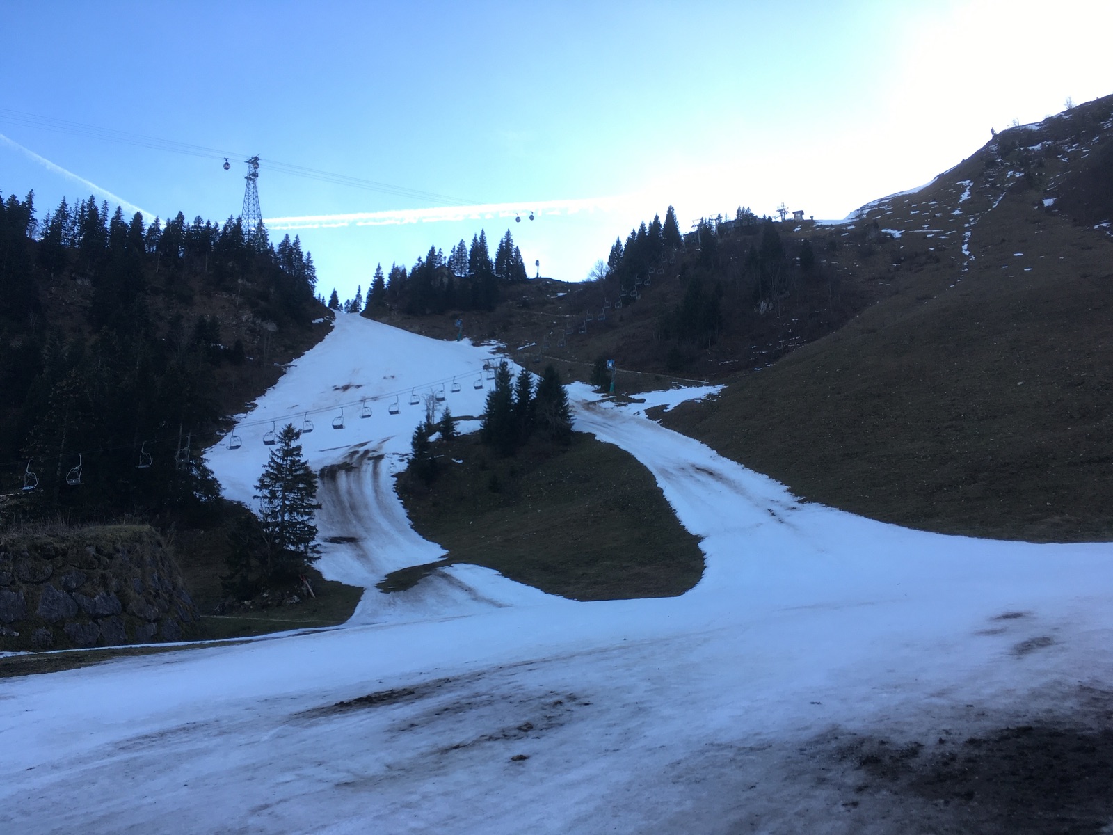 Heute ging es kurzentschlossen am Nachmittag noch auf das Brauneck, um das gute Wetter auszunutzen. Der Pistenskibetrieb ist eingestellt. Es geht auf dünner Schneeauflage aber noch hoch und runter. An zwei kurzen Stellen ist es aber schon fast aper, in der Abfahrt besser abschnallen / vorsichtig heruntersteigen mit Ski. Für den Aufstieg waren zumindest heute Nachmittag Harscheisen kein Luxus, es ist fast durchgehend pickelhart.