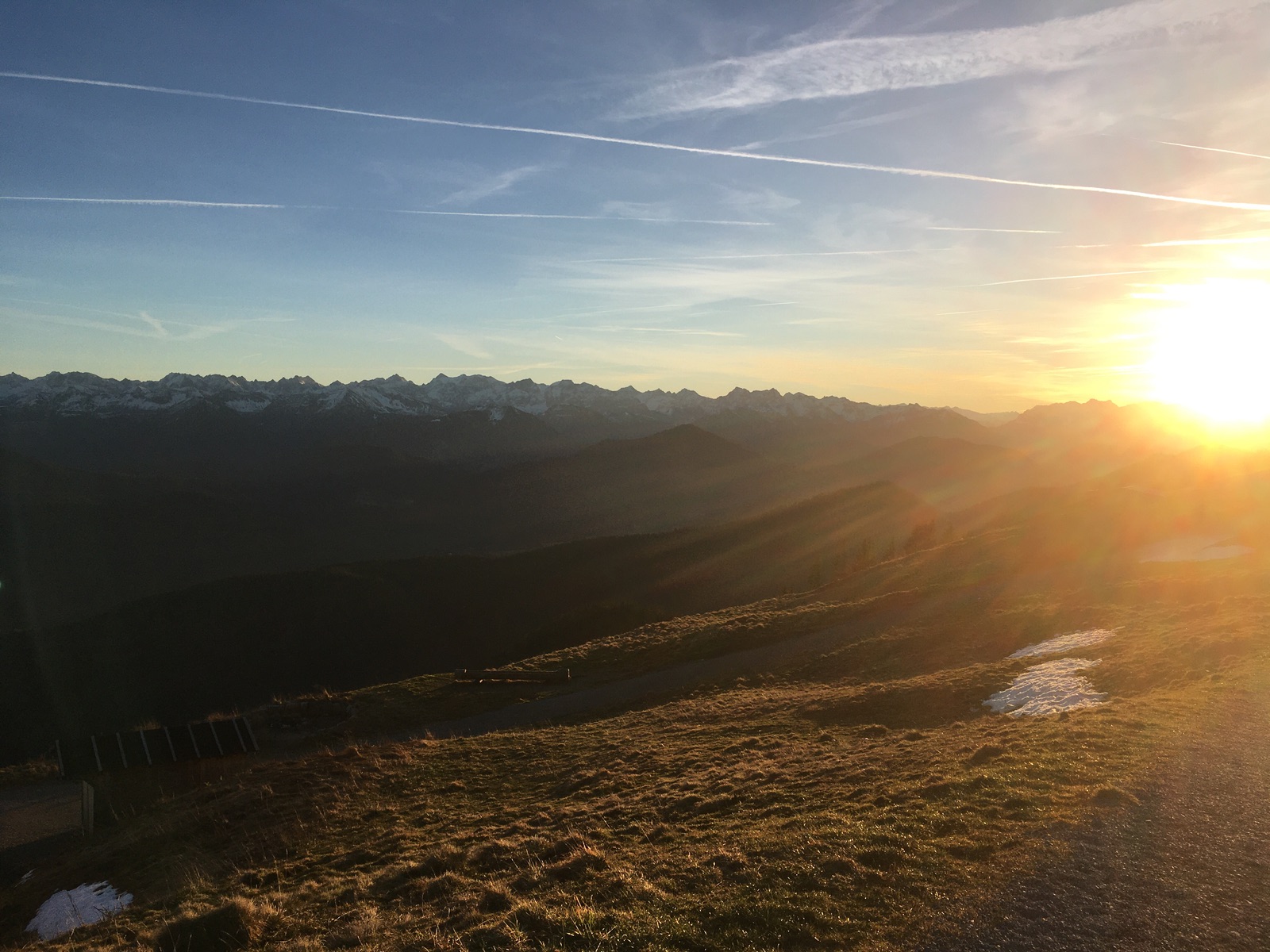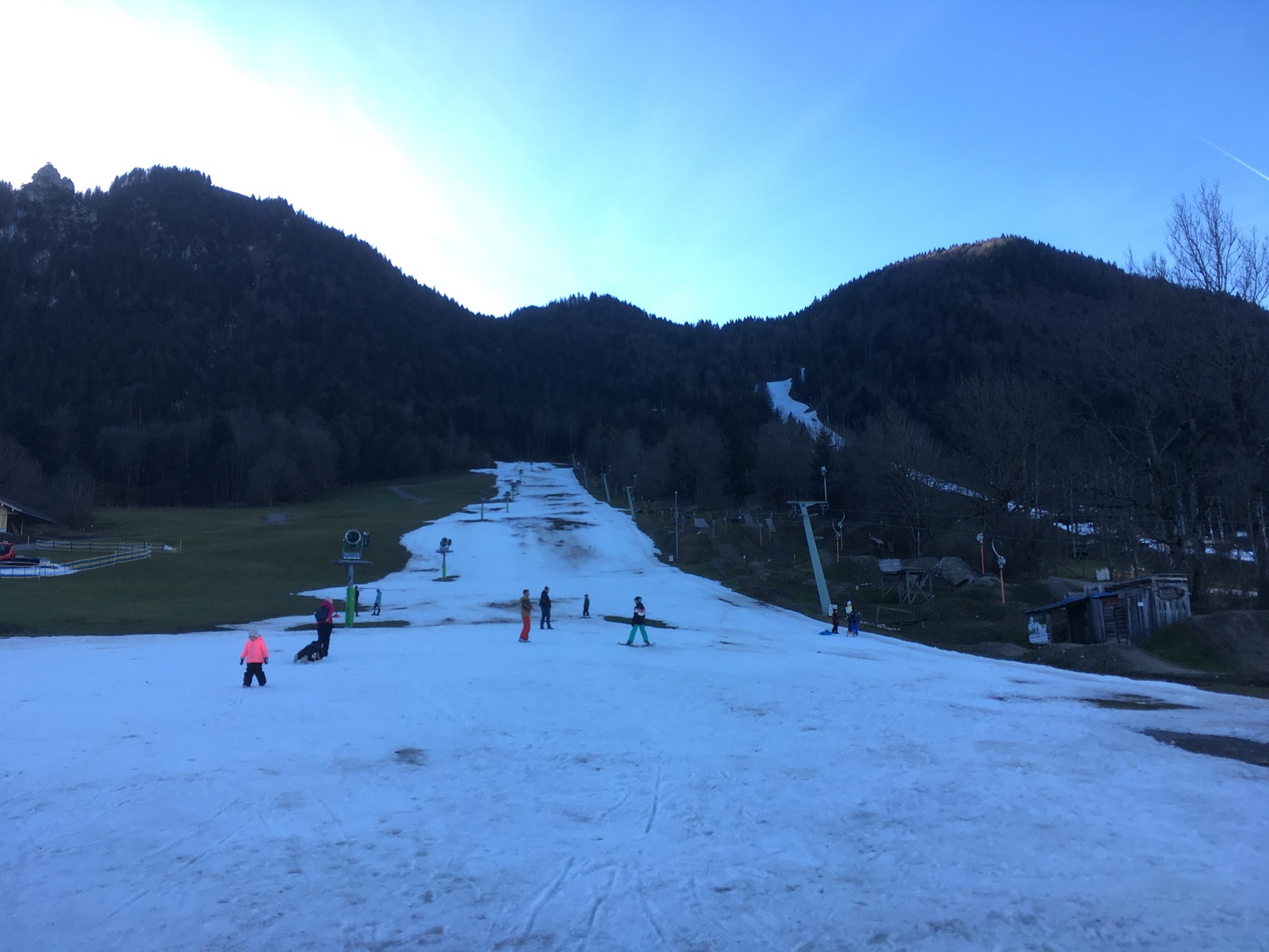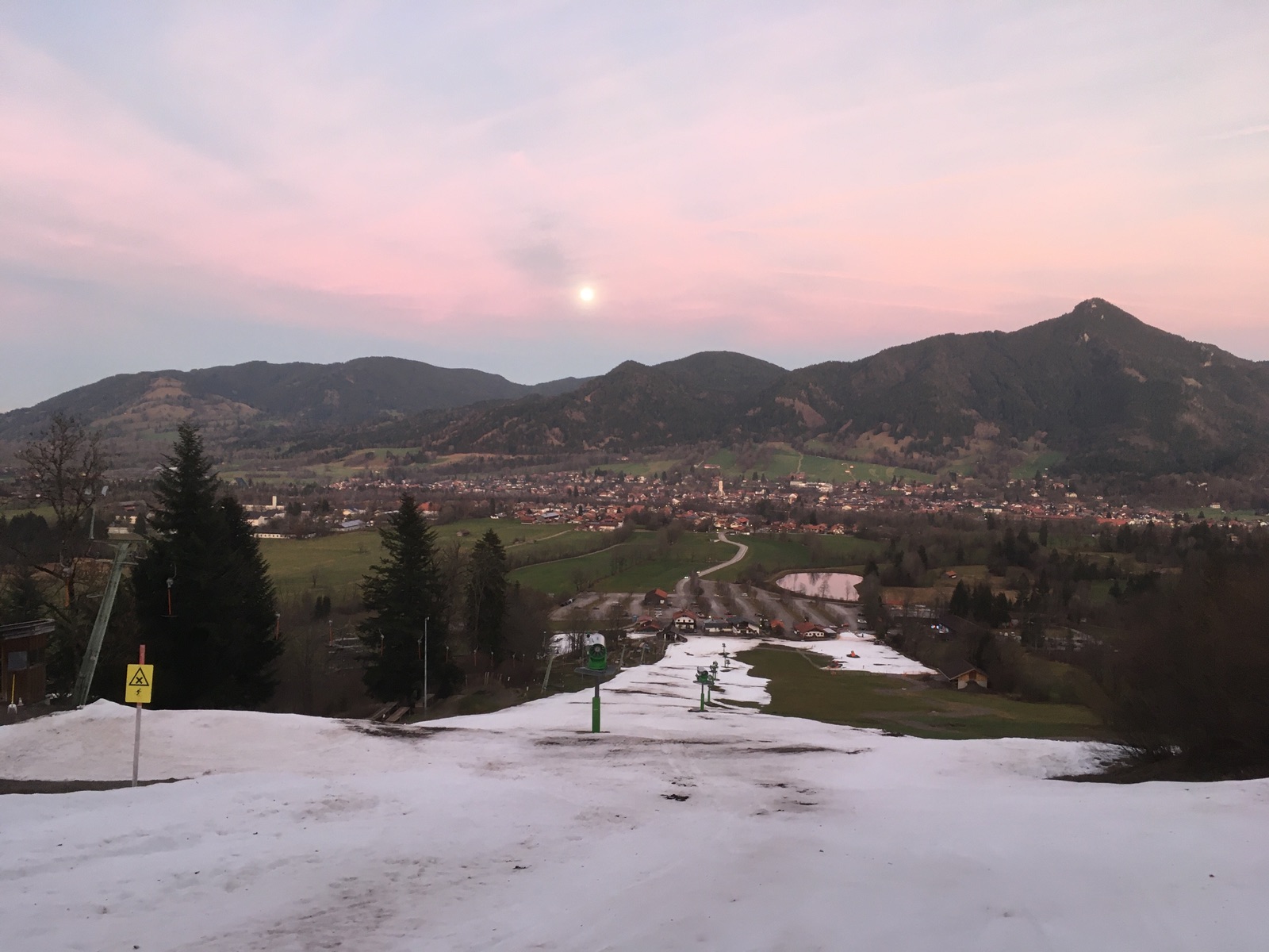 Heute ging es kurzentschlossen am Nachmittag noch auf das Brauneck, um das gute Wetter auszunutzen. Der Pistenskibetrieb ist eingestellt. Es geht auf dünner Schneeauflage aber noch hoch und runter. An zwei kurzen Stellen ist es aber schon fast aper, in der Abfahrt besser abschnallen / vorsichtig heruntersteigen mit Ski. Für den Aufstieg waren zumindest heute Nachmittag Harscheisen kein Luxus, es ist fast durchgehend pickelhart.