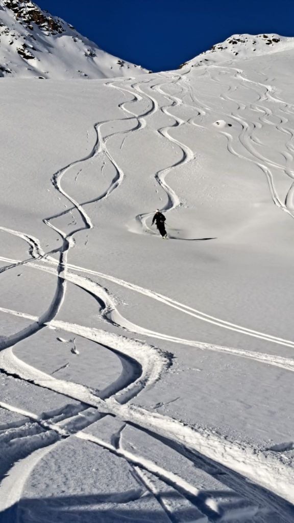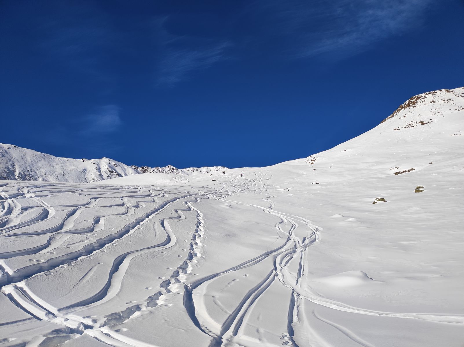 Am Freitag wollten wir aber keinen der Gipfel aus dem direkten Umfeld der Hütte in Angriff nehmen, sondern der Abwechslung halber auf der anderen Talseite unterwegs sein und so fiel die Wahl auf den Glockhauser. Nebenbei: Alle Gipfel, die über Gletscher bestiegen werden (Freibrunnerspitze, Bärenbartkogel, Weißkugel), machen wegen der offenen Spalten zurzeit keinen Sinn! Am PP in Melag angekommen sah es auf der Südseite erst mal sehr mau bzw grün aus, doch entdeckten wir ein schmales Schneeband auf einem Forstweg und hofften, dass es weiter oben schon mehr Schnee geben würde. Bis auf eine Höhe von etwa 2400 Metern blieb es aber sehr dürftig mit dem Schnee (gerade genug, um irgendwie hocheiern zu können) und ich zweifelte schon ernsthaft an meinen Fähigkeiten als Tourenplaner, doch dann traten wir über eine Geländeschwelle, wo der Hang von Süd auf Südost dreht und plötzlich war er da: der Schnee, der pulvrige! Und gar nicht so wenig davon! Zwar haben wir bei der Abfahrt auch den einen oder anderen Stein erwischt, doch ging es so fein, dass wir gleich nochmal hoch sind.