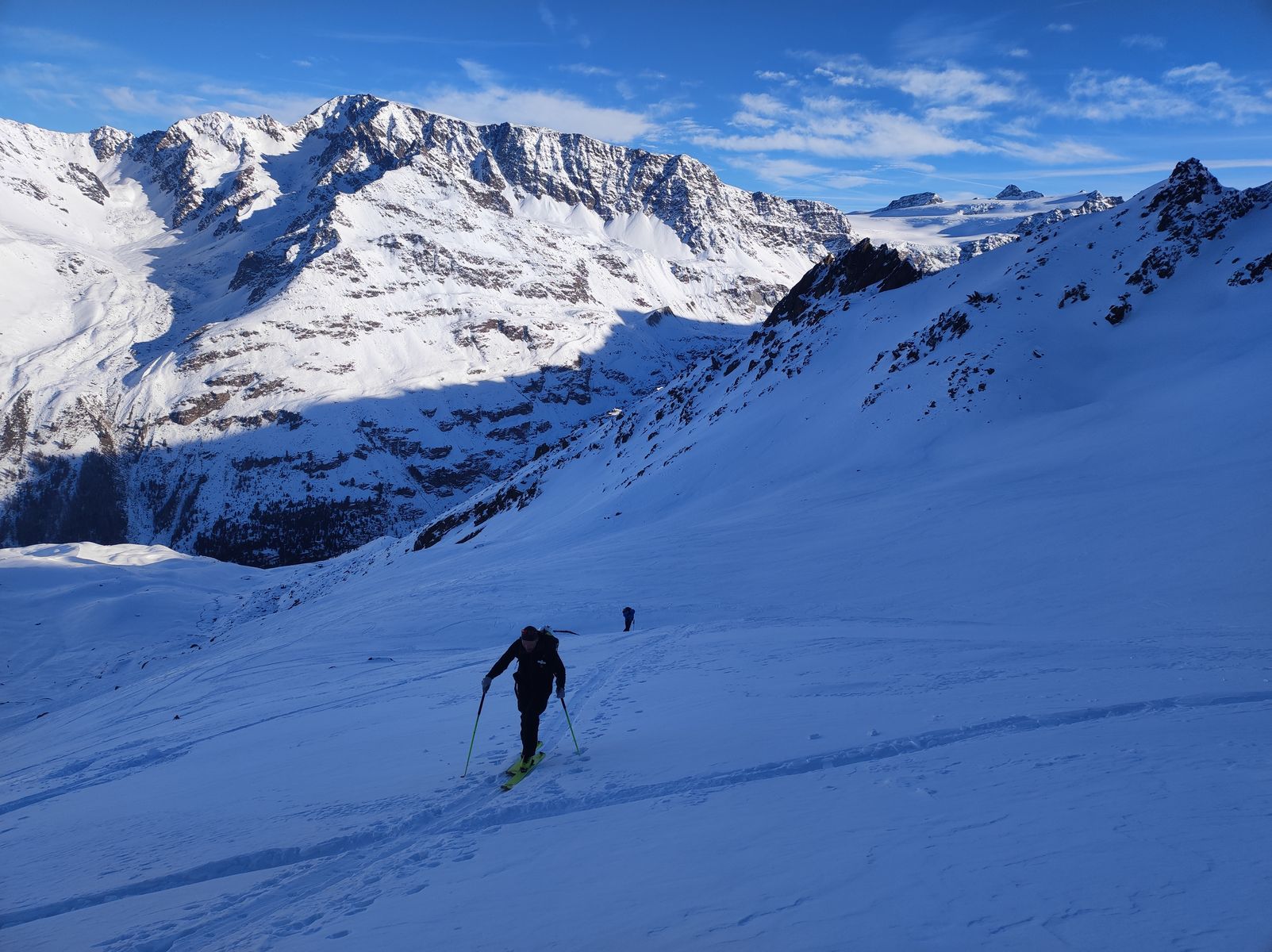 1: Schattiger Anstieg im Nordhang. Im Hintergrund Weißseespitze und Gepatschferner.