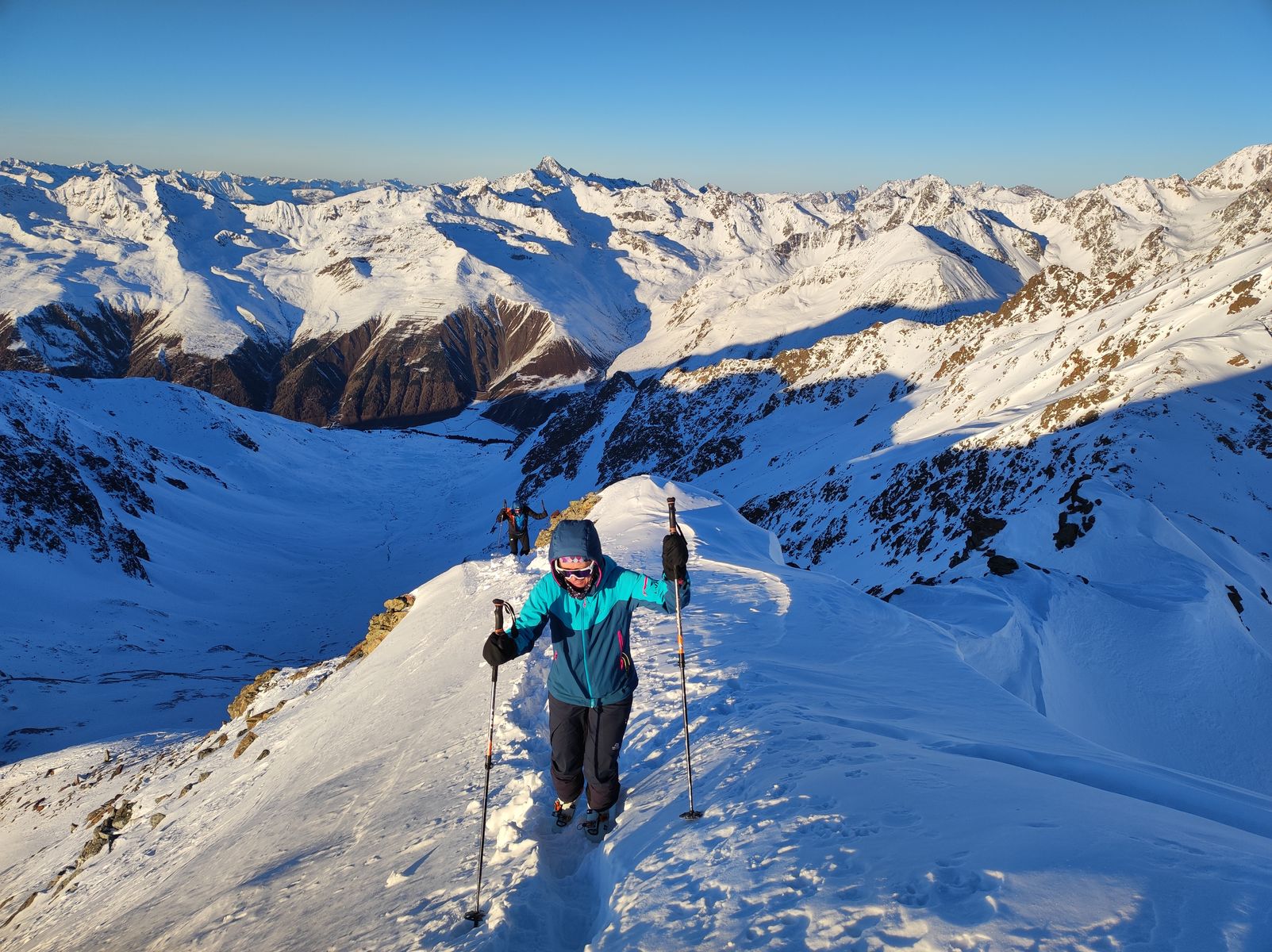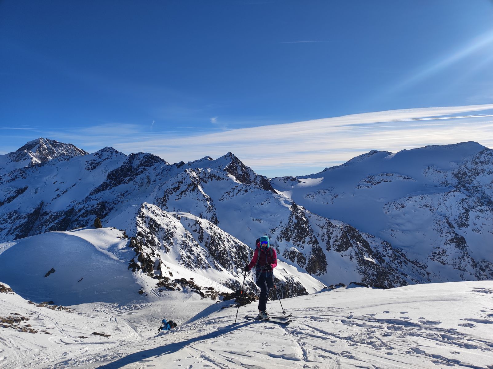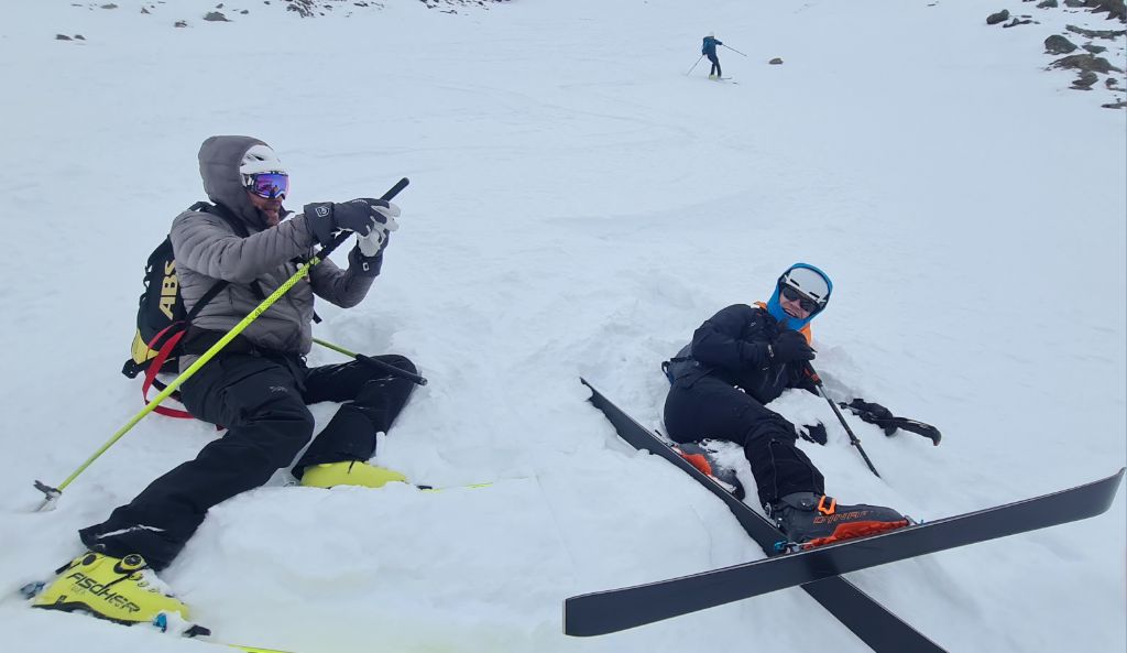 Grundsätzlich gilt für alle Touren, dass die Schneeverhältnisse ordentlich, aber natürlich nicht überragend sind. Es sind verschiedene Schneearten von Pulver bis Harsch, oft kleinräumig wechselnd, vorhanden, wobei man auch mit Steinkontakt rechnen muss. Ohne ist keiner von uns durchgekommen, aber durch umsichtige Fahrweise konnten Totalschäden an Material und Mensch vermieden werden. Es hat jeden von uns mal geschmissen, sogar Claudia, was eigentlich nie passiert. Die beste Abfahrt war jene von der Mitterlochspitze (harte Unterlage, keine Steine). Im Aufstieg wurden weder Harsch- noch Steigeisen benötigt. Alle Gipfel wurden auf den üblichen Normalrouten bestiegen und auch in der Abfahrt gab es aufgrund der Schneelage wenig Variationsmöglichkeiten.
