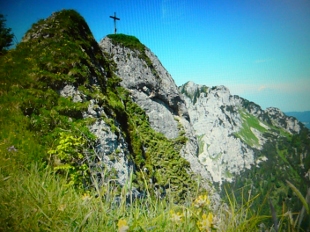 schrofige Wiesenflanken, über die Brunnenkopfhäuser, zum Gipfel, noch 1 Std.