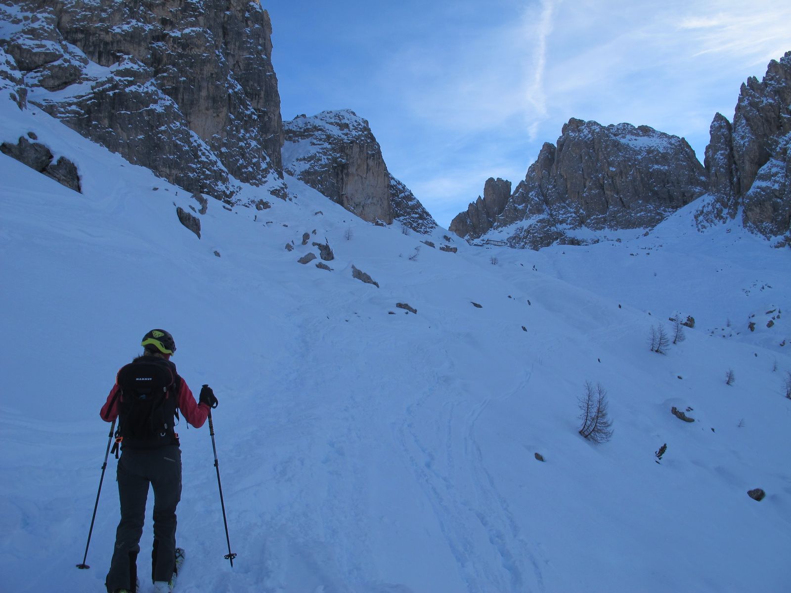 Zuerst die ehemalige Skipiste "Torre del Diavolo", dann nach dem zweiten Steilstück(1830m ca.)nach links queren und durch bewaldetes Gelände über einen steiler werdenden Hang Richtung Fonda Savio Hütte. Über eine Schulter in die Talmulde "Cadin dei Tocci". Dann links haltend unter den Wänden des "Torre del Wurms" vorbei zur Hütte. Nun links haltend ins "Cadin del Nevaio". Durch ein kurzes, felsendurchsetztes Stück und weiter ins sich öffnende Kar. Zuletzt steiler werdend, die letzten 60Hm zu Fuß oder bei guten Verhältnissen mit Skiern in die Scharte.