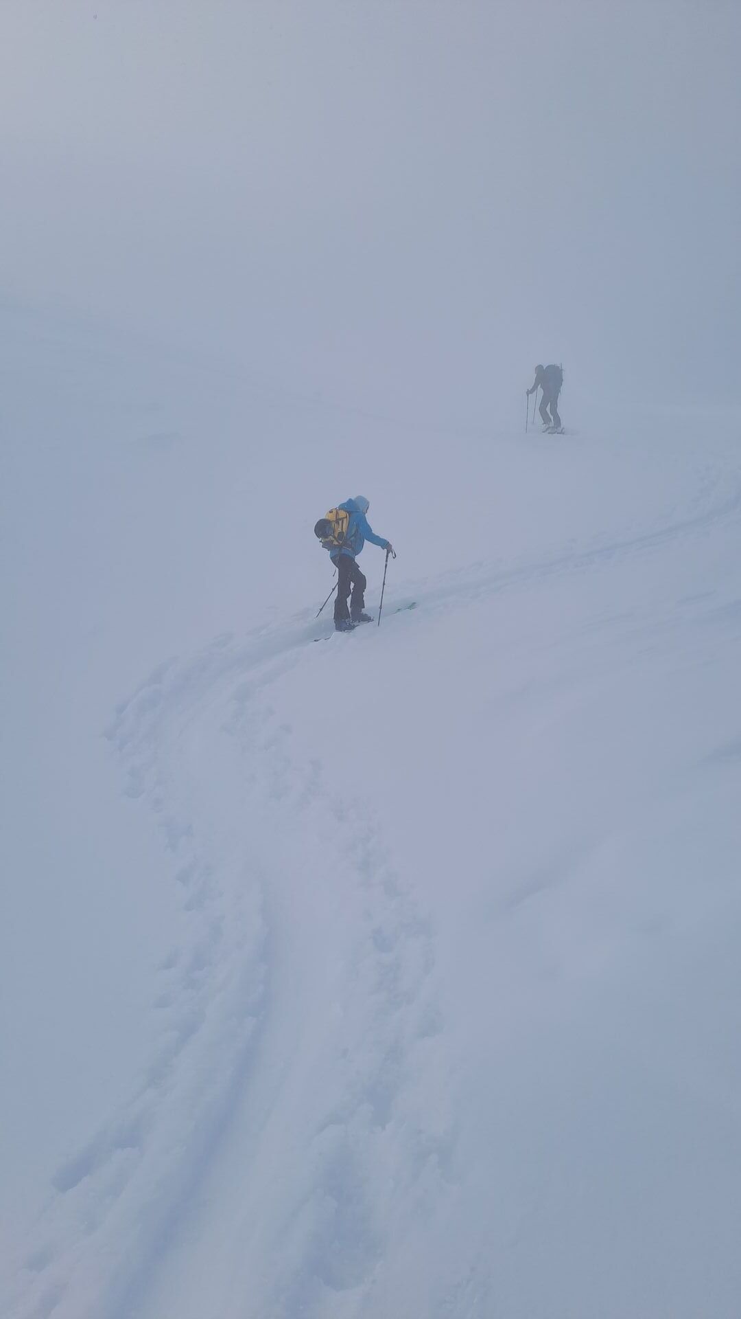 Bei Aufstieg zum Jägglisch Horn ziehen dann wieder Wolken herein und die Sicht geht auf unter 5m. Den letzten Hang zum Joch mit Sicherheitsabstand gegangen.