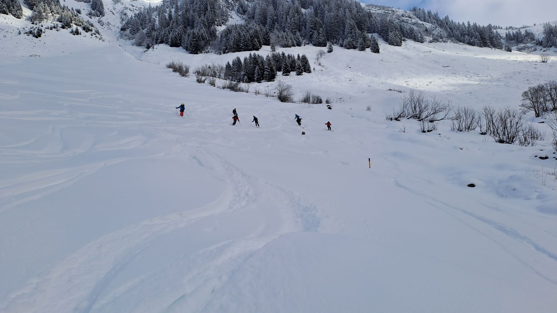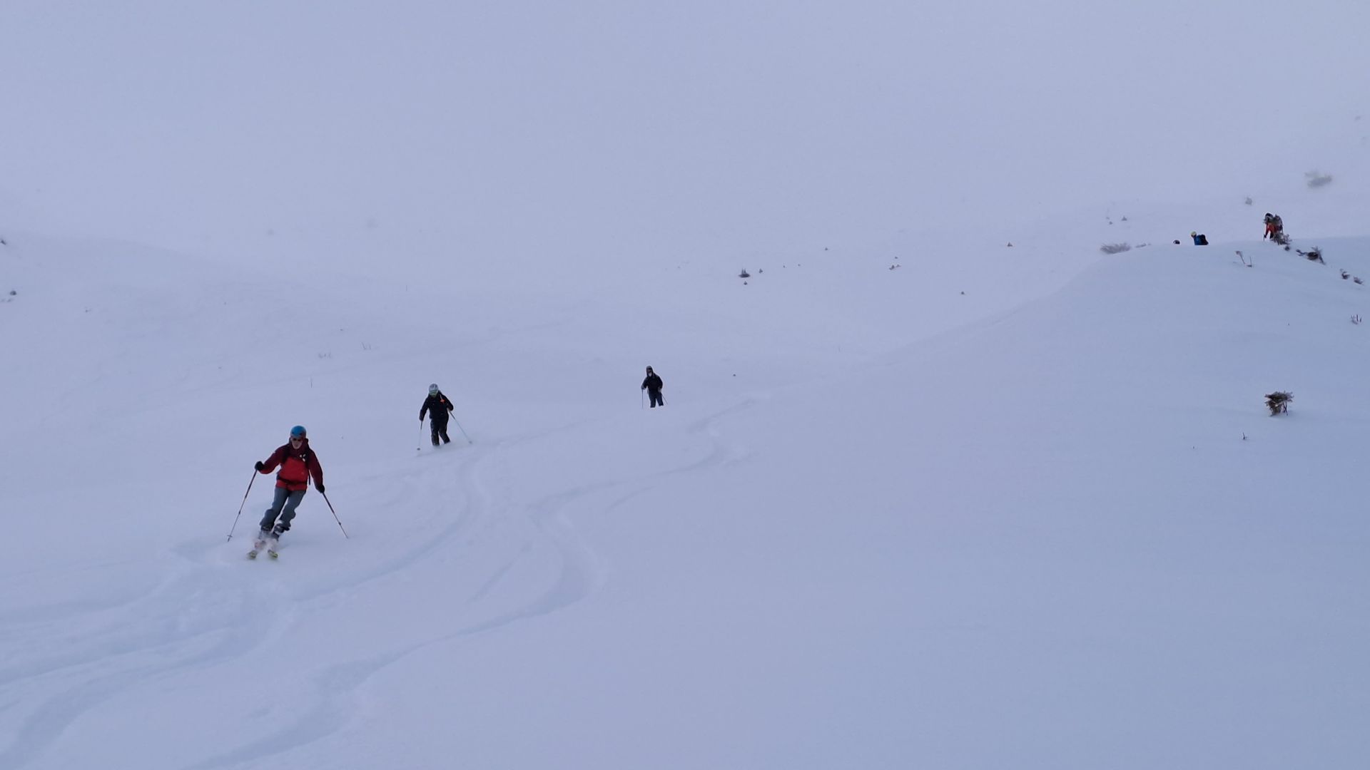 Trotz längerer Pause am Gipfel reisst es nicht mehr auf, und so fahren wir statt des schönen Gipfelhangs vorsichtig entlang der Aufstiegsspur ab. Erst allmählich wird die Sicht besser und wir genießen die Pulverhänge bis zum Talboden. Nach dem Tobel auf dem Weg geblieben, erst weiter unten gibt es noch ein paar schöne Wiesenhänge.