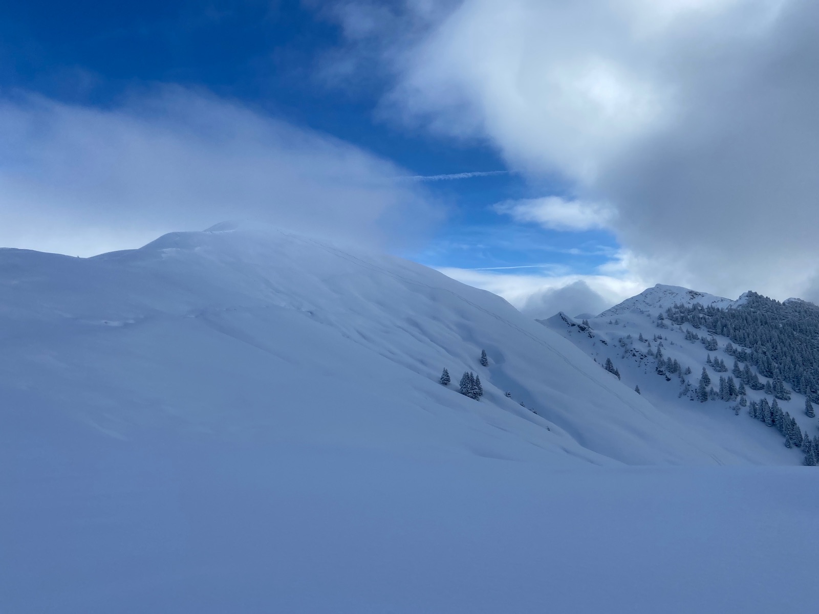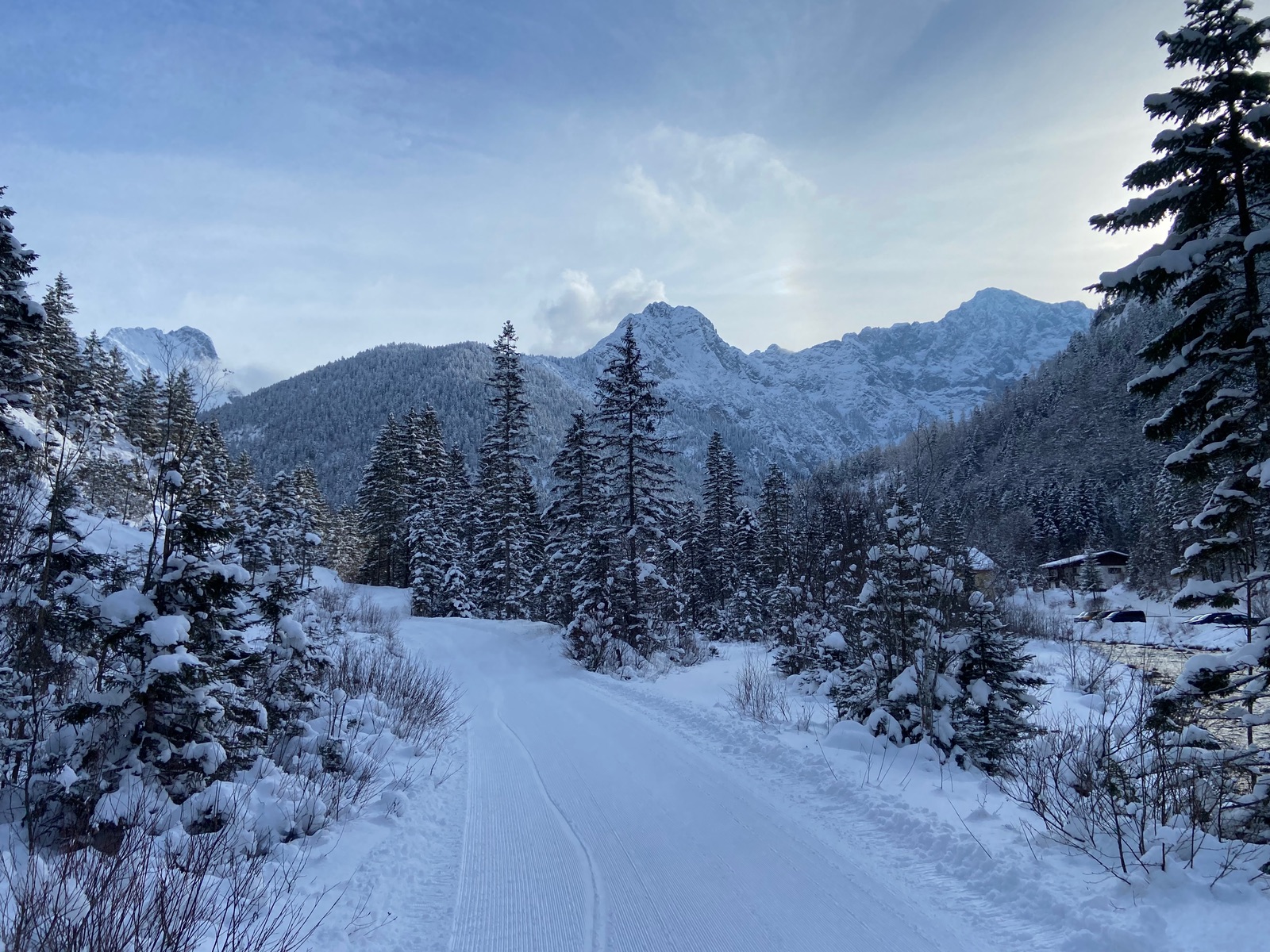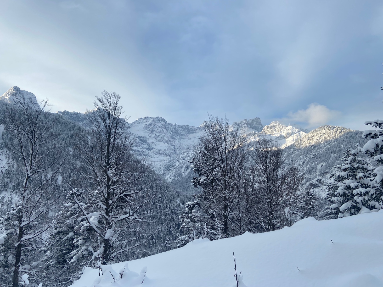 Der Neuschnee der letzten Tage ohne fehlende Grundlage macht einem die Auswahl der Tour nicht gerade leicht. Das Schönalmjoch habe ich aufgrund des langen Forstwegaufstiegs gewählt und weil die Tour tendenziell wenig Potential für Lawinen hat.