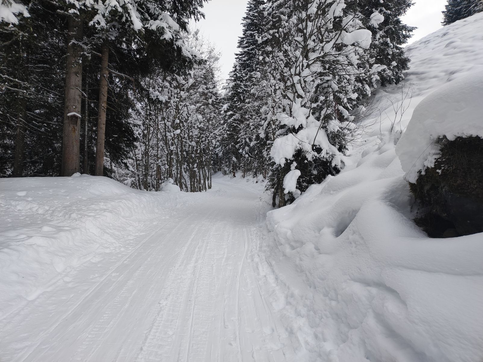 Auf der präparierten Rodelbahn (Teerstraße und daher keine Steine unterm Schnee) geht es bis zur Faulbaumgartenalm (liegt zwischen Kotjoch, Miefspitze im Pissgraben