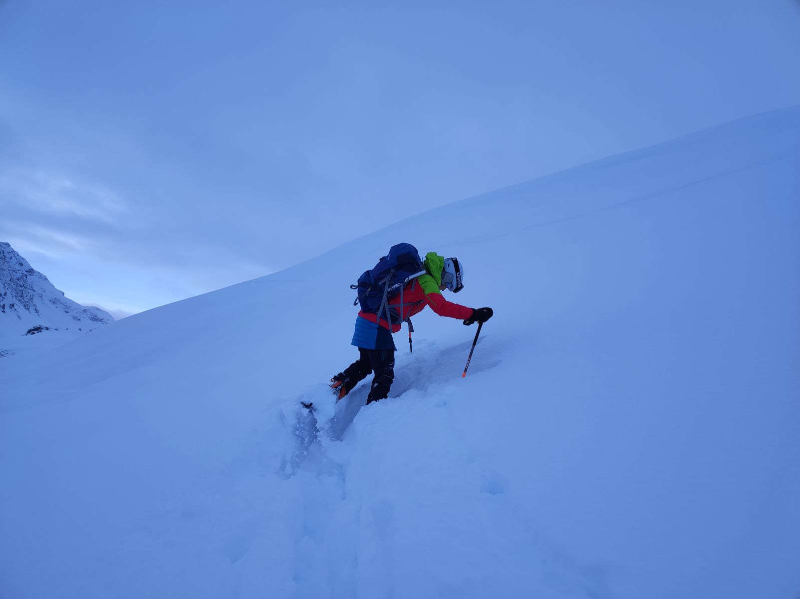 2: Claudia deutet zur (zurecht) legendären Nordabfahrt vom Galtenberg: Sensationell, aber bei LWS 3 mehr als tabu. Der kleinere Gupf rechts (Mareitkopf) ist hingegen fast immer machbar.4
