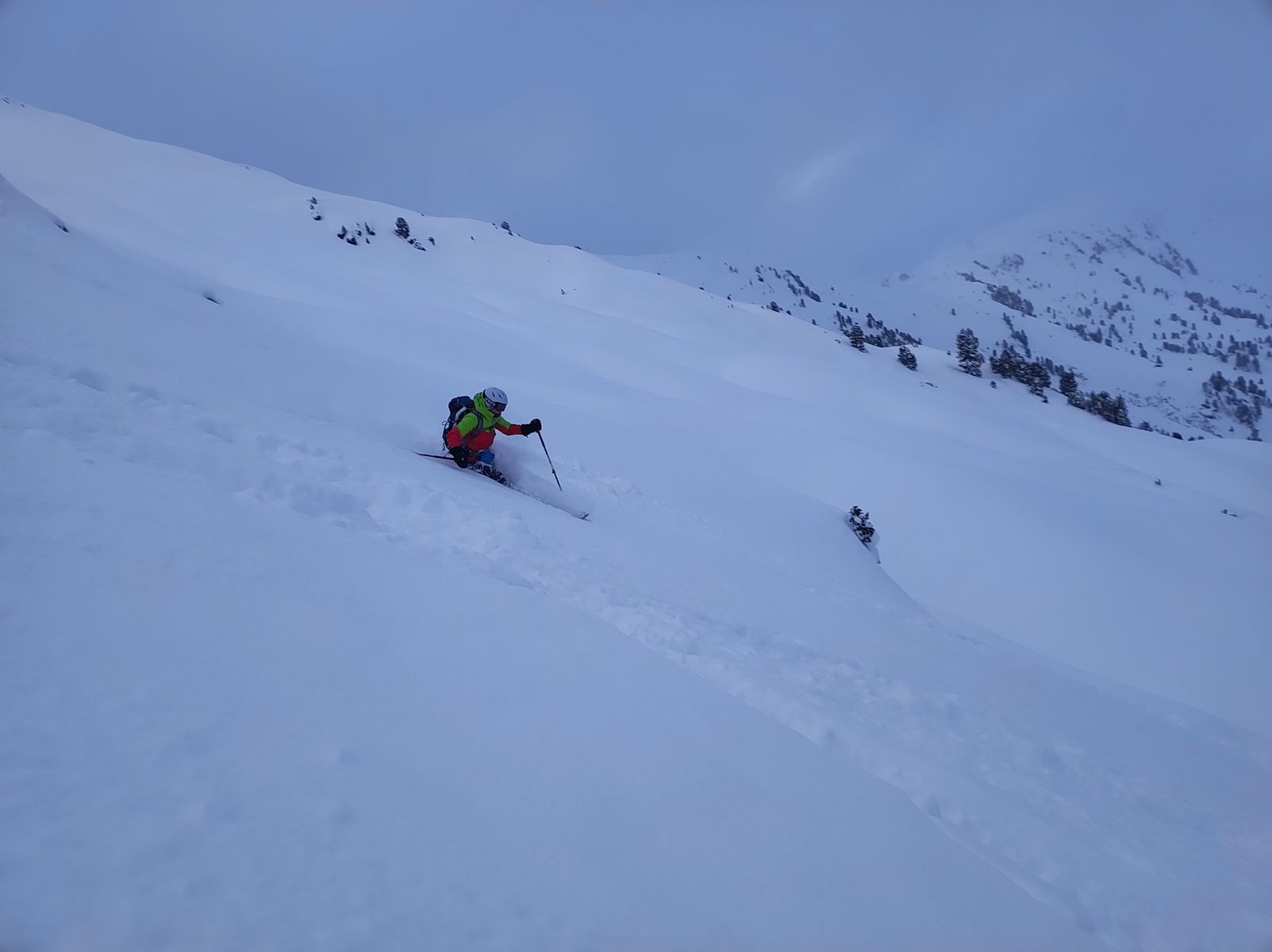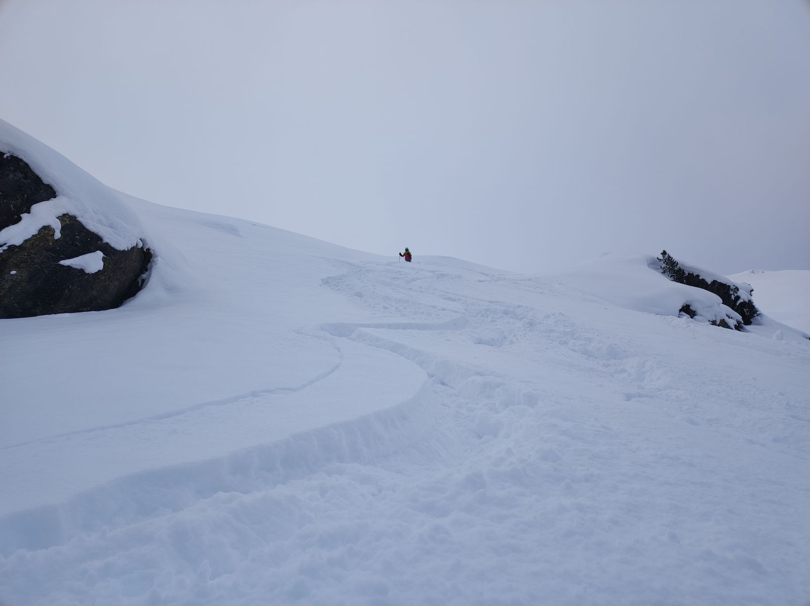 ). Kurz vor der Alm zweigt links eine Aufstiegsspur ab, von der ich irrtümlich annahm, sie führe zum Großen Beil. Obwohl die Gipfel heute oft in Wolken steckten, merkte ich recht schnell, dass das nicht der Fall ist, hatte aber auch keine Lust wieder umzudrehen, zumal der Aufstieg eine sensationelle Pulver-Abfahrt versprach. Letztlich sind wir dann eben am Kleinen Beil rausgekommen. Nach einer absolut berauschenden Abfahrt, bei der wir teilweise bis zur Brust im Schnee waren (Nippon-Pulver würde ich sagen), begann der zweite Versuch, das Große Beil zu besteigen, der dieses Mal am Sonnenjoch endete. Auch hier war mir eigentlich schon bald klar, dass wir den Abzweig verpasst hatten und zu weit in den Talgrund gestiegen waren, doch gab es zum Sonnenjoch eben eine Spur und zum Beil nicht. In der Rückschau muss ich zudem sagen, dass wir es zeitlich auch nicht mehr auf das Beil geschafft hätten, wenn ich da hoch in dem massiven Schnee hätte spuren müssen. Vom Sonnenjoch sind wir dann zunächst in mit Worten fast nicht beschreibbarem Pulver nach Süden abgefahren und dann noch mal 200 Höhenmeter zum Sattel über der Steinbergalm. Zu dieser sind wir über eine Spezialvariante durch ein System vom Canyons abgefahren. Von der Alm dann sehr flott über Spur und Rodelbahn zum PP zurück. Ein sensationeller Tourentag!