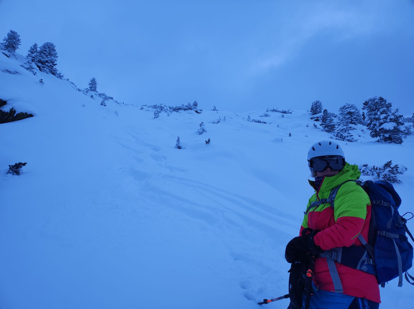 Lawinengefahr: Trotz der enormen Schneehöhe von bis 1,5 Meter in meinen Augen gering. Der Schnee war fast überall total fluffig und ungebunden. Von Steilheit und Schneemenge her kann man die recht kurzen Gipfelhänge von Kleinem Beil und Sonnenjoch (im Gegensatz zum Rest der Tour) zwar grundsätzlich als lawinenträchtig einstufen, doch war beim Kl. Beil kein Triebschnee vorhanden und der Hang am Sonnenjoch ist in meinen Augen trotz einer Steilheit von bis über 35 Grad und sehr viel Triebschnee zu stark gegliedert, um wirklich gefährlich zu sein. Der Ehrlichkeit halber sei aber angemerkt, dass eine Stunde vor uns eine 6er Truppe Alpinpolizisten den Hang gefahren ist... In der steilem Westflanke des Sonnenjochs sind einige kleinere Spontanlawinen (ohne Skifahrer als Auslöser) abgegangen.