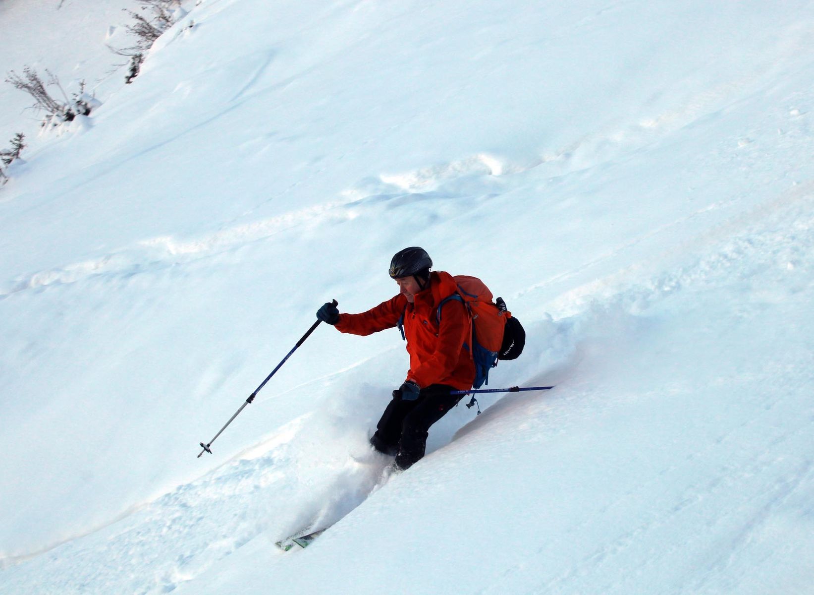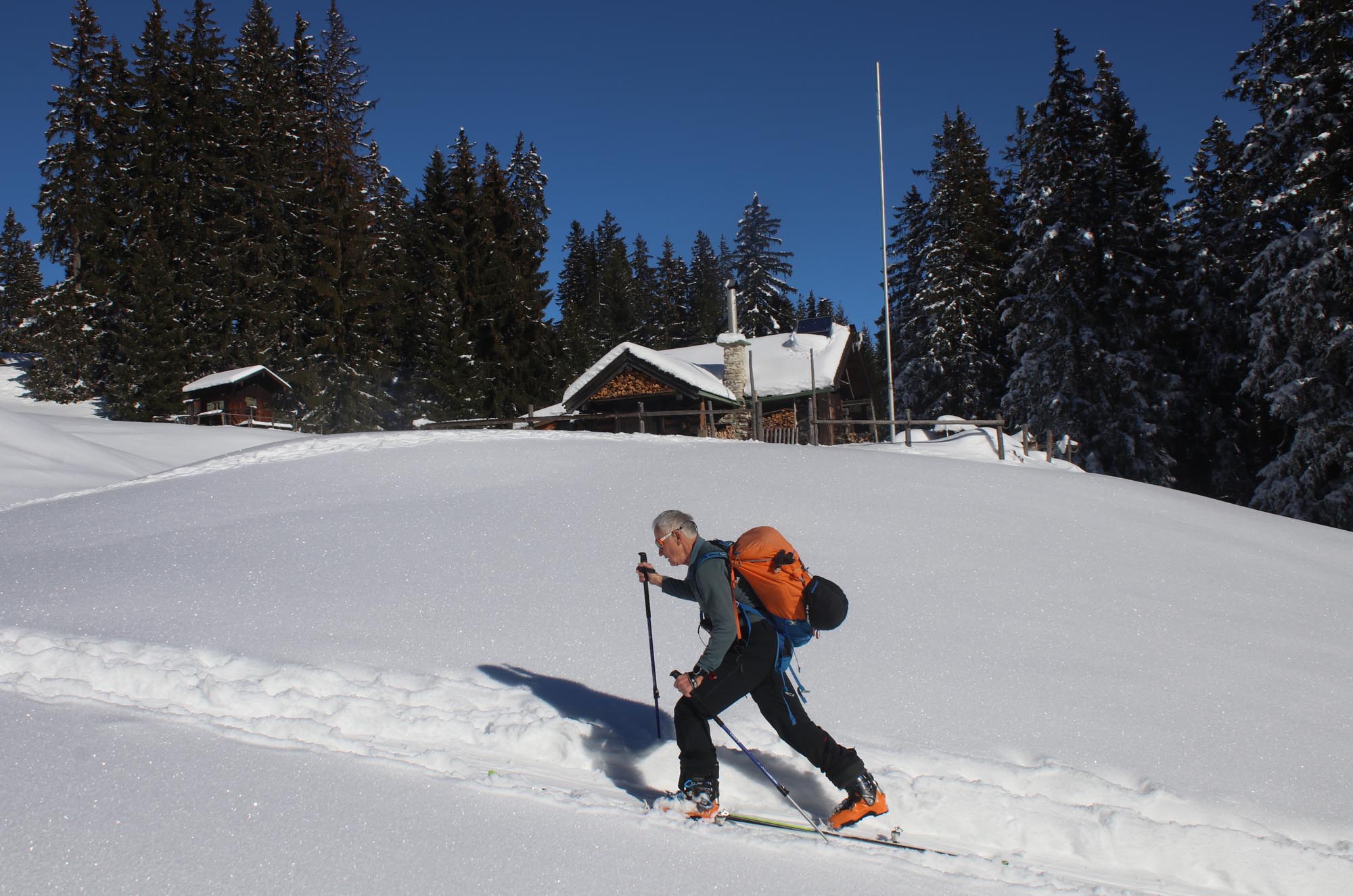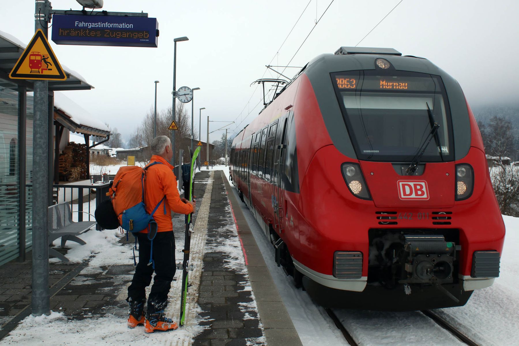 Die größte Überraschung war dann der große, ostseitige Wiesenhang. Powder vom Feinsten und das bei umsichtiger Abfahrt auch noch ohne Bodenkontakt. Im anschließenden Waldstück liegt freilich noch nicht ganz ausreichend Schnee, aber auch dort kamen wir bis zu den nächsten Waldschneisen recht gut durch. Weiter unten muss man allerdings ein von Baum-Rückung beeinträchtigtes Wegstück rechts umfahren. Die Schlussabfahrt auf der Forststraße war wieder perfekt ... zudem wir auch noch direkt den Zug zurück Richtung München erwischten.