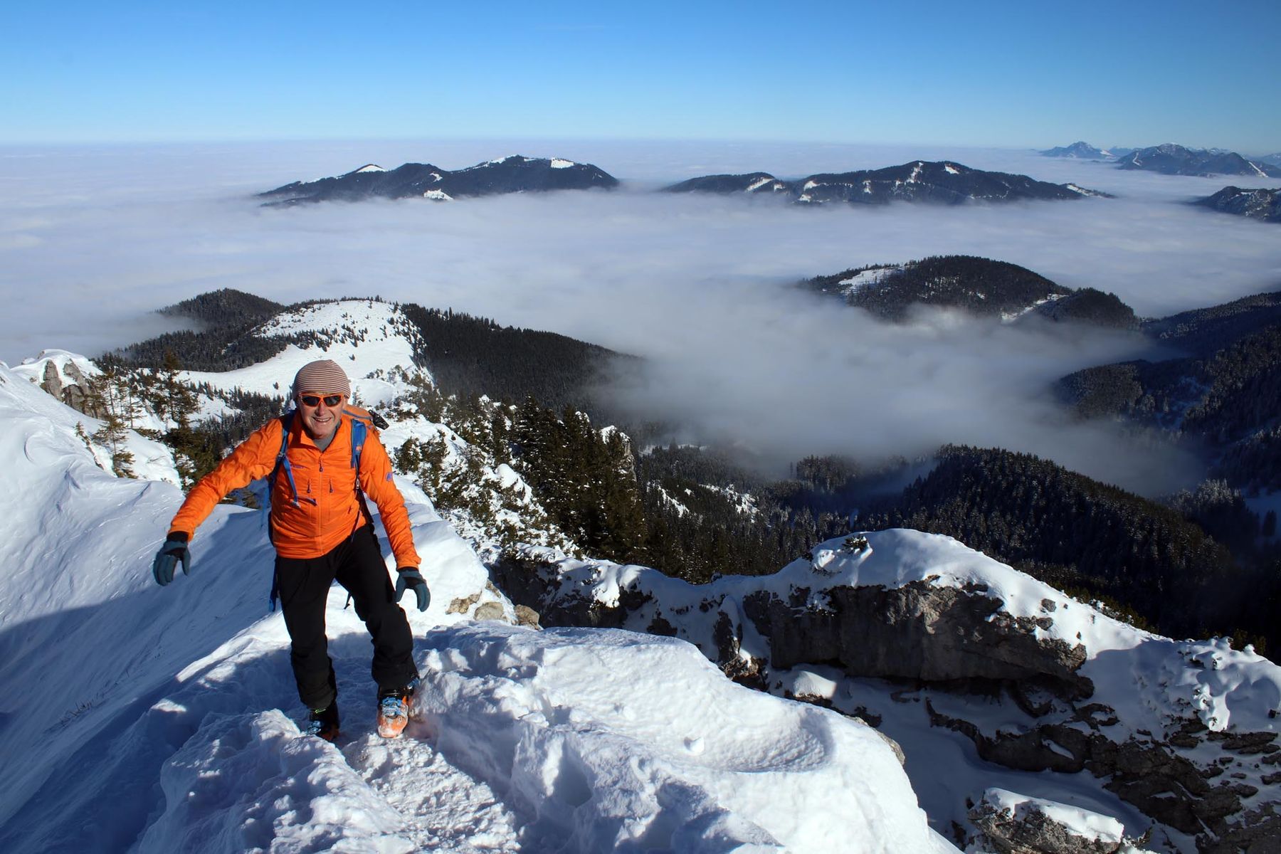 Unsere Zweifel wurden schnell ausgeräumt. Beim wunderschönen Anstieg über die Kuhalm liegt von Anfang an genug Schnee. Ab ca. 1200 Höhenmeter entkamen wir der Nebeldecke und genossen (bis zum Gipfel vollkommen allein) die herrliche Wintersonne.