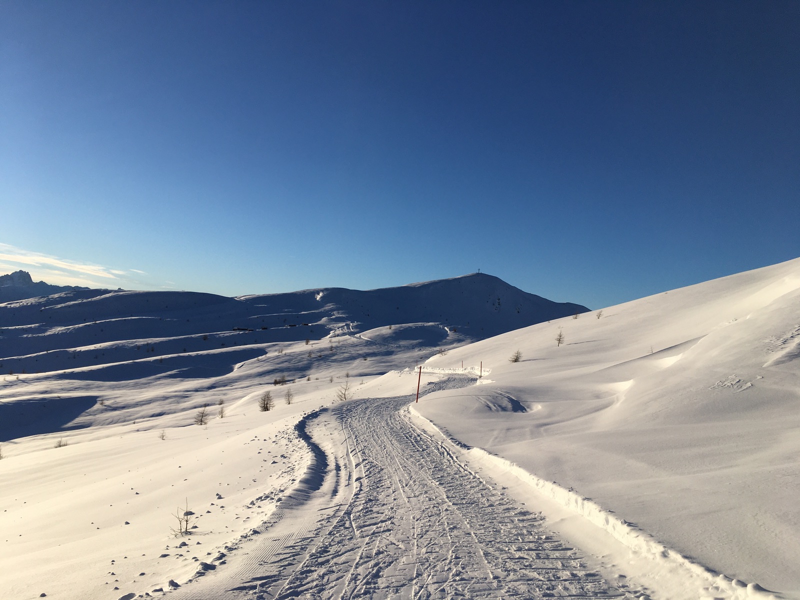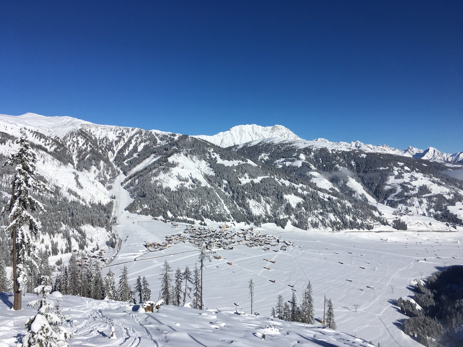 Blick zurück auf die Abfahrt vom Dorfberg - Pulver und ansprechende Landschaft auf der Hochloipe: