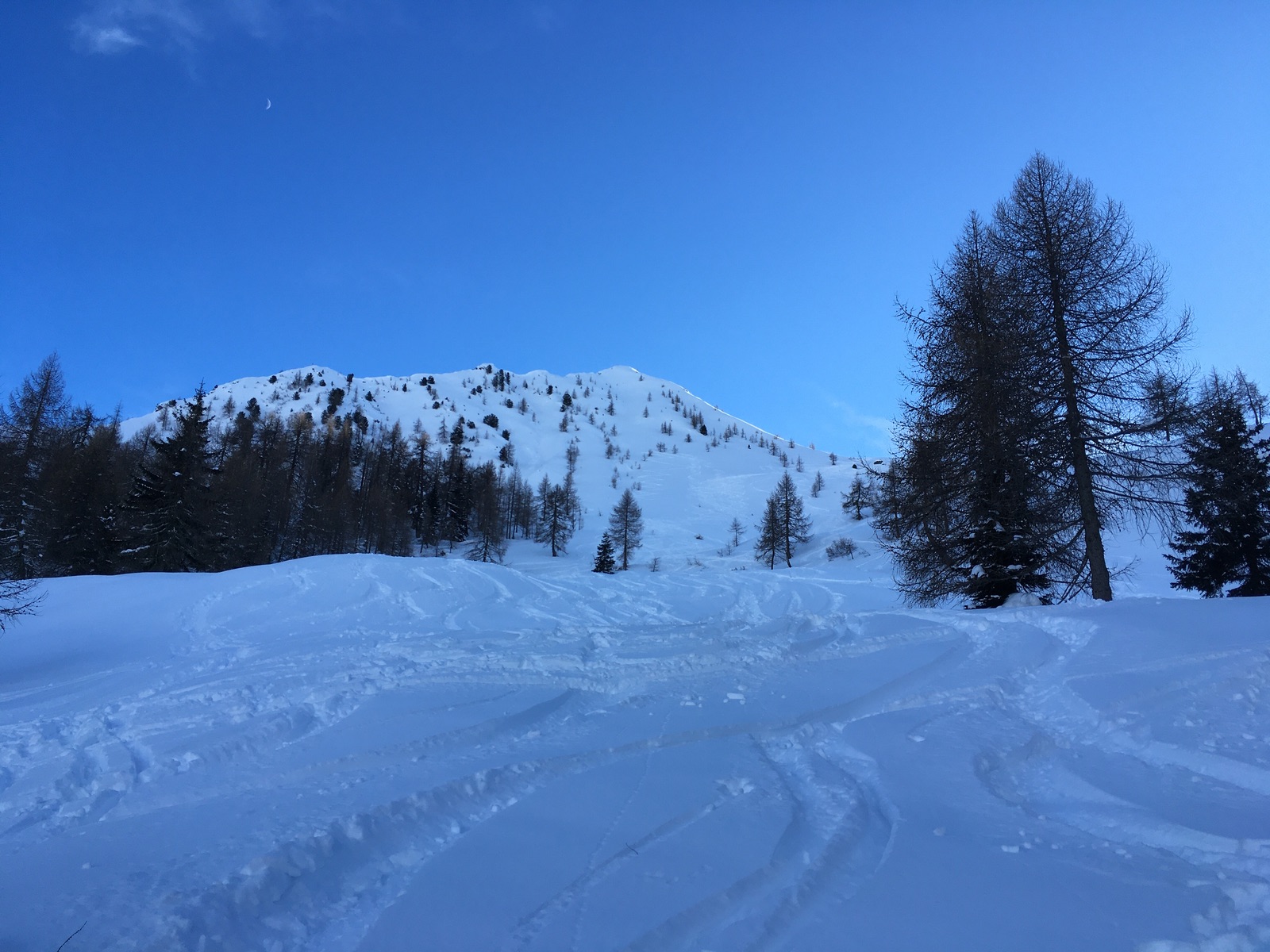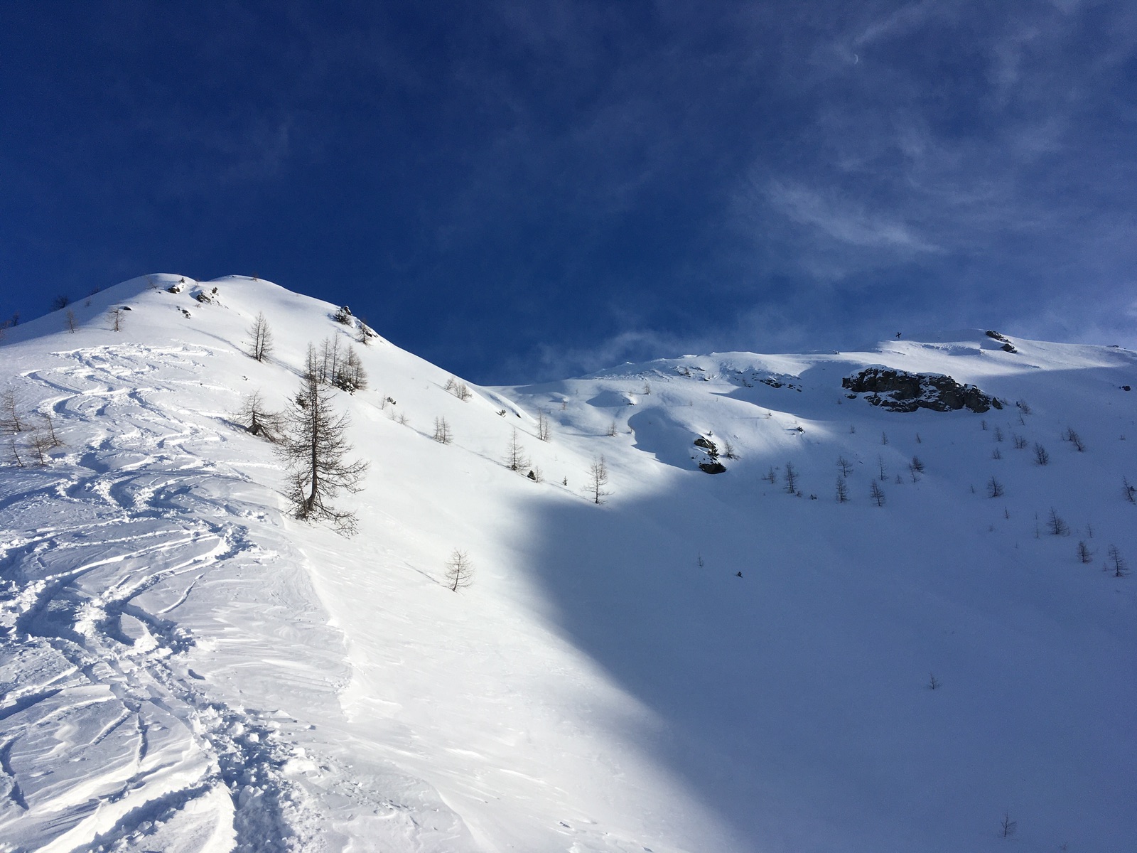 Sehr schöne Abfahrtshänge auch am Anstieg zum Riebenkofel vom Tuffbad aus: