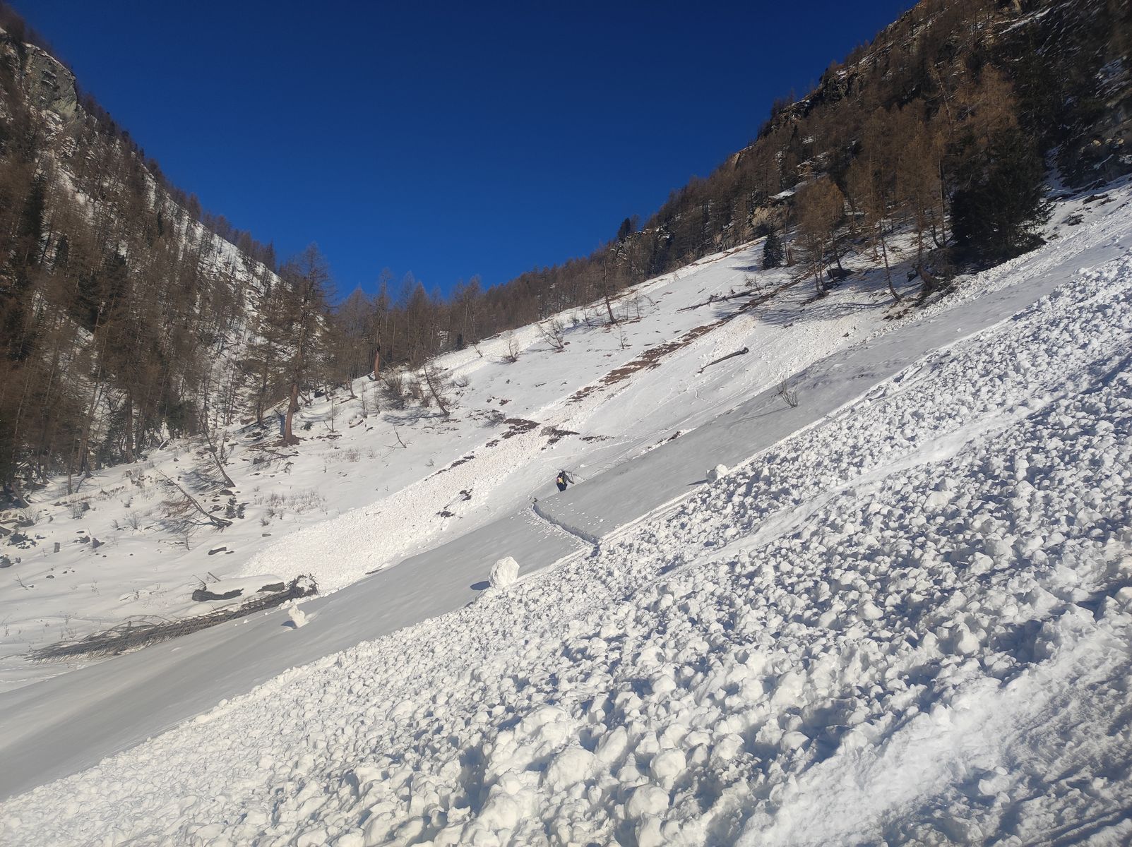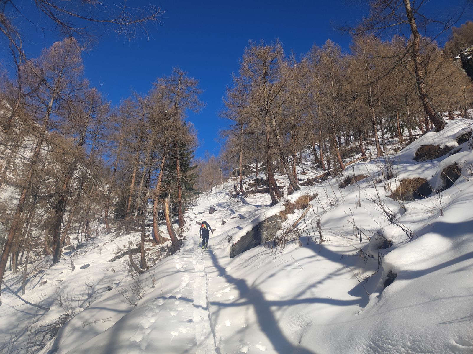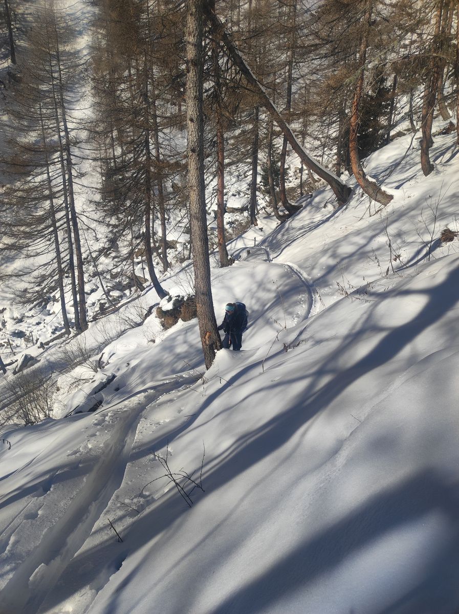 2/3: Im Wald liegen etwa 30cm, aber bei der Abfahrt bricht man zum Boden durch.