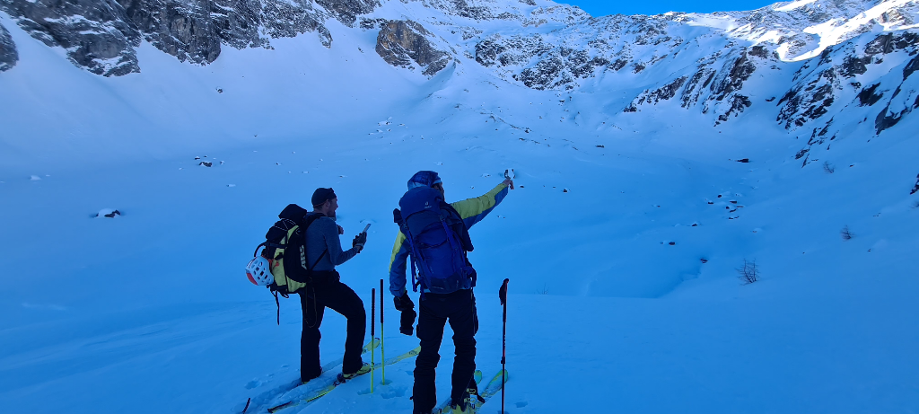 Auf den Bildern wird das Problem nicht zu sehen sein - daher eine kurze Beschreibung: Wir stehen im flachen Gelände und die Schneedecke präsentiert sich so, dass unten eine sehr harte Schicht ist, die mit einem Mischkonglomerat aus je nachdem Pulver, Schwimmschnee, Wind- und Schmelzharsch darüber gar nicht verbunden ist. Bereits in wenig geneigtem Gelände lösen sich bei Querungen die oberen Schichten. Die Hänge, die nun vor uns liegen schauen genauso aus, sind aber steil und mit Geländefallen gespickt. Oiso wieda nunter.