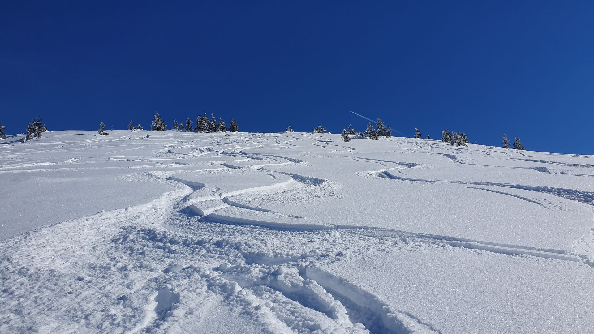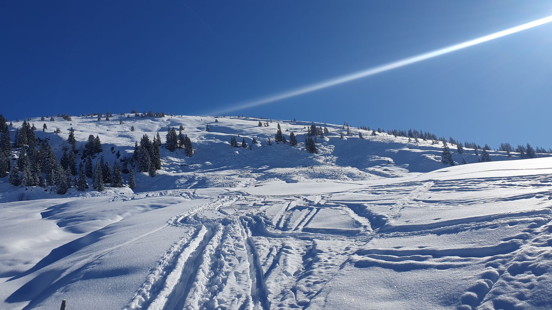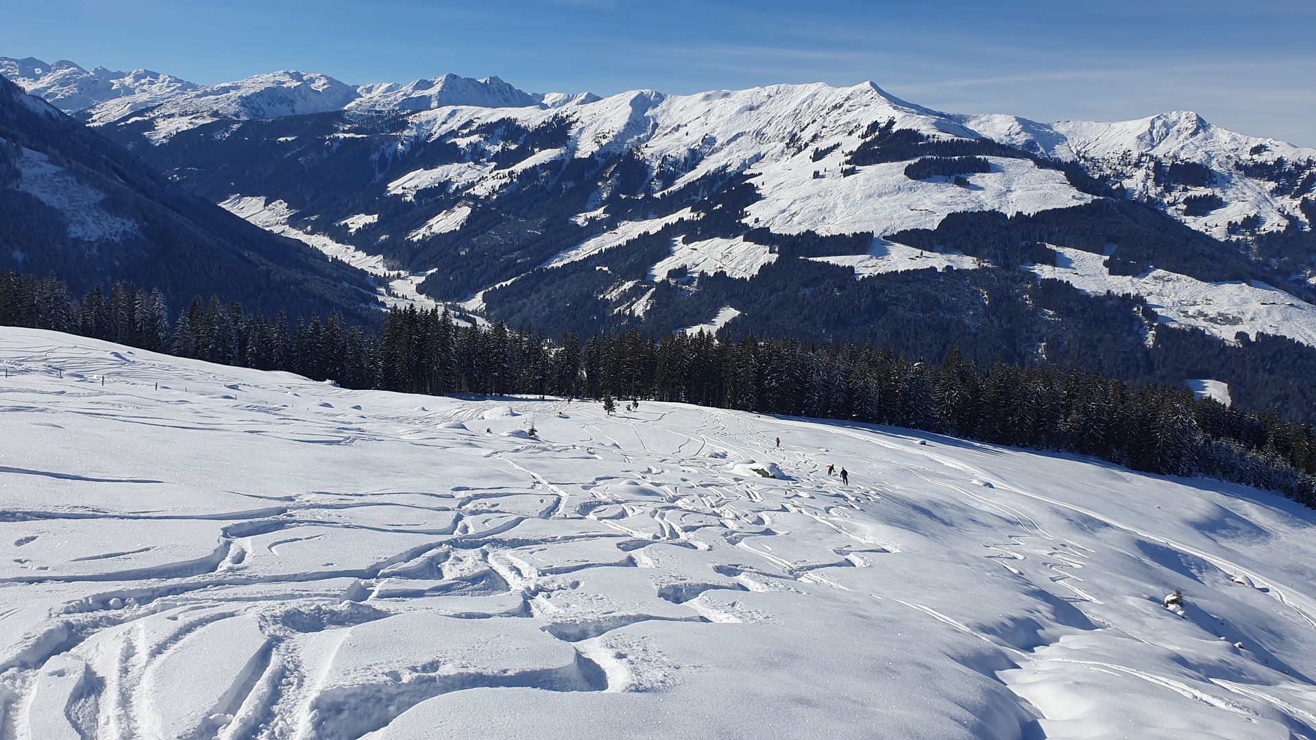 Am Ausgangspunkt der üblichen Route aus der Kelchsau nur wenige Parkplätze beim Briefverteiler vorhanden. Ca. 5 Stück, frühes kommen lohnt sich. Von Beginn an hat es gerade so ausreichend Schnee, dass man nicht die Wiese berührt. Entlang der geräumten und im unteren Teil gestreuten Straße nach Urschla. Man kann aber immer gut neben oder auf der Straße gehen. der Schnee wird mit zunehmender Höhe nur langsam mehr. Bei der Schneelage sieht man mal, wie bucklig die Almwiesen sind. Es geht sich aber ganz gut. Mit einigem Gespür finden sich in der Abfahrt relativ viele Stellen mit feinstem Pulver. abgelöst von nicht so guten buckligen Passagen. Dank der tiefen Temperatur hatten wir bis runter aber oft unverspurte Bereiche und man kommt gut wieder zurück zum Ausgangspunkt. Generell war heute von der Ostseite mehr Betrieb als auf unserer Route.