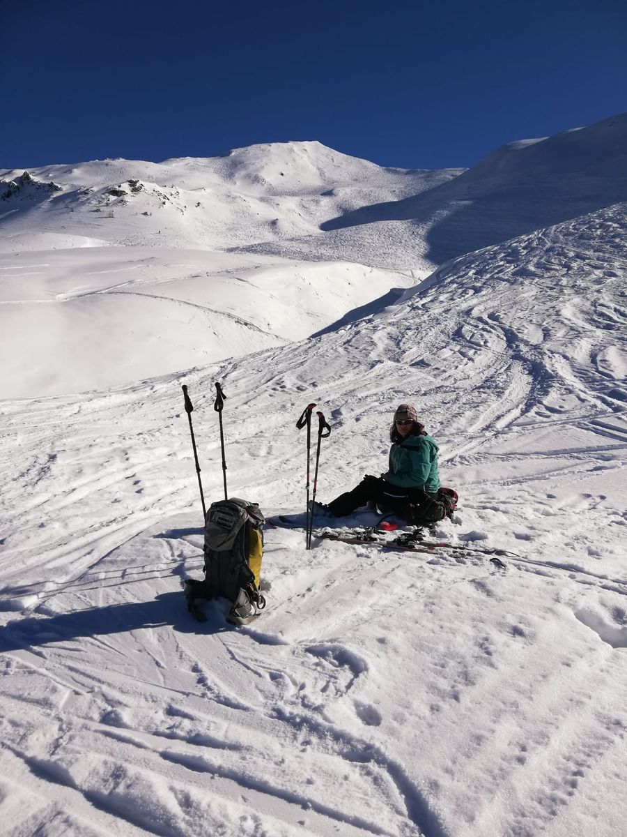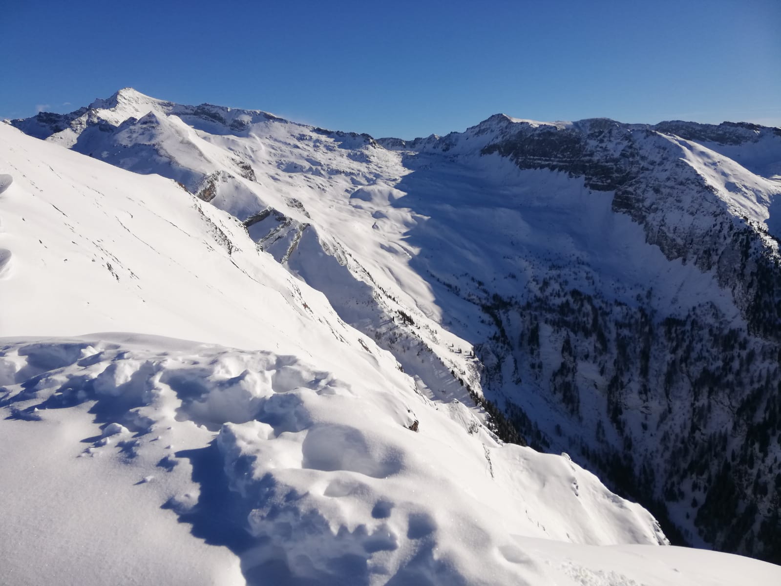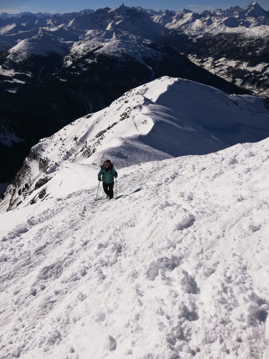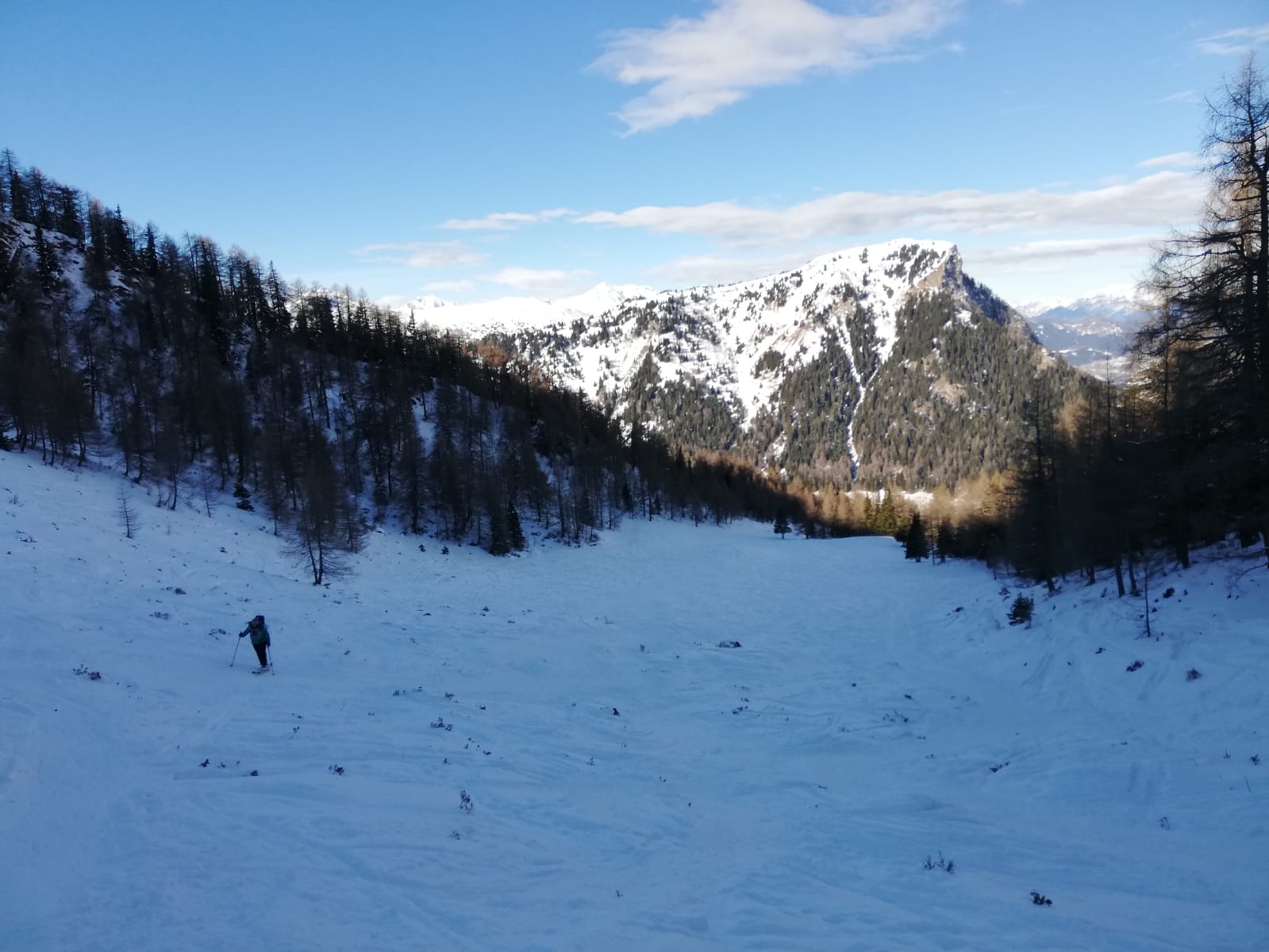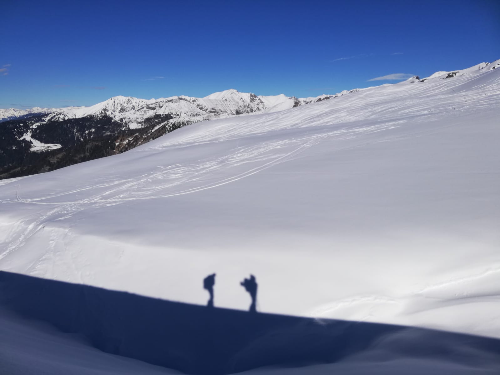 Heute vom Auto weg über 800Hm hindernislose Hänge auf die Vennspitze. Zunächst auf breiter Waldschneisen, später freie Hänge, die zwar aufgrund des Wochenendruns schon ziemlich zerfahren waren, aber noch ein bisschen Platz für neue Spuren im Pulverschnee ließen. Insgesamt ausreichend Schnee, unterhalb der Waldgrenze schaut aber überall das Gras durch. Hier ist es auch pistenmäßig eingefahren.
