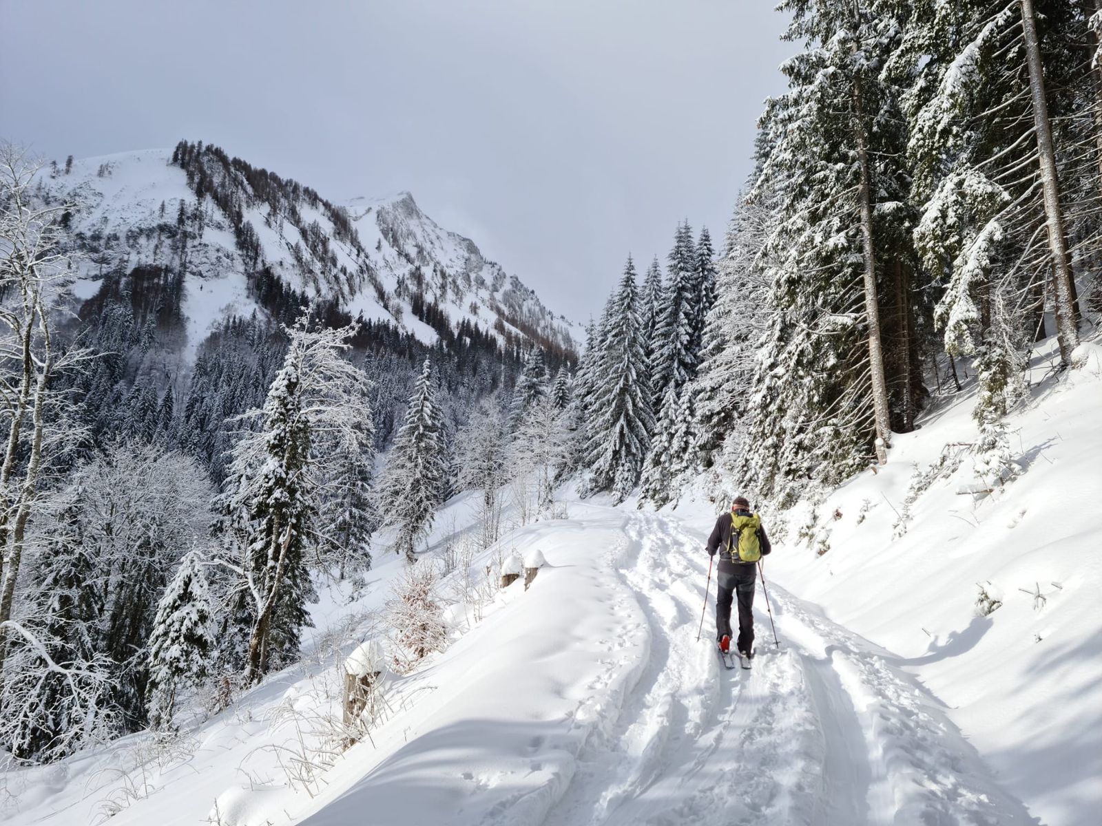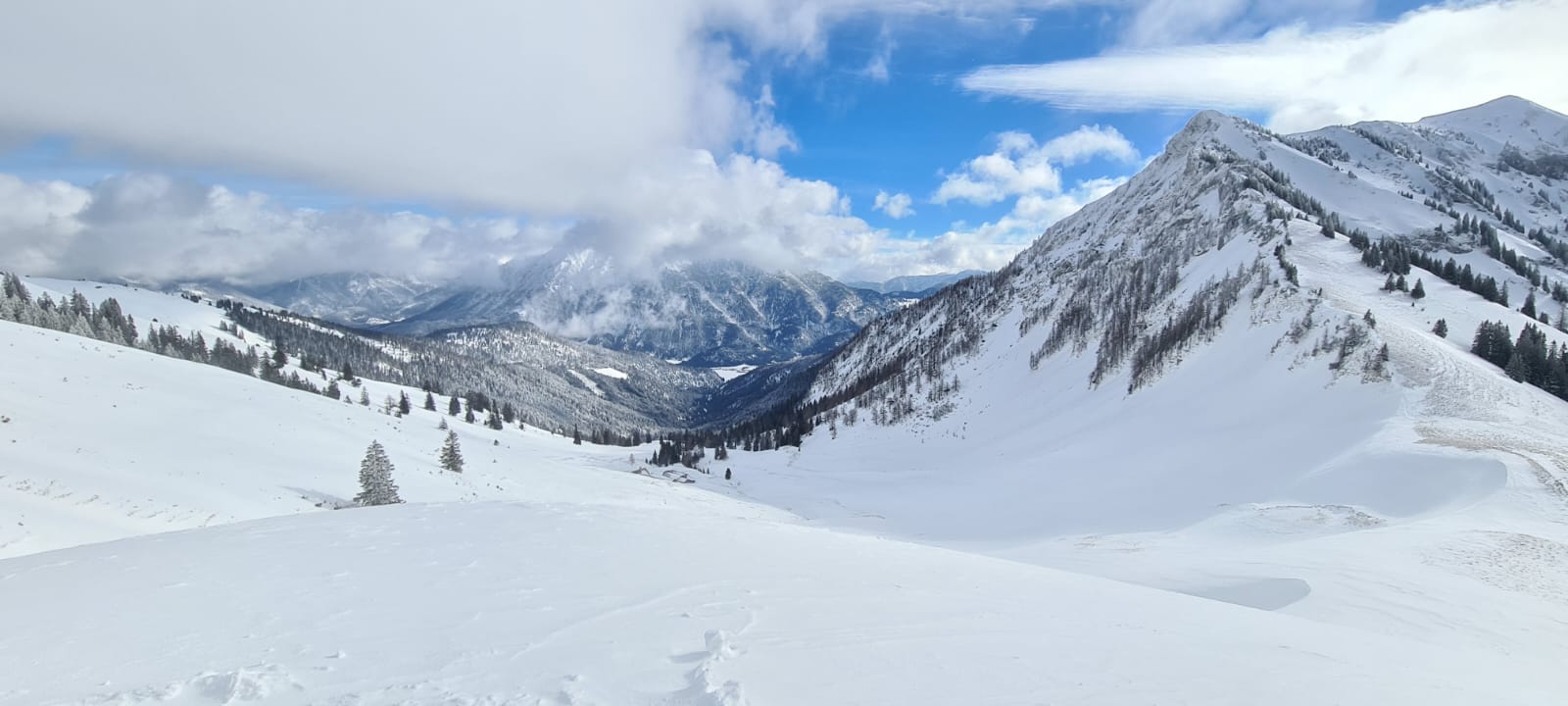 Verhältnisse: Während auf Bayerischer Seite nach wie vor Schnee fehlt - so mein Eindruck bei der Anfahrt - hat es auf Tiroler Seite etwas mehr geschneit. Wobei es auch da zumindest kurzzeitig bis in die Tallagen geregnet haben muss (siehe auch Bericht vom Andi). So gab es vom PP weg ausreichend Schnee, am Morgen im unteren Bereich hart gefroren und auf dem Weg mit ziemlich vielen Fußgängerspuren. Ab ca. 1100 m wurde es dann pulvrig. Keine großen Neuschneemengen (ca. 20 cm), aber der sehr feine Pulver lag auf einer harten tragenden Unterlage und war soweit ausreichend, dass man alte Spuren nicht gespürt hat.