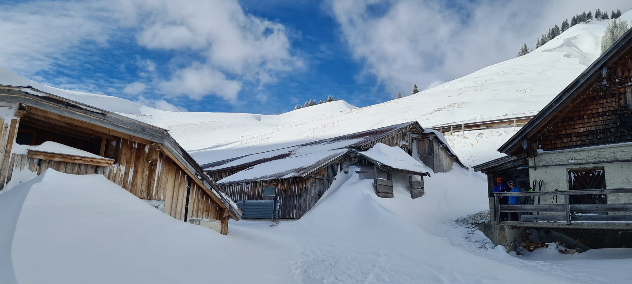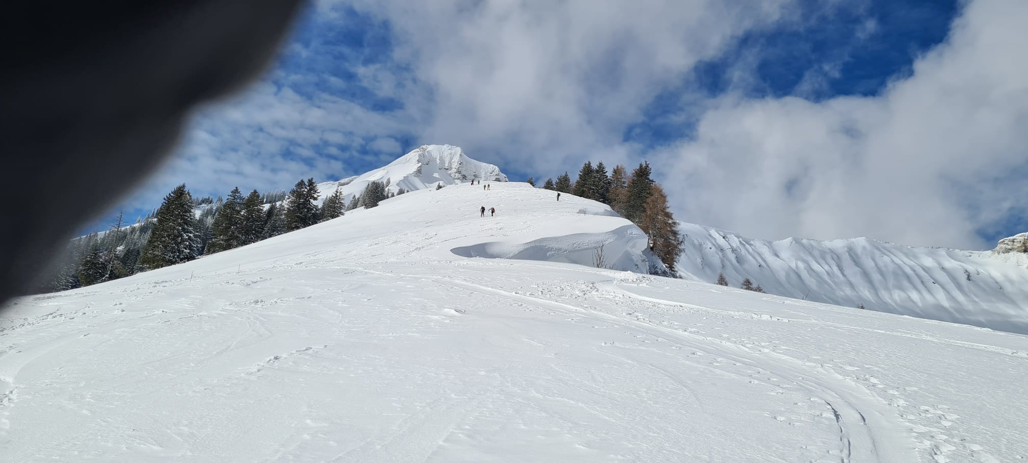 Allerdings hatte und hat es oberhalb der Waldgrenze immer noch viel Wind (in der Waldschneise dagegen super Pulver!). Unterm Gröbner Hals daher windgepresster Schnee, der aber sehr gut zu fahren war, weil man nie eingebrochen ist.