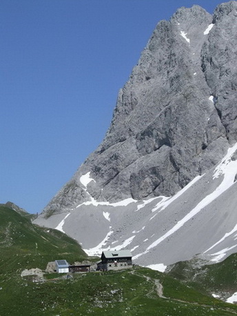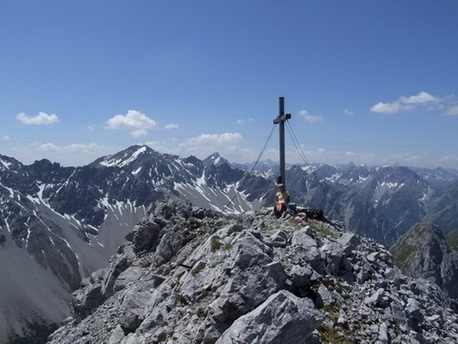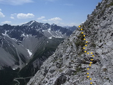 -- der Gipfelanstieg ab Steinjöchl beginnt mit einfachem Gras- und Schrofengelände; im Mittelteil sind steile Schrofenhänge zu queren (eigentlich nicht schwierig (I), aber tw. schmal und luftig, s. Bild4). Direkt unterhalb des Gipfels führt die eigentliche Route durch eine Rinne, in der derzeit aber noch ein lästiges, dickes Schneefeld herumliegt. Das Begehen des Schneefelds ist nicht ratsam (tiefe Hohlräume, Abrutschgefahr im Steilgelände). Man muss sich also entweder im Spalt zwischen Schnee und Fels durchzwängen (dabei den Ausstieg nicht verpassen) oder man sucht sich gleich eine eigene Route im Fels. Beides ist mit etwas Turnerei (I-II) verbunden....