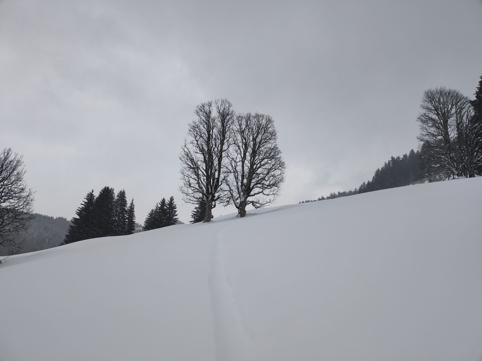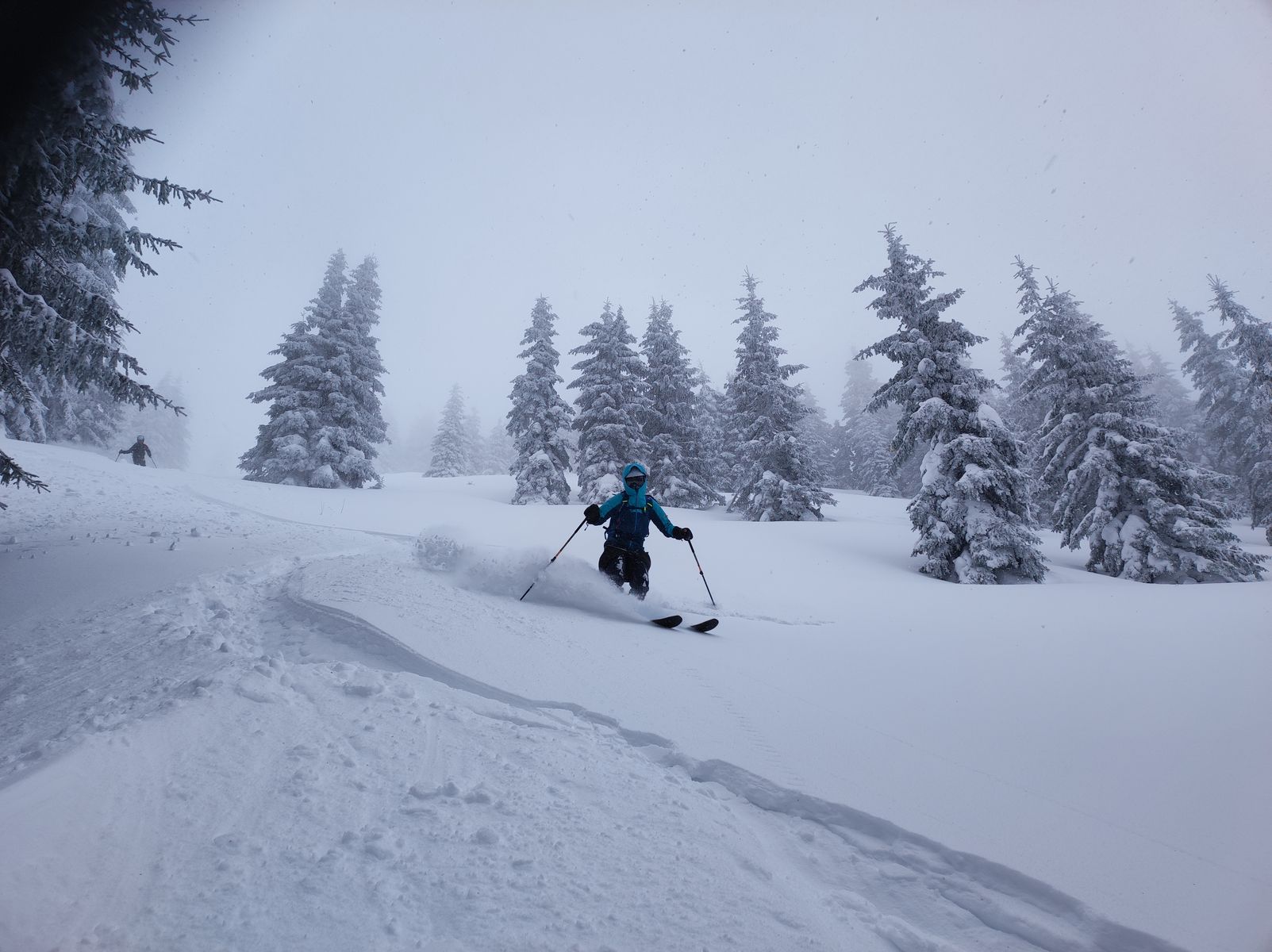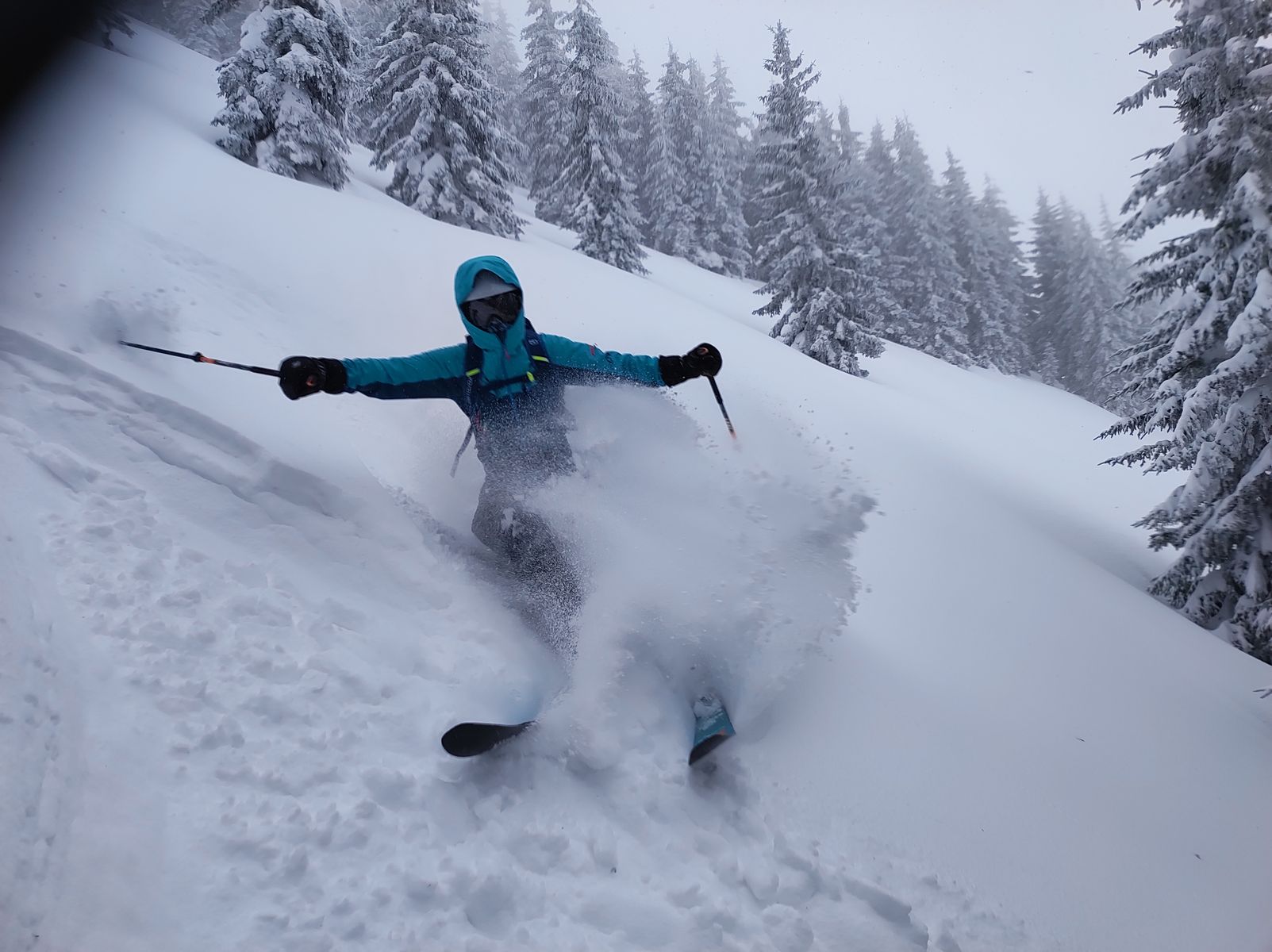 Am Samstag ging es zunächst mit dem Auto nach Hintermoos bei Saalfelden und von dort auf der üblichen Route zur Marbachhöhe. Am PP hatte es genau 0 Grad und es schneite. Beim Aufstieg wurde allerdings schnell klar, dass es in der Nacht noch bis etwa 1200 Meter geregnet hatte, da sich unter dem Pulver eine sehr nasse Schicht befand - in der Abfahrt bedeutete dies unterhalb von 1200 Bruchharsch, der sich aber einigermaßen fahren ließ. Weiter oben war dann reinster Genusspulver!