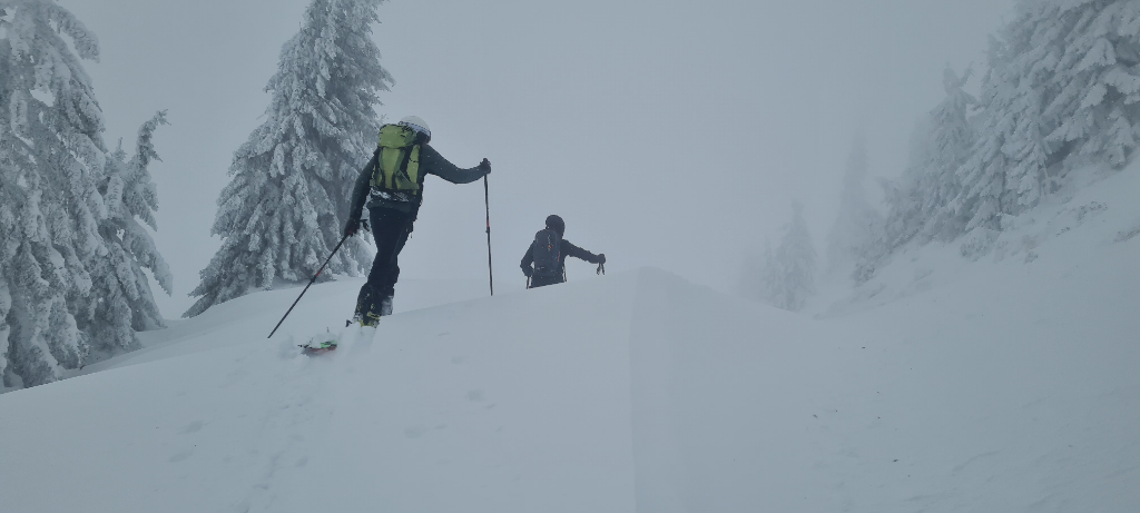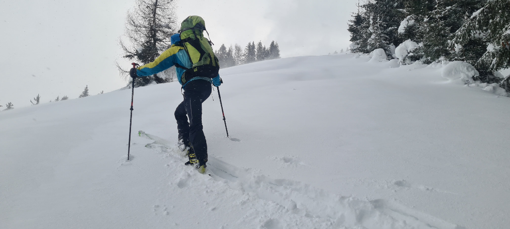 Der Anstieg führt lange durch schönen Wald; erst die letzten 200 Hm sind im freien Gelände. Sobald wir aus dem Wald kamen, wurden wir von sehr starkem Sturm erfasst und brachen dann etwa 50 Hm unter dem Gipfel wegen der schlechten Sicht ab. Nach einer gemütlichen Abfahrt im Bereich des Aufstiegs bis zur Neualm (ca. 1200m) sind wir nochmal hoch und über die Nordwest-Flanke zur Eggeralm und schließlich ins Tal abgefahren. Bei dieser Abfahrt haben wir uns wegen der Lawinengefahr hauptsächlich im Waldbereich gehalten und die sonst üblichen freien Hänge gemieden.