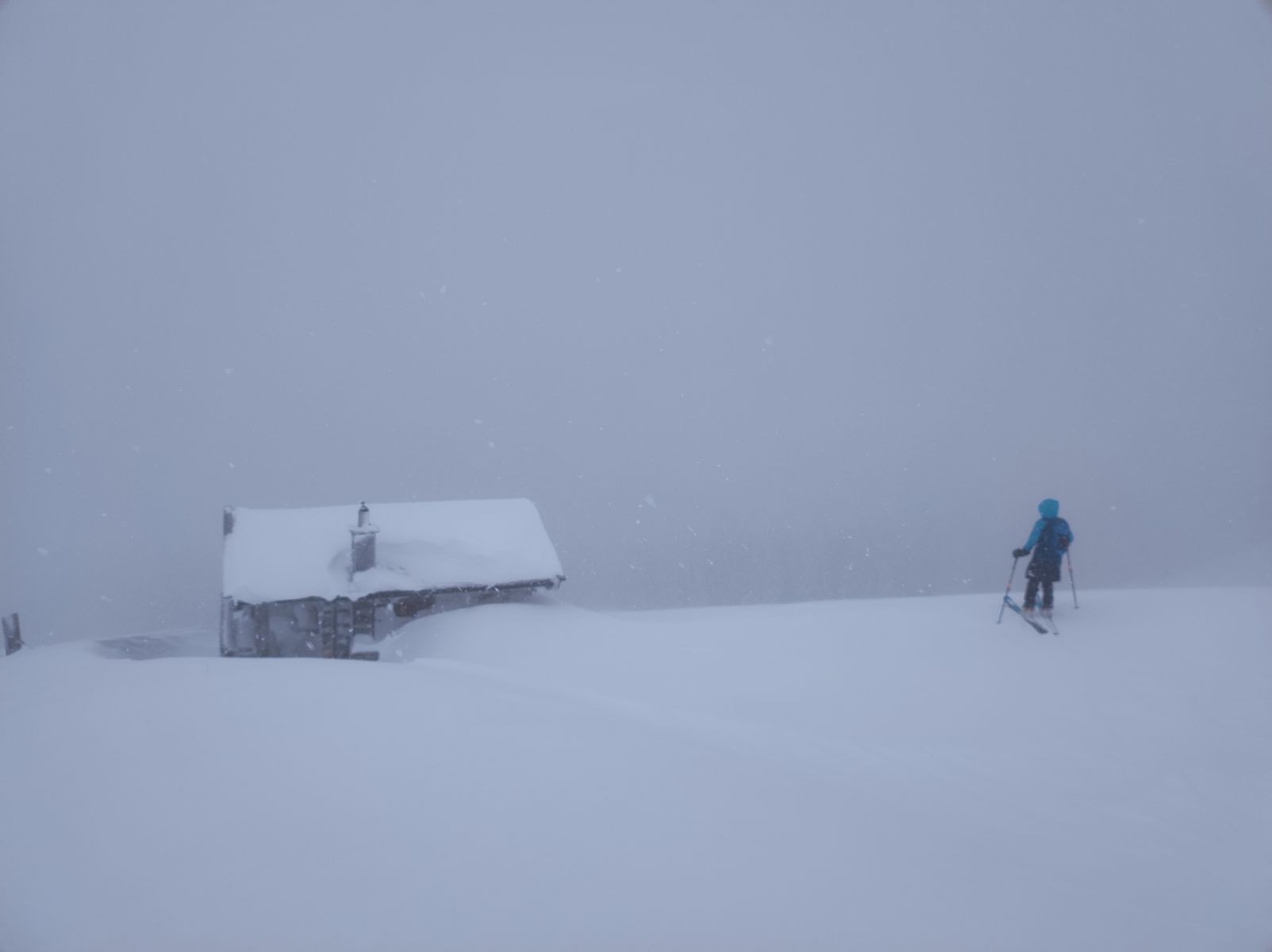 6/7: Weiter oben dichter Nebel im freien Gelände - eine fast unheimliche Stimmung.