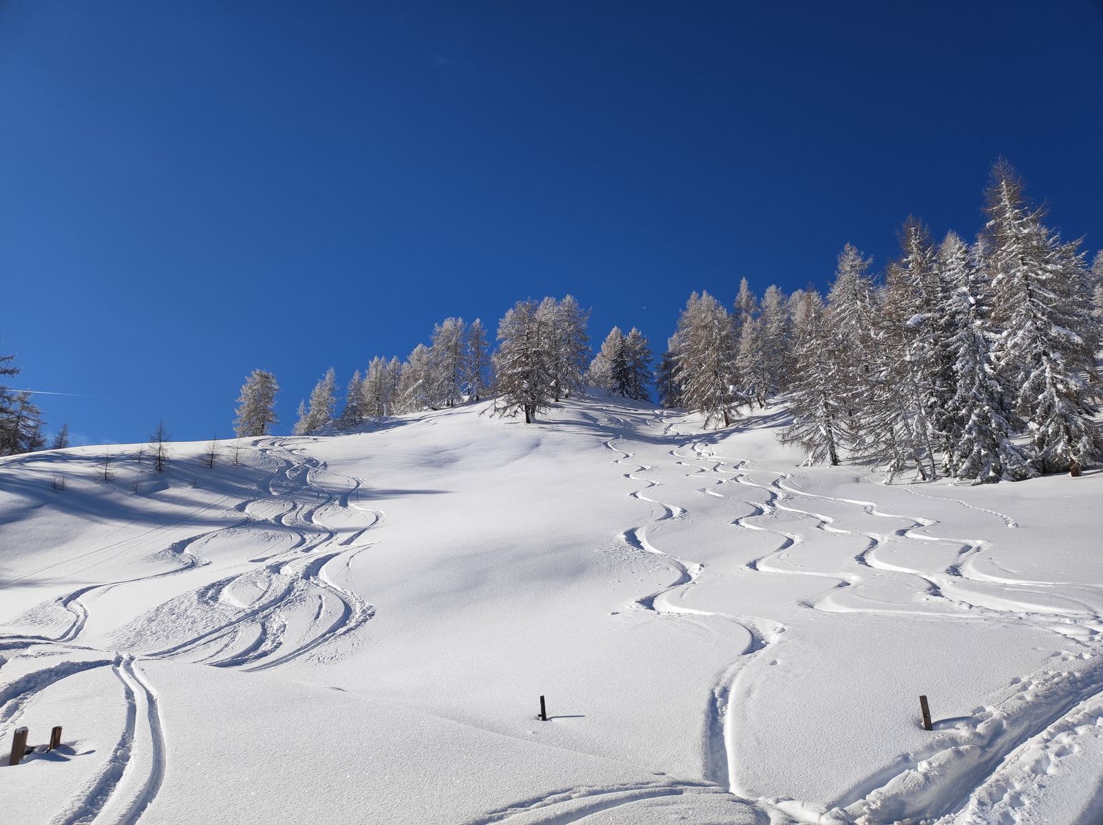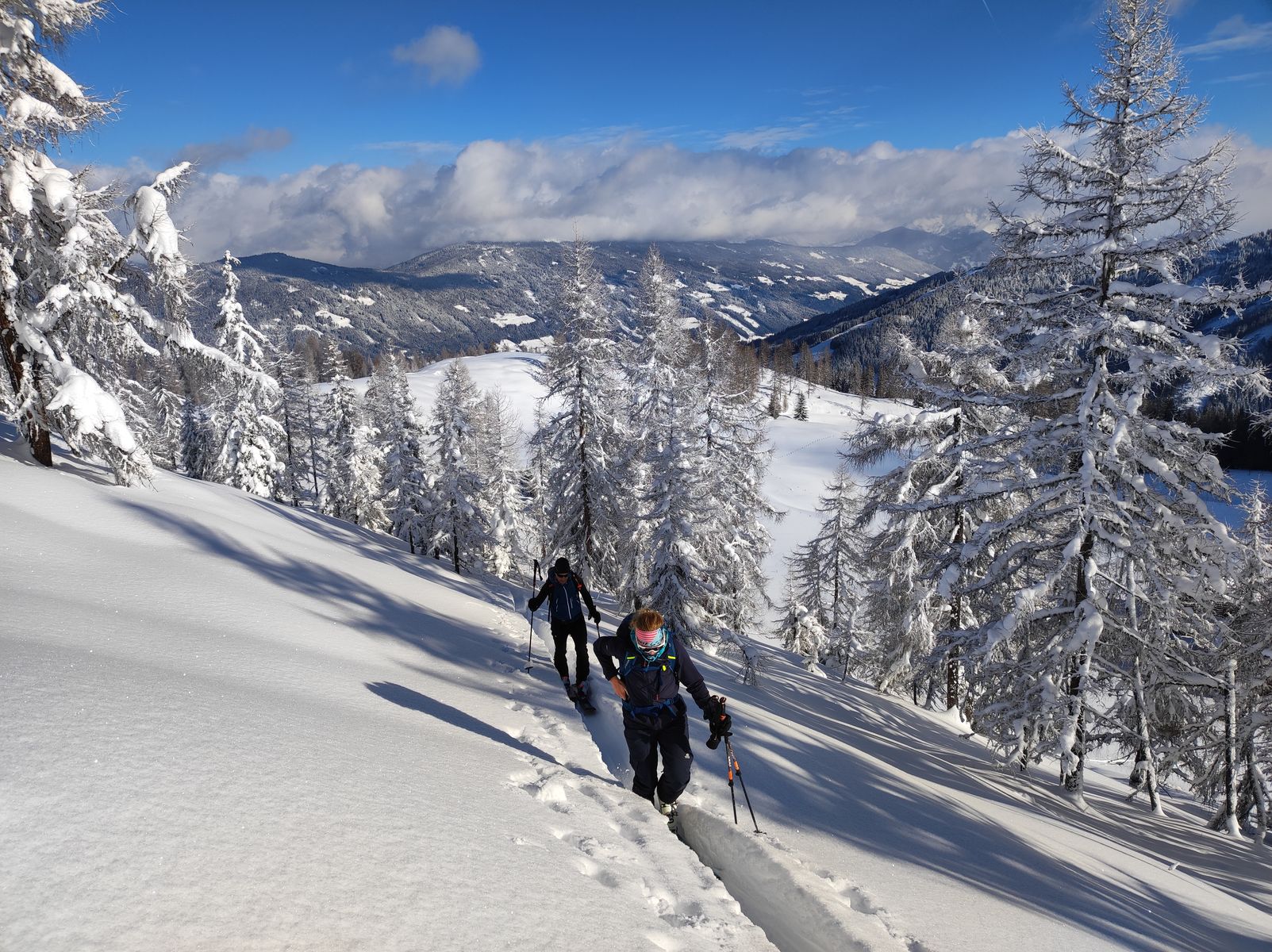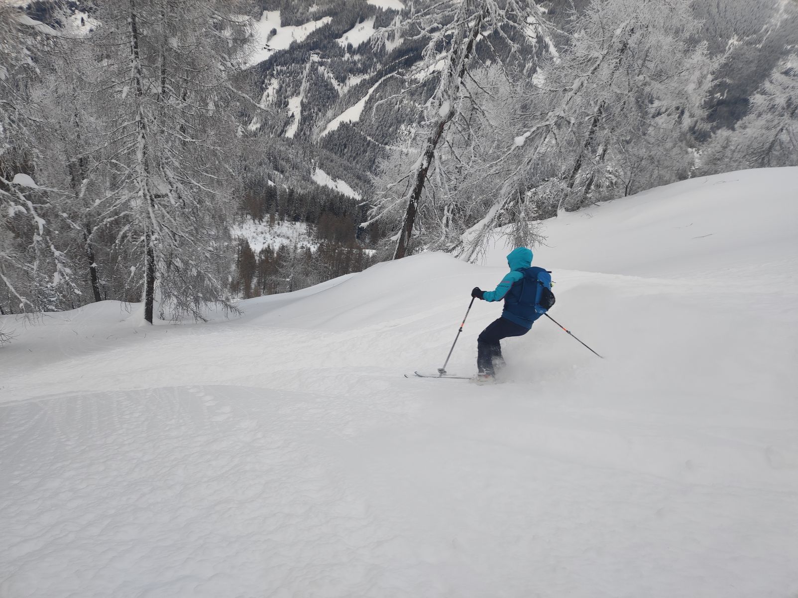 Aber der Reihe nach: Vom PP sind wir zunächst über den Sattelbauern zur Lackenalm und von dort auf den nahen Gupf namens Eibenkopf. Die Abfahrt von diesem ist zwar schön, aber mit 70 Höhenmeter kaum des Abfellens wert. Bis hier war eine Spur von gestern vorhanden, doch der Lackenkogel selbst war noch jungfräulich unberührt, sodass ich in den Genuss kam, den Gipfelanstieg über den Nordwest-Rücken selbst zu spuren. Durch hinreißend malerisch vereisten Lärchenwald geht es unschwierig bis in eine kleine Senke vor dem Gipfelaufbau. Die letzten 100 Hm sind recht steil und der hier befindliche Latschengürtel ist noch nicht ganz eingeschneit, aber schon passabel begeh- und fahrbar. Nach einer ersten eher konservativ gehaltenen Abfahrt im Bereich der Aufstiegsspur zur Lackenalm, haben wir uns immer mehr in die steileren Bereiche der Nordflanke hineingetastet und dabei gewaltig schöne Abfahrten genossen - steile Hänge und Baumslalom - alles bei tiefstem Pulver (1 Meter und mehr). 4 Mal sind wir hoch...