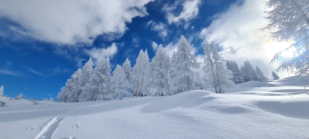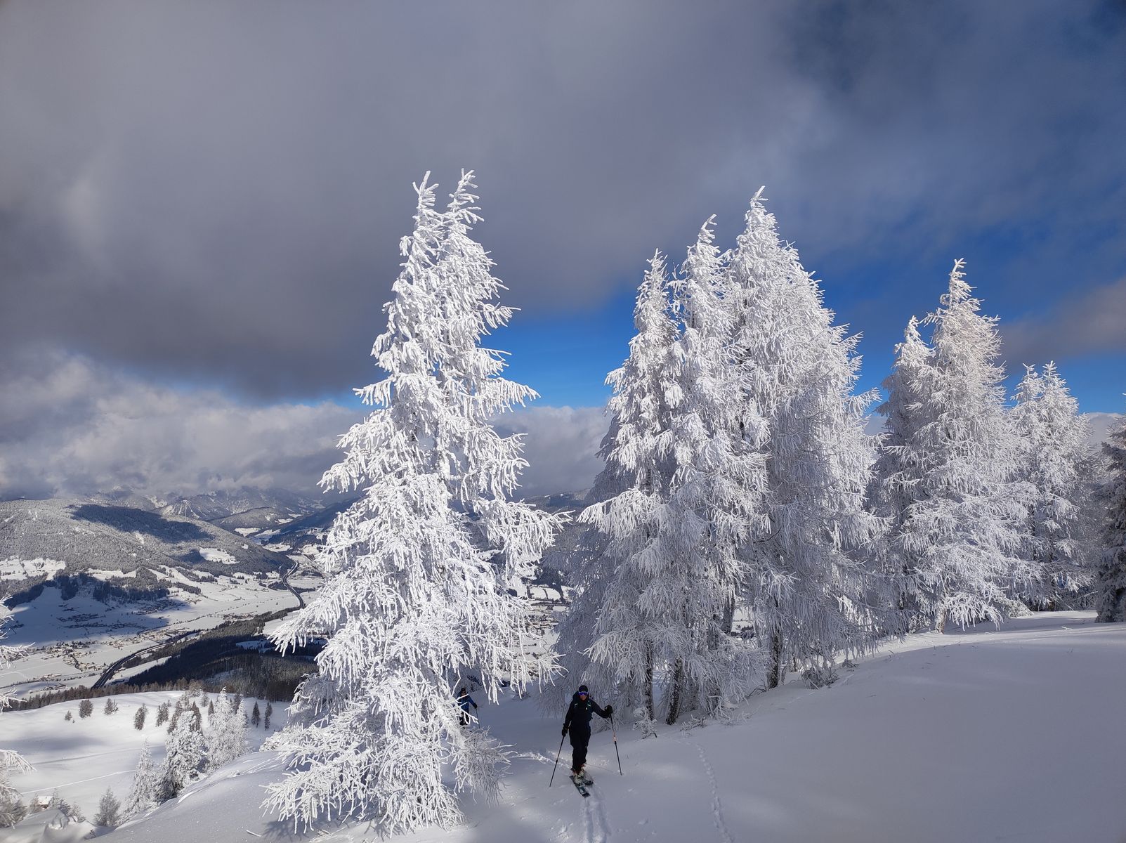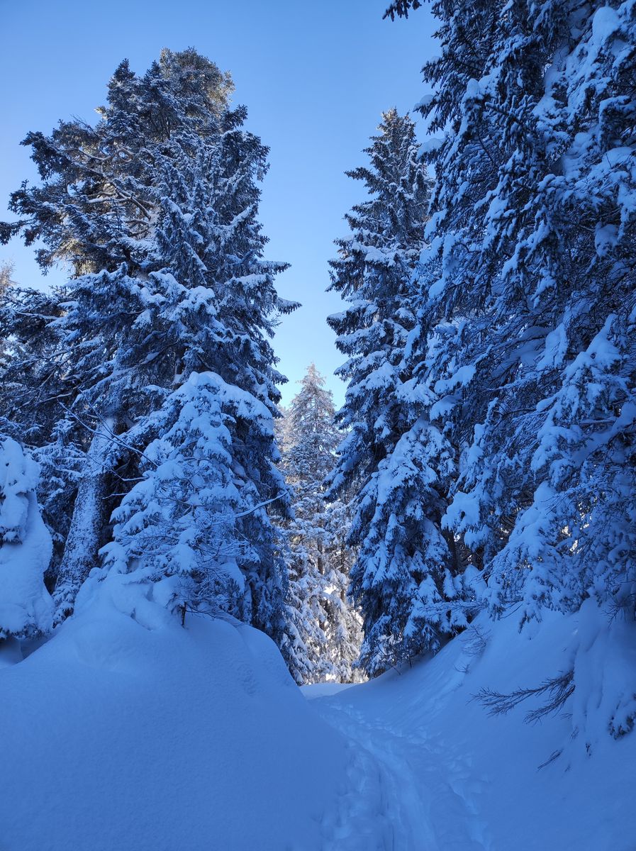 Aber der Reihe nach: Vom PP sind wir zunächst über den Sattelbauern zur Lackenalm und von dort auf den nahen Gupf namens Eibenkopf. Die Abfahrt von diesem ist zwar schön, aber mit 70 Höhenmeter kaum des Abfellens wert. Bis hier war eine Spur von gestern vorhanden, doch der Lackenkogel selbst war noch jungfräulich unberührt, sodass ich in den Genuss kam, den Gipfelanstieg über den Nordwest-Rücken selbst zu spuren. Durch hinreißend malerisch vereisten Lärchenwald geht es unschwierig bis in eine kleine Senke vor dem Gipfelaufbau. Die letzten 100 Hm sind recht steil und der hier befindliche Latschengürtel ist noch nicht ganz eingeschneit, aber schon passabel begeh- und fahrbar. Nach einer ersten eher konservativ gehaltenen Abfahrt im Bereich der Aufstiegsspur zur Lackenalm, haben wir uns immer mehr in die steileren Bereiche der Nordflanke hineingetastet und dabei gewaltig schöne Abfahrten genossen - steile Hänge und Baumslalom - alles bei tiefstem Pulver (1 Meter und mehr). 4 Mal sind wir hoch...