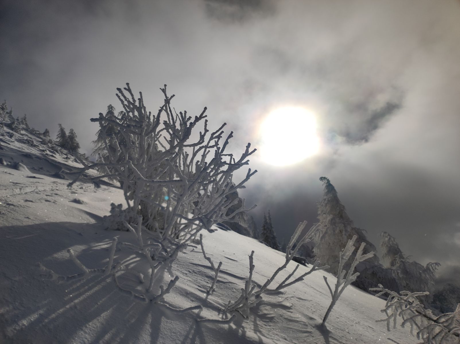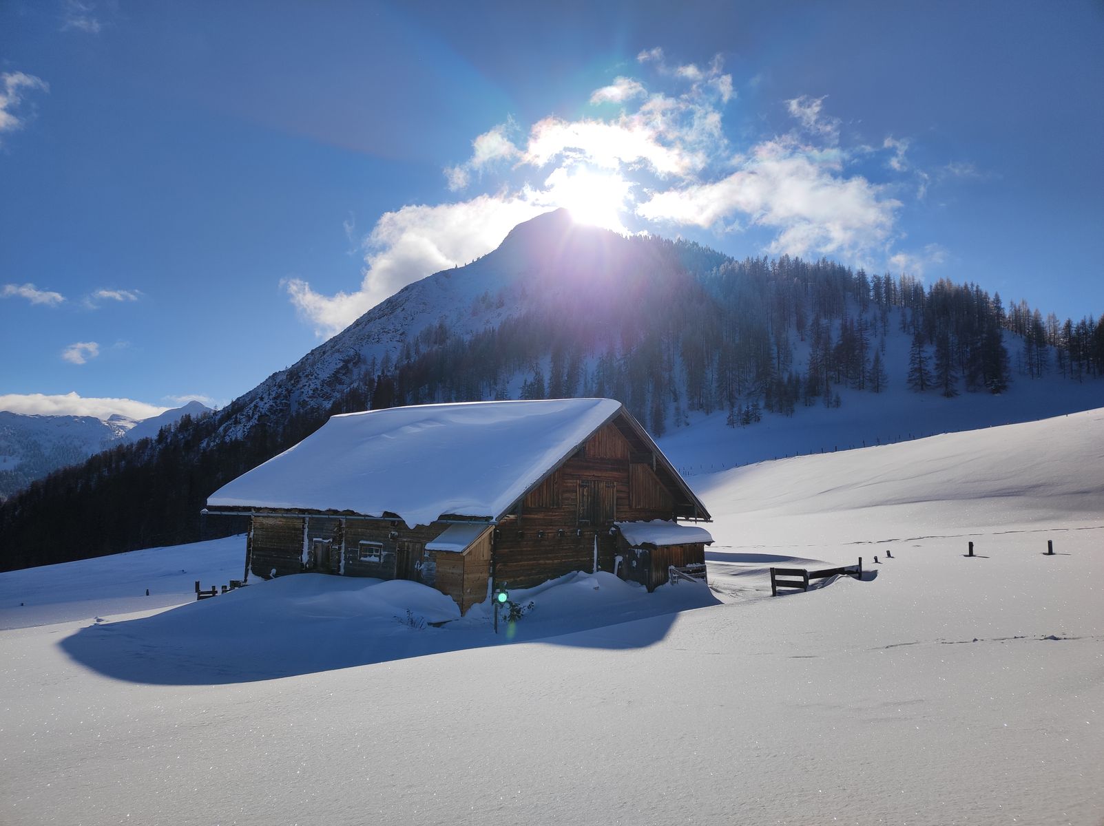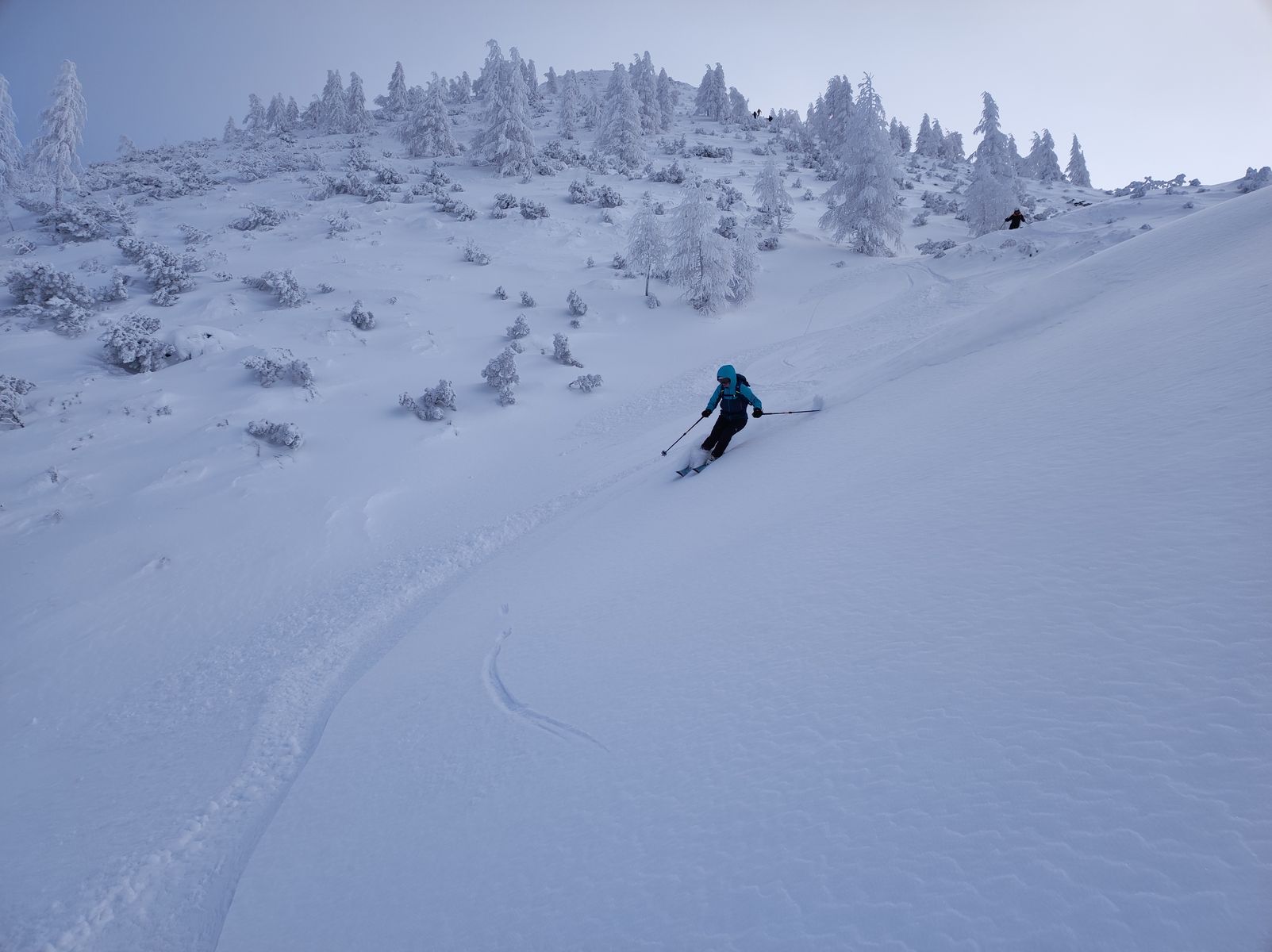 Zur Lawinengefahr: Die licht bewaldete Nordflanke des Lackenkogels lag während der Stürme der vergangenen Tage ganz offensichtlich völlig im Windschatten - der Schnee war maximal fluffig und ungebunden. Ganz im Gegensatz zur Westflanke, die massiv windgeprägt war (wird bei der Tour aber nicht berührt). Ein Bergführer ist mit seiner Gruppe sogar die noch steilere Nordrinne gefahren. Wichtig: Ich war heute das erste Mal hier und kann daher natürlich nicht behaupten, dass die Nordflanke generell windgeschützt und somit sicher ist! Das muss jeder Tourengeher an jedem Tag wieder auf´s Neue für sich entscheiden.