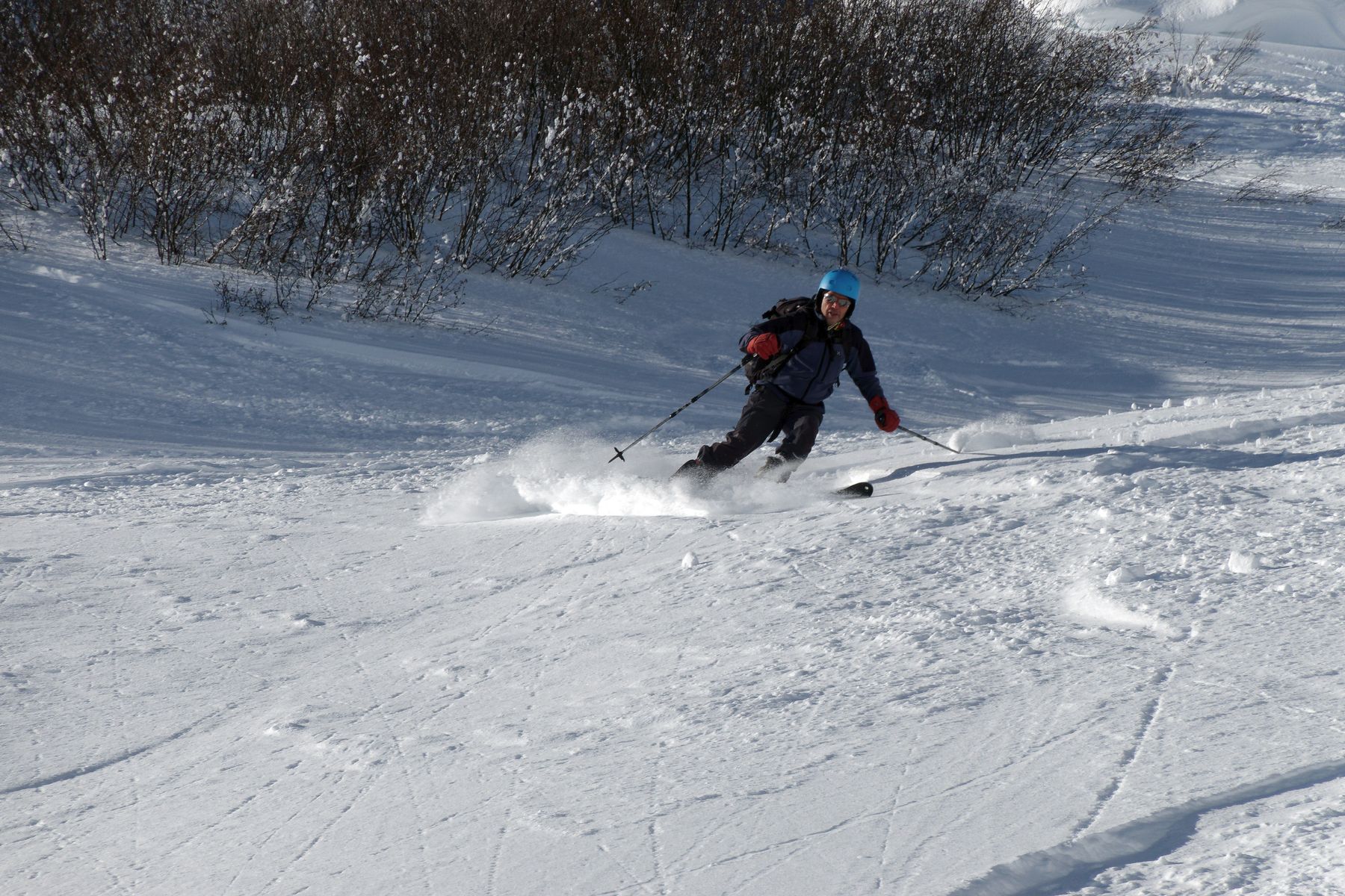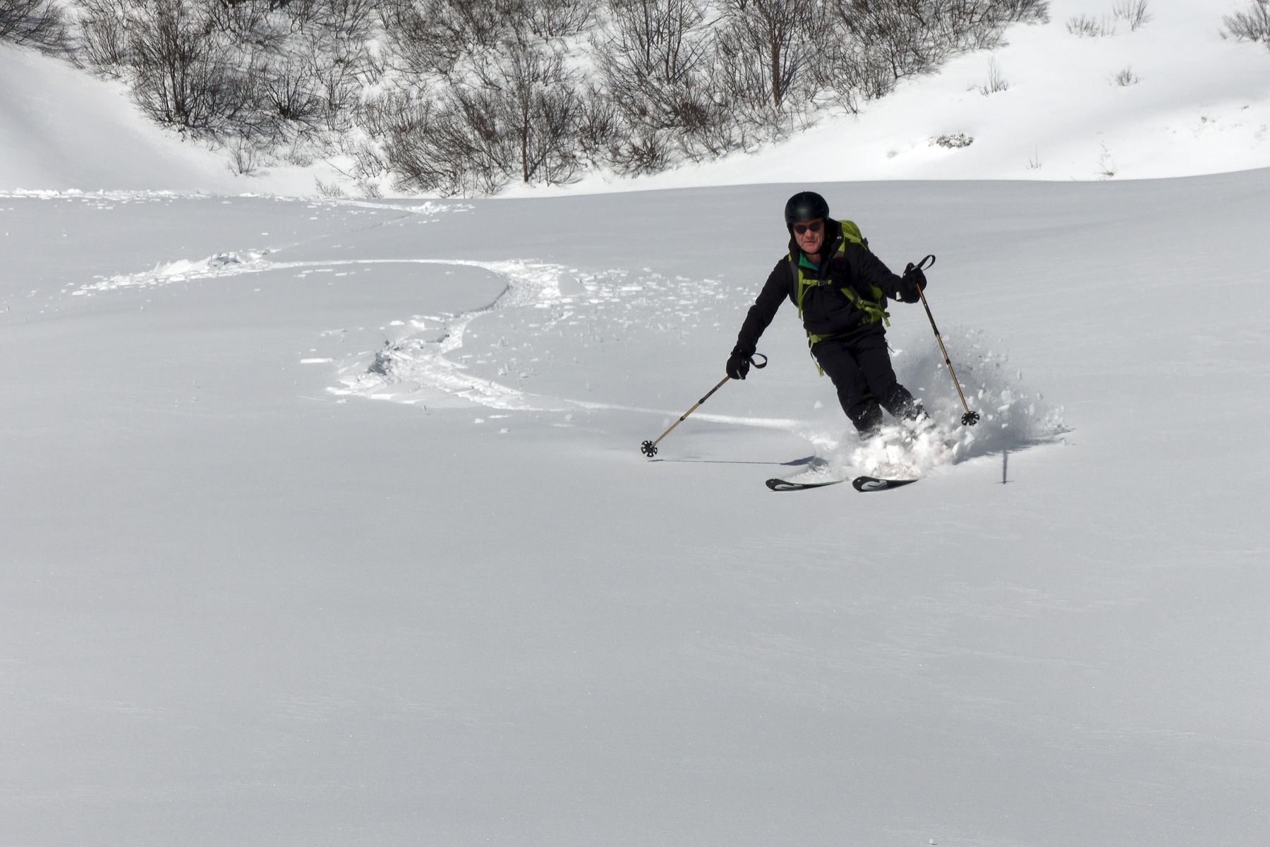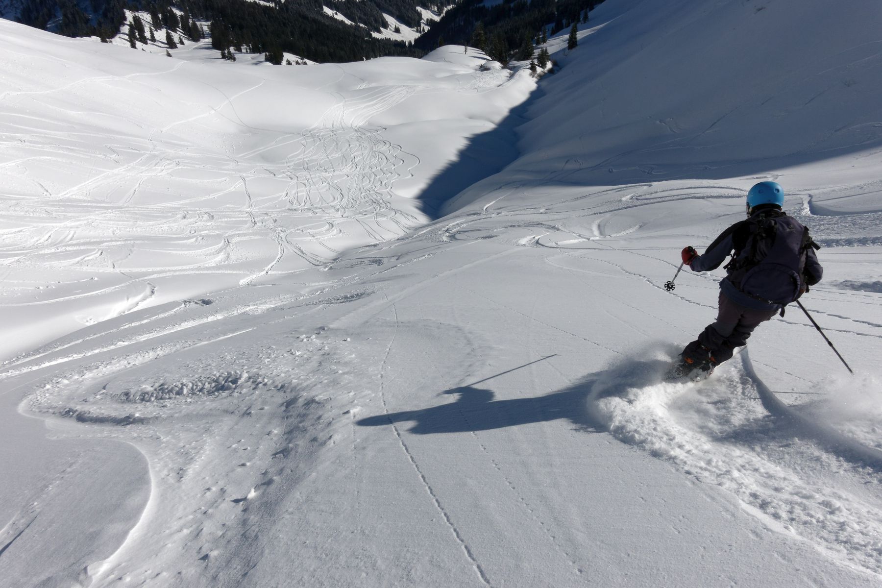 Guter Schnee ab Parkplatz Grasgehren. Schöne Abfahrt im Pulver bis zur Bolgentalalpe. Südseitig schon beginnender Firn.