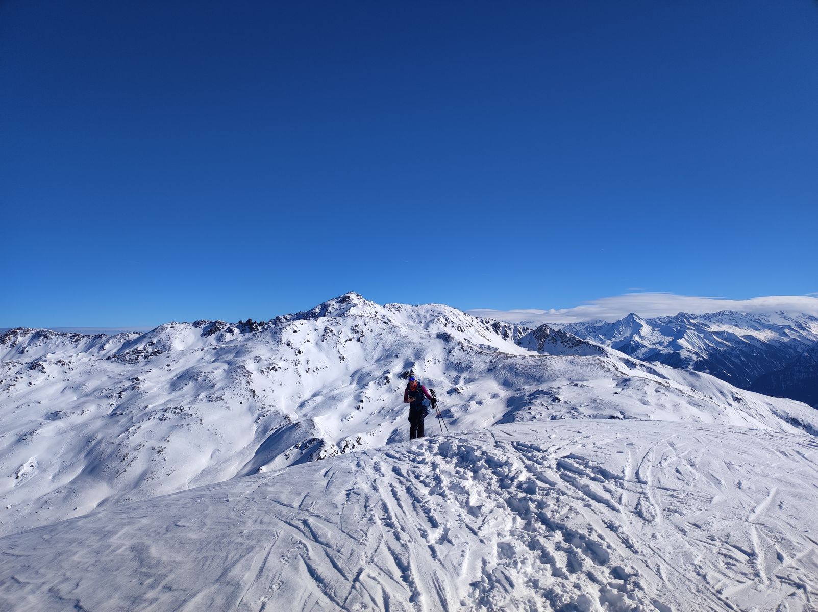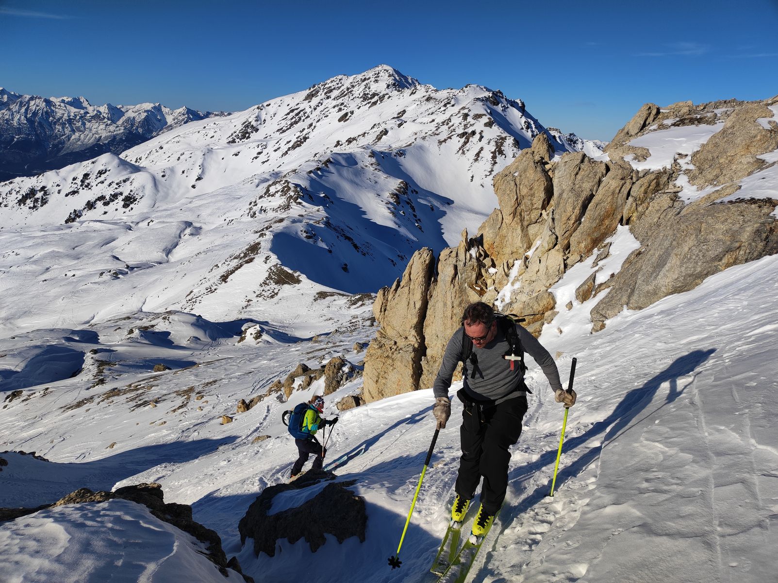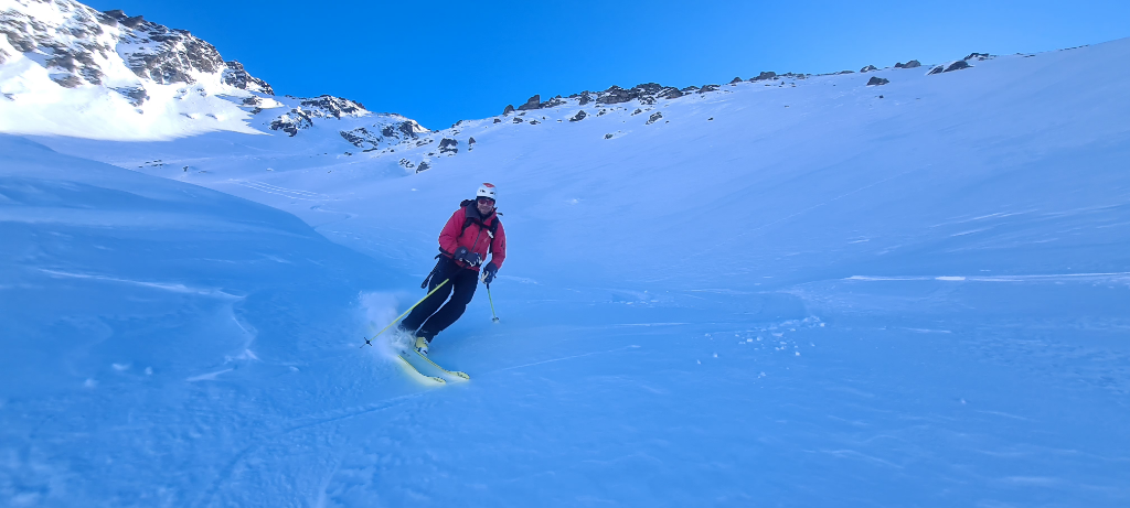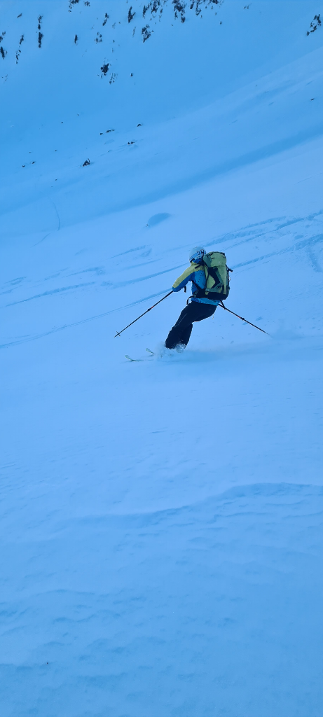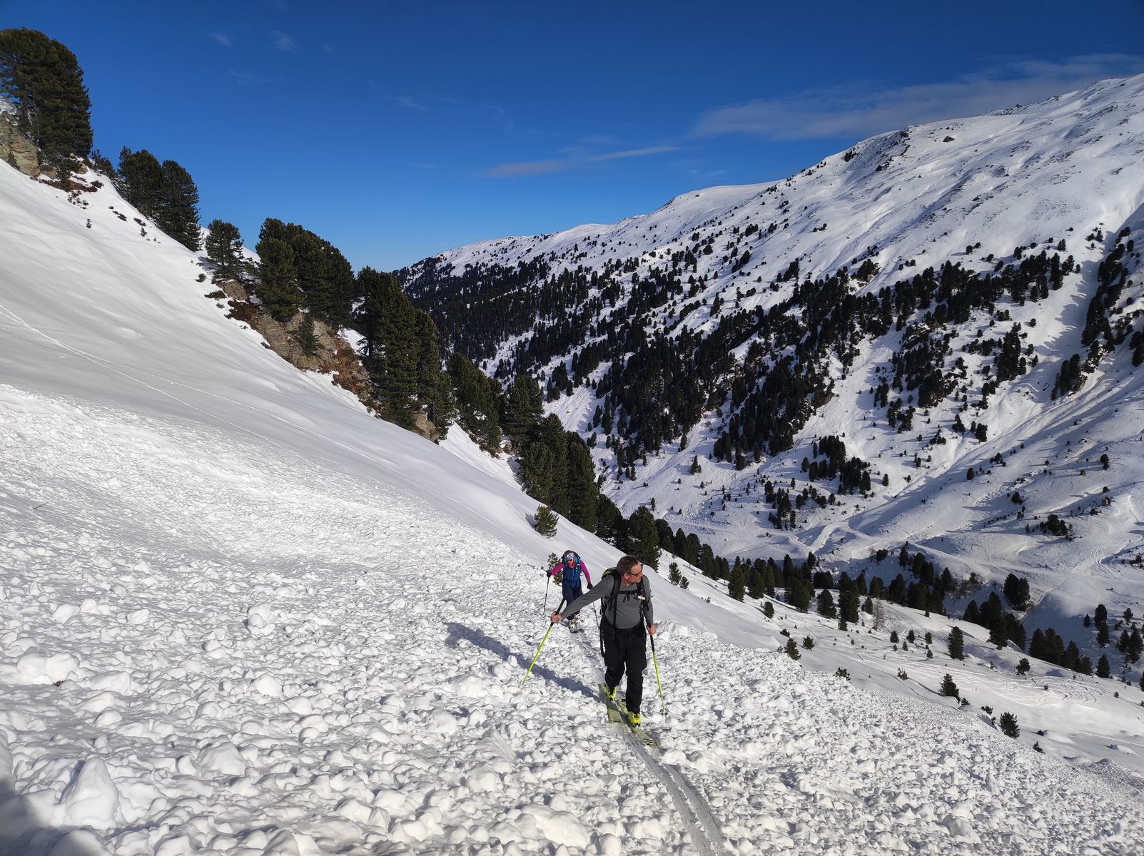 Nach einer kurzen Pause sind wir dann weiter zum Hippold, dessen felsige Gestalt sich letztlich deutlich leichter bestiegen lässt als man zunächst annehmen könnte. Die oberen 200 Höhenmeter ab dem Krovenzjoch sind aber stark abgeblasen (wie fast immer). Nach einer schönen Abfahrt, die nur unterhalb von 2000 Metern recht harschig war, ist ein etwa 30 minütiger Gegenanstieg zur Weidener Hütte nötig, um die Rodelbahn zu erreichen, auf der es dann flott hinunter geht.