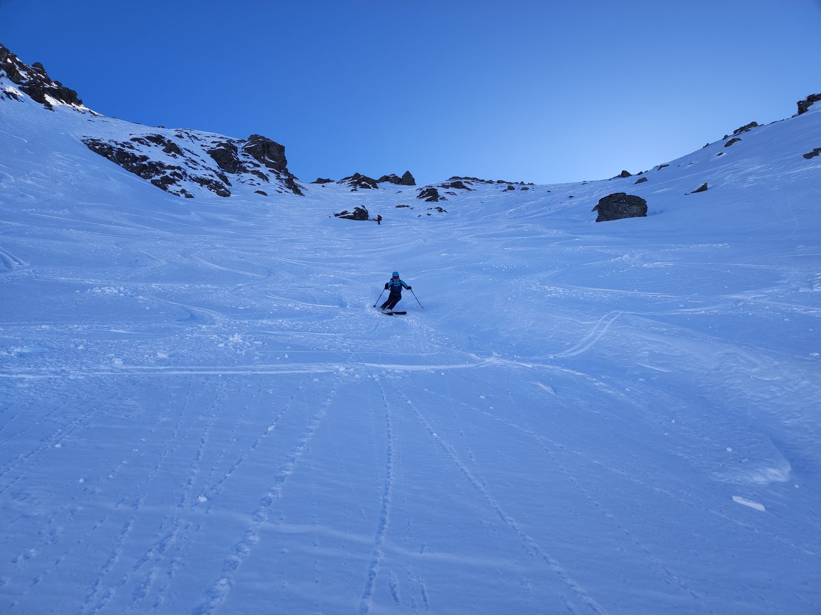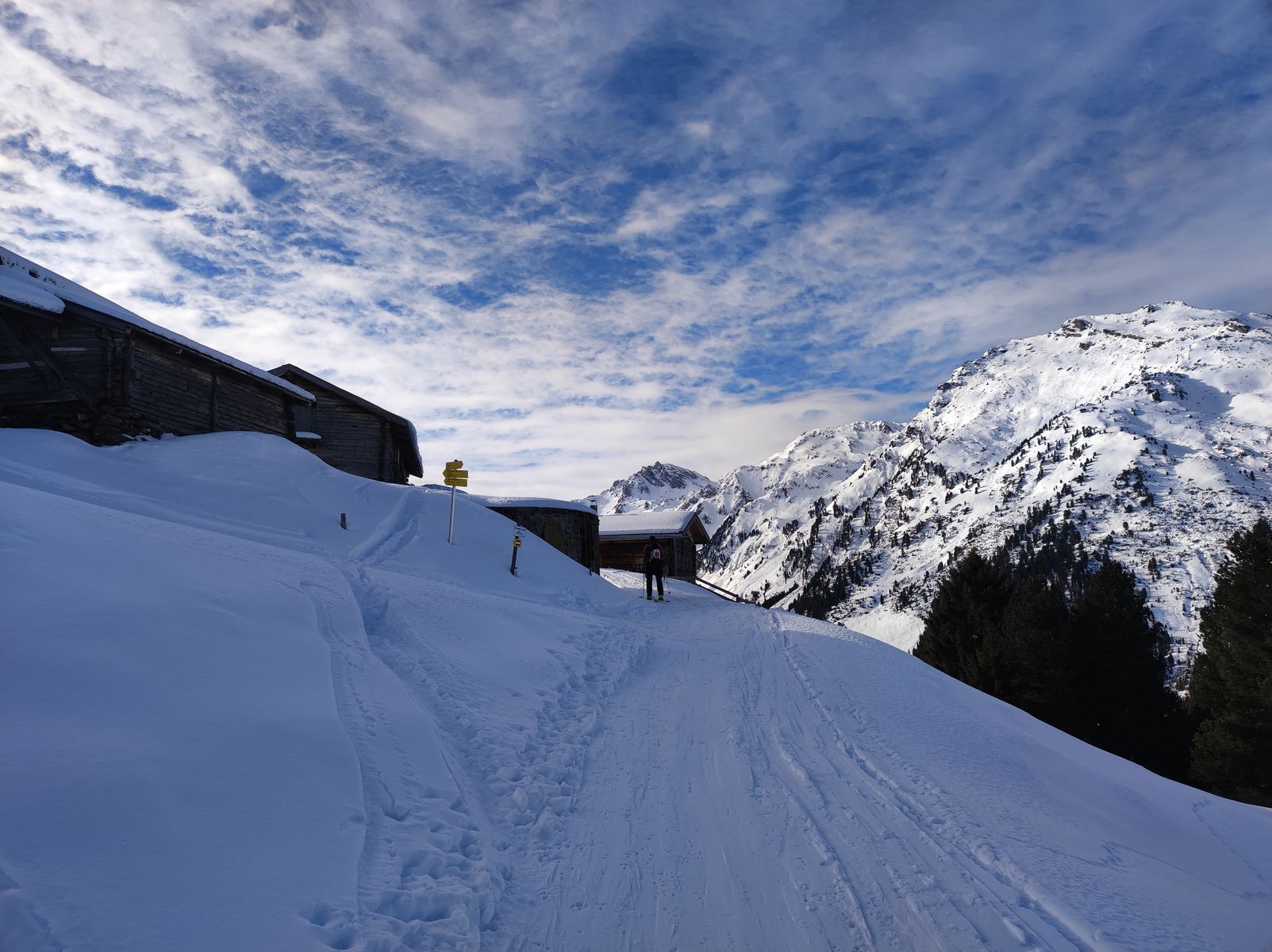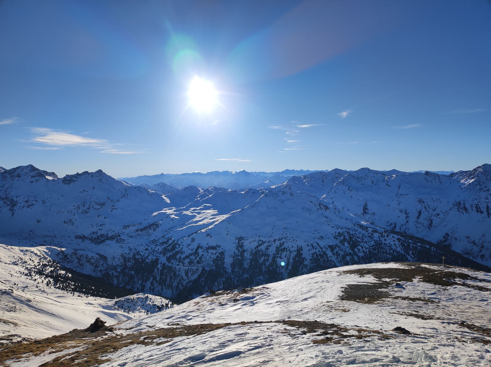 Nach einer kurzen Pause sind wir dann weiter zum Hippold, dessen felsige Gestalt sich letztlich deutlich leichter bestiegen lässt als man zunächst annehmen könnte. Die oberen 200 Höhenmeter ab dem Krovenzjoch sind aber stark abgeblasen (wie fast immer). Nach einer schönen Abfahrt, die nur unterhalb von 2000 Metern recht harschig war, ist ein etwa 30 minütiger Gegenanstieg zur Weidener Hütte nötig, um die Rodelbahn zu erreichen, auf der es dann flott hinunter geht.