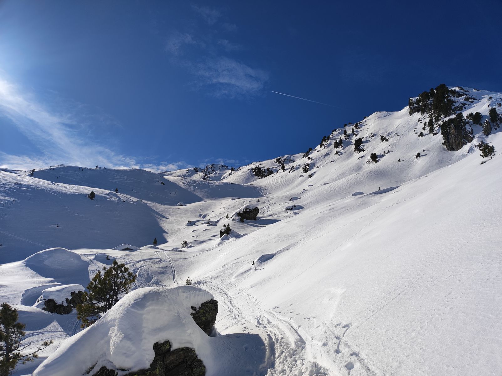War heute (wie eigentlich immer) unser Motto - und das ist uns bis auf den etwas späten Start um 9 in Innerst, wo wir gerade noch einen der letzten PP ergattern konnten, auch vollauf gelungen. Zunächst sind wir zur Weidener Hütte; Tipp: Ich gehe hierher gerne über die Hochsinn- und die Fiderissalm, was zwar einen kleinen Umweg bedeutet, aber viel schöner ist als die monotone Rodelbahn. Anschließend ging es über den sonnigen Ost-Anstieg schweißtreibend zum Hobarjoch, über dessen herrliche Nordwestmulde wir anschließend im Pulver ins Grafental hinabwedelten. Wird diese Abfahrt schon relativ selten befahren (vielleicht 10 Spuren), ist es im Grafental trotz der herrlichen Skihänge und der extrem vielfältigen Möglichkeiten (Hirzer-Ostrinne, Almkogel, Grafenspitze um nur ein paar zu nennen) eigentlich immer völlig einsam. Wir haben heute, am schönsten Sonntag hier niemanden getroffen, sondern nur zwei andere Leute aus großer Entfernung beobachtet. Dies liegt natürlich daran, dass es schon eines gewissen konditionellen Aufwands bedarf, um allein schon dorthin zu gelangen.