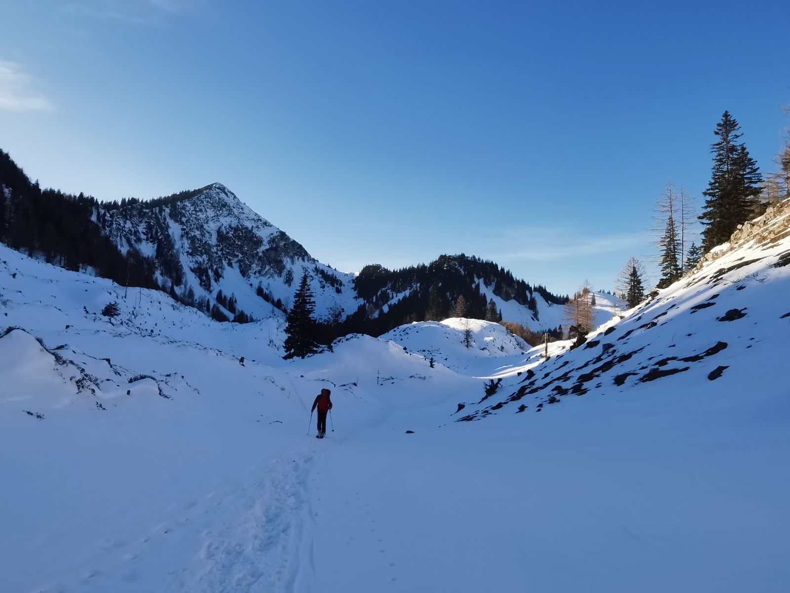 Tag 3: Aufstieg über Skipiste zum Vogelsang, Abfahrt zur Rosengasse-Aufstieg über Rosengassenalm Richtung Fellalmjoch (steil Achtung Wildschongebiet), Abfahrt zur Seeonalm (kurz, bescheiden) und Auf/Abstieg zum Brünnsteinhaus. Letze Abfahrt über die Rodelpiste bis Rechenau dann beginnen Steine und eisige Stellen bzw Tragen bis zum Parkplatz Mühlau - von dort zu Fuss (kein Bus und leider hat uns keiner mitgenommen) bis zum Bahnhof Oberaudorf (ca 3km)