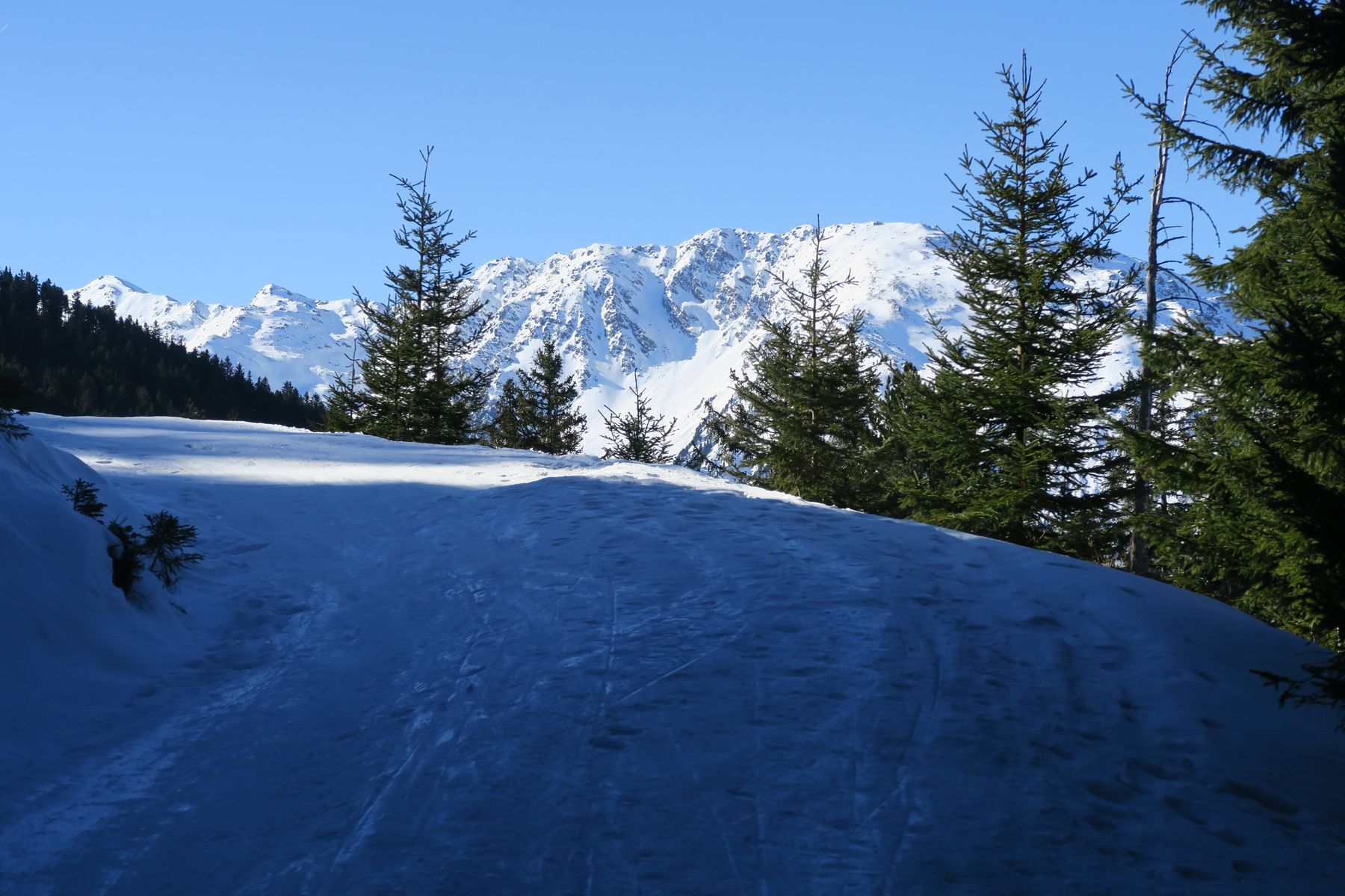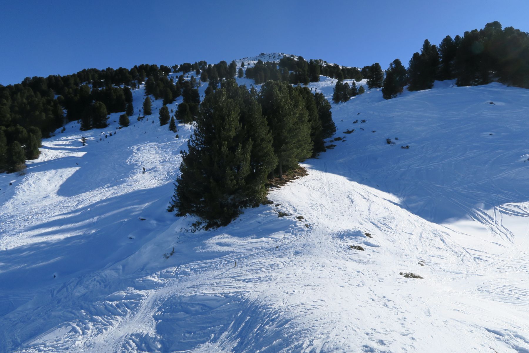 Die Schneelage im Waldbereich genügt nur für die Forststraße, erst weiter oben kann man einmal durch den Wald abkürzen, ehe man dann freies Gelände erreicht. Forststraße hart und überwiegend griffig, wenige Stellen auch eisig. Erstaunlicherweise ist der Schnee auf der Straße trotz der milden Witterung nicht aufgegangen (13 Uhr). Offenbar war es schon mal wärmer, denn es gab auch einige glasige Stellen. Im Almgelände sind die Hauptabfahrtsrouten pistenmäßig eingefahren und hart, aber griffig. Daneben total zerfahrener und oft gepresster Pulver - sehr unregelmäßig, zum Skifahren nicht der Hit, aber ich habe es auch schon viel schlechter erwischt. Bild 2 gibt ganz gut über die Schneequalität Auskunft.