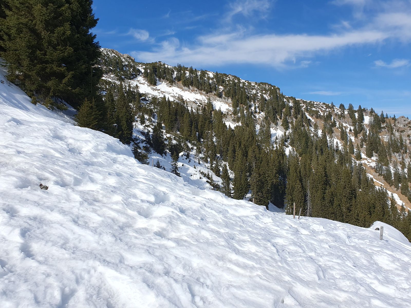 Ab Wegspinne im Flachen geradeaus an den Langenthalhäusern vorbei und im Waldstück geradeaus (also nicht links über die Bachsenke im Schatten) auf den Sonnenhang. Alles gut machbar ohne Harscheisen, leider viel zertappt durch Fußgänger.