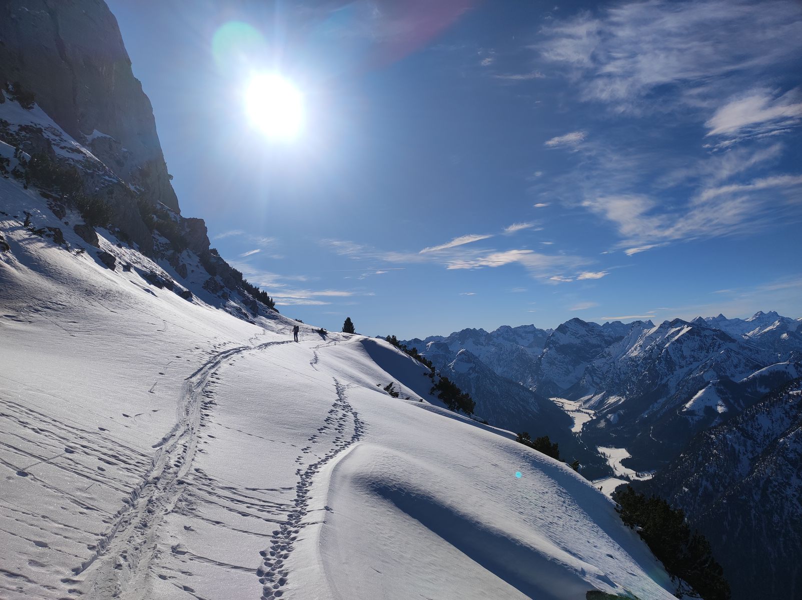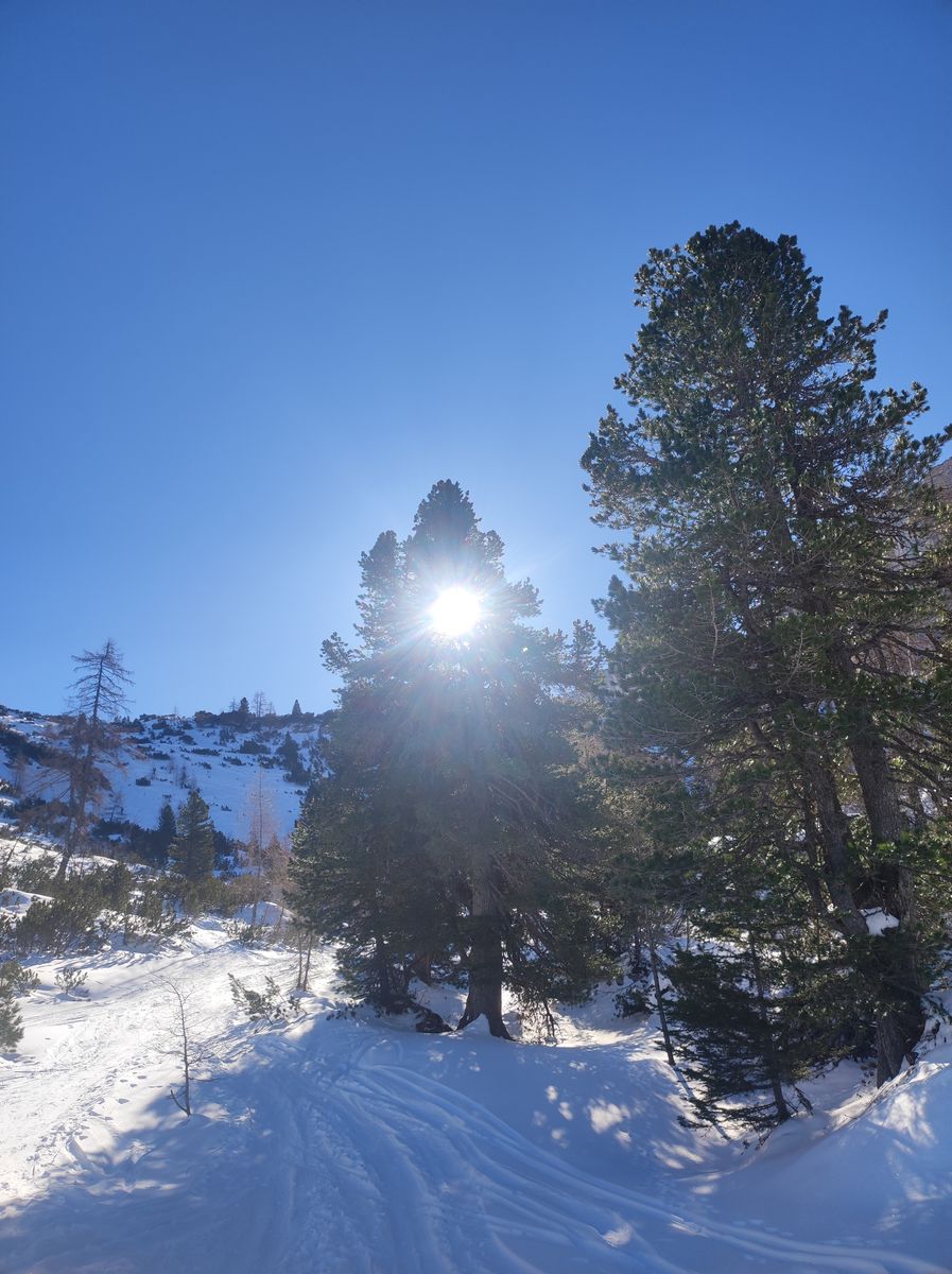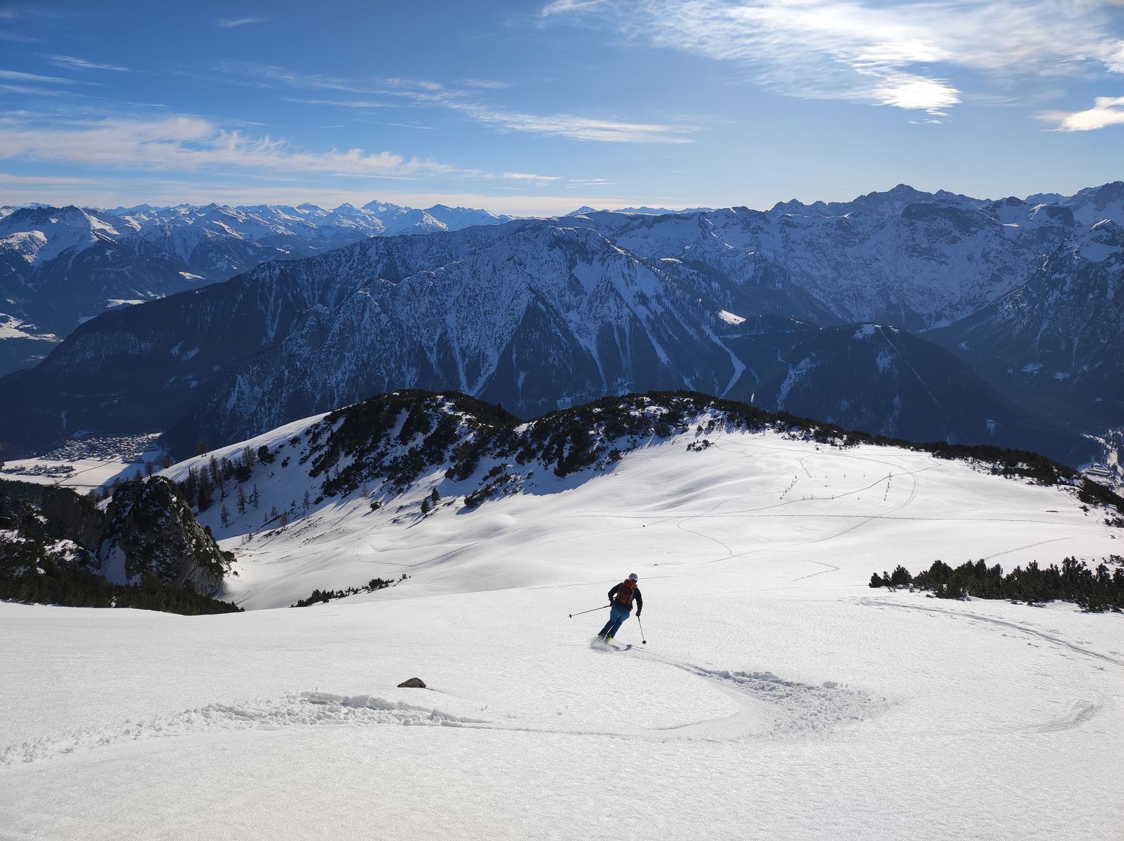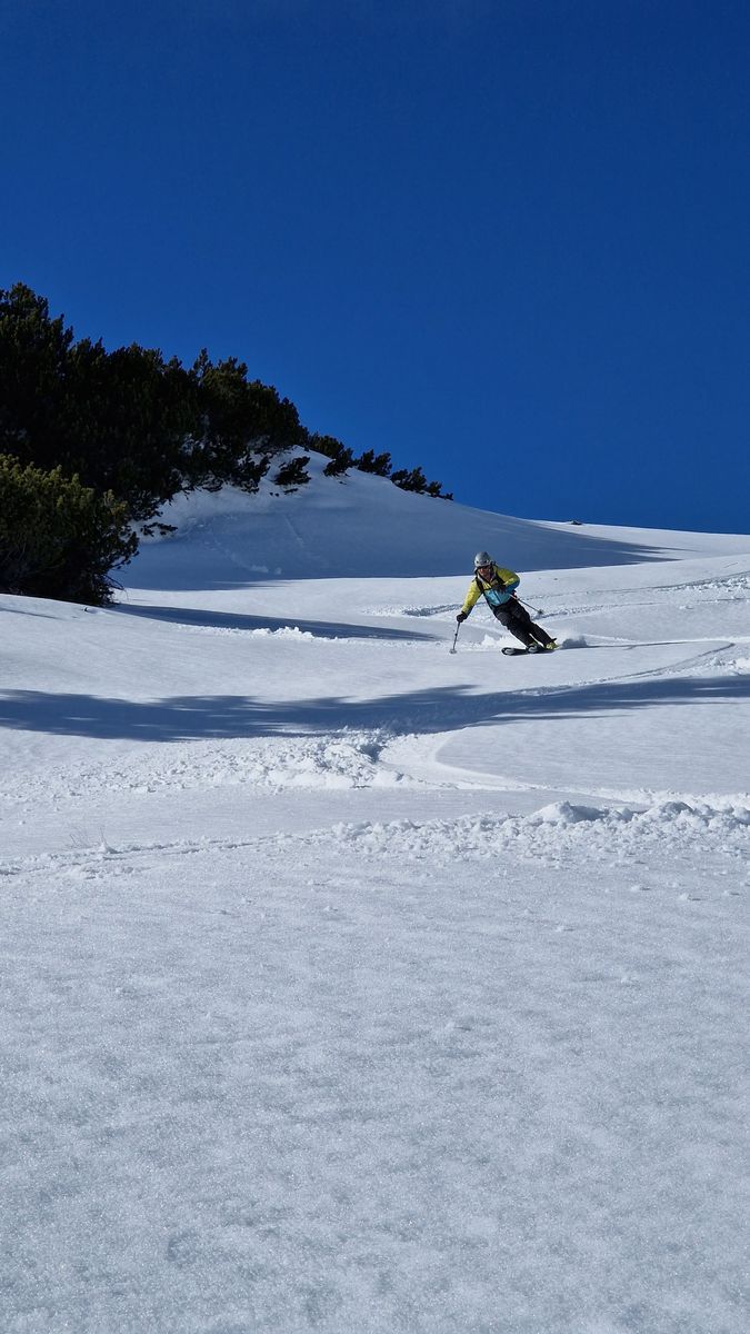 Mit reichlich Verspätung aufgrund vergessener essentieller Ausrüstungsgegenstände sind wir heute um 10 Uhr am PP gestartet und haben dabei dann im Nachhinein betrachtet vom Zeitmanagement her doch alles richtig gemacht, um den perfekten Firn zu bekommen. Anders als am Dienstag, wo ich auch schon am Kotalmjoch unterwegs war, war es heute morgen nämlich leicht bewölkt, was den Auffirnzeitpunkt etwas nach hinten verschoben hat. Ebenfalls am Dienstag war mir auch die Idee mit der Klobenjoch-Reibn gekommen (eine Tour, für die es meiner Recherche nach keine Beschreibungen - weder analog noch digital gibt). Ich hatte dann noch das Glück, (am Dienstag) einem Skitouren-Veteranen mit schwer stollenden Fellen zu begegnen, dem ich meinen Wachsblock zur Verfügung stellte und der mir im Gespräch dann sagte, dass er diese Tour kenne und mir wertvolle Tipps gab.